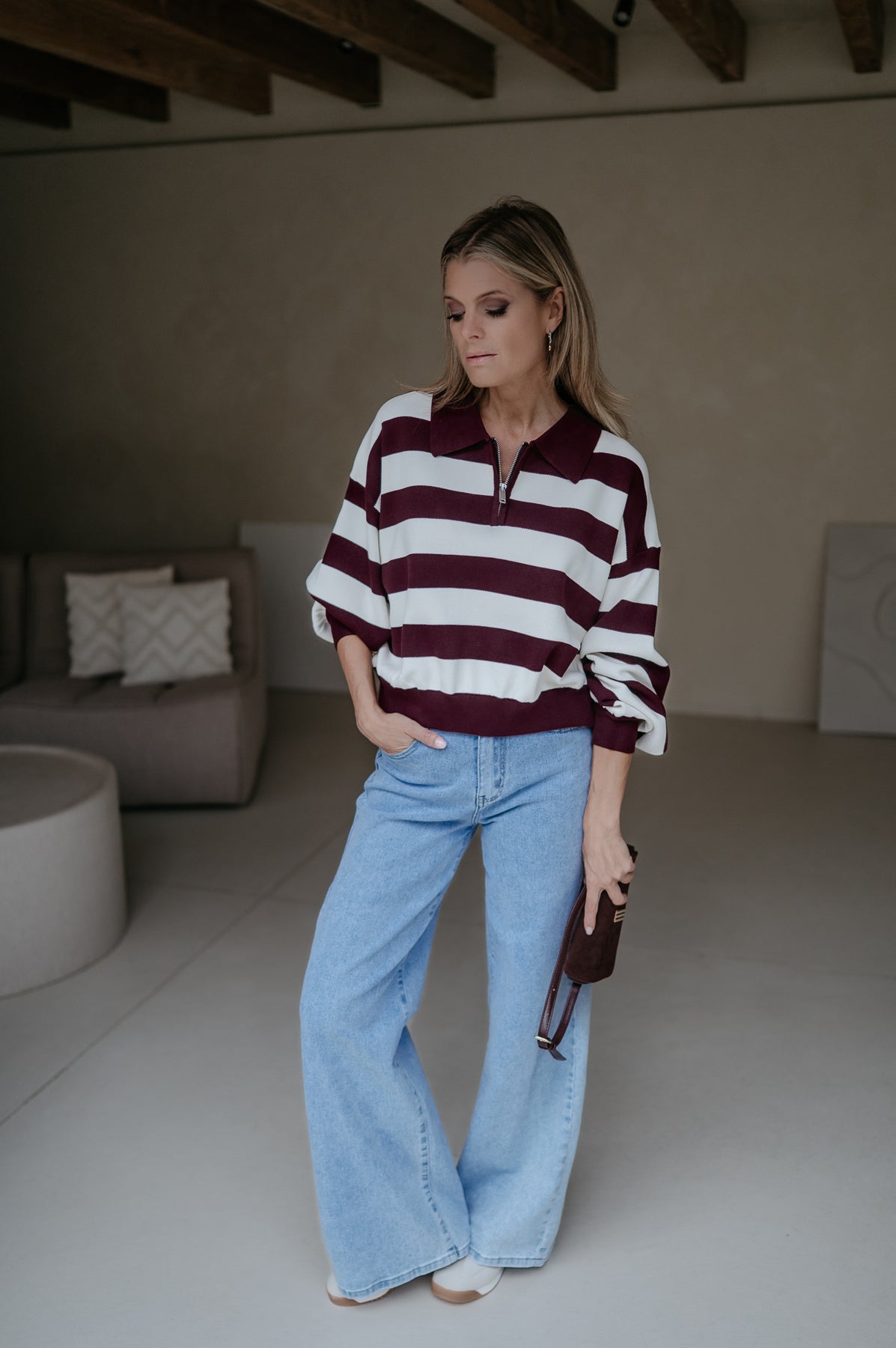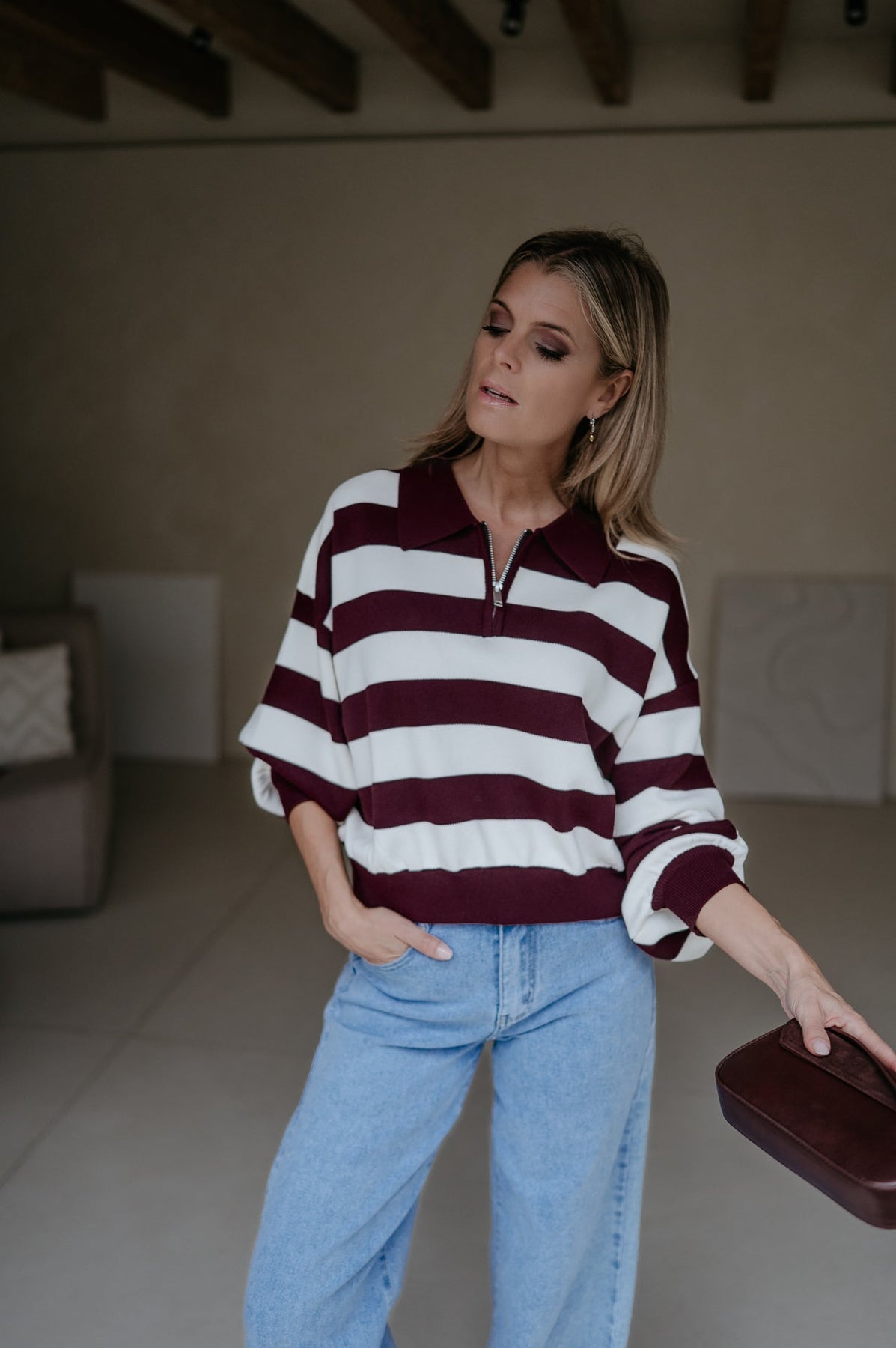 Deze mega leuke trui met witte en burgundy strepen heeft een sportieve polo kraag met een kort ritsje voor een casual-chique look.