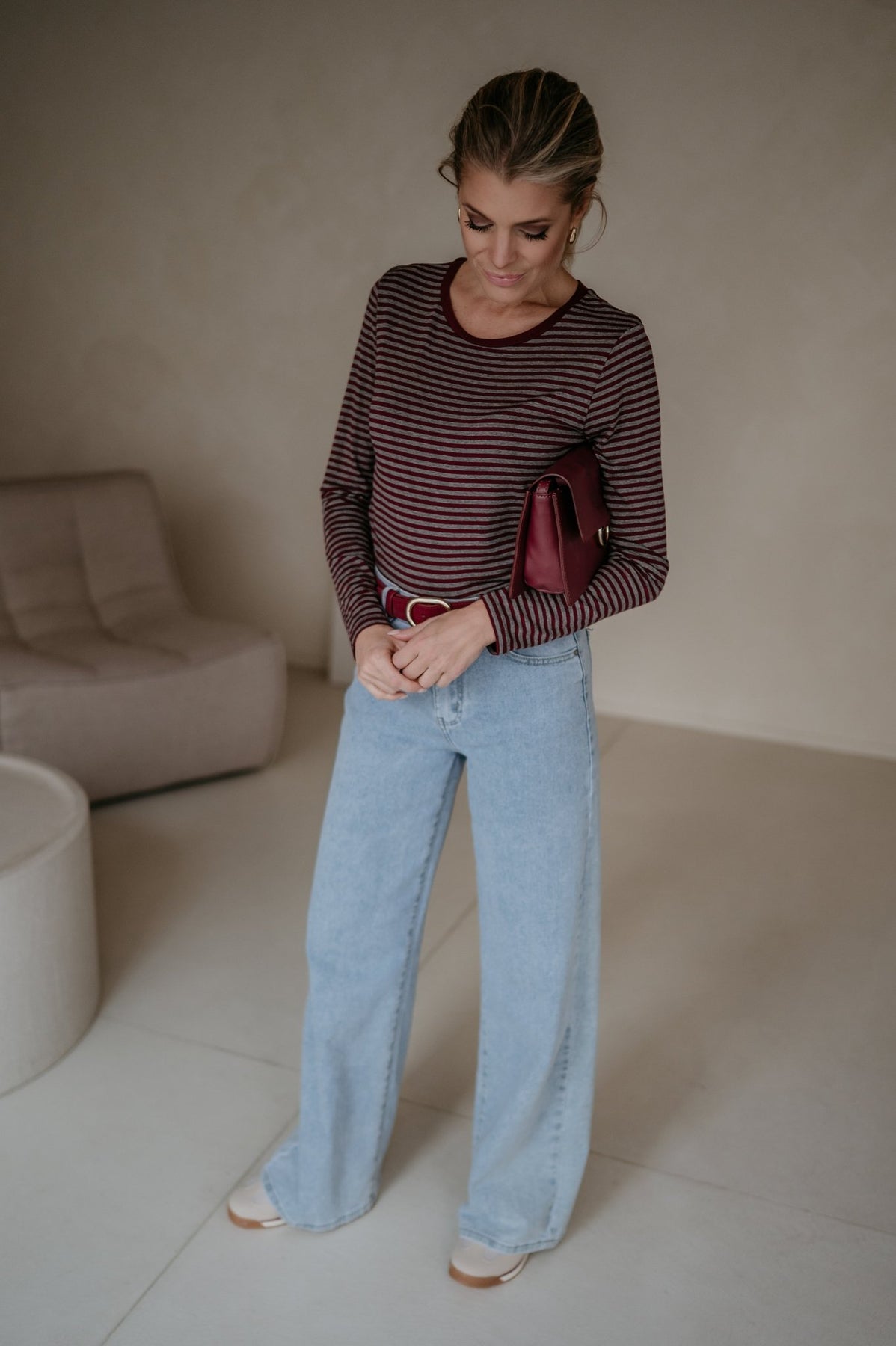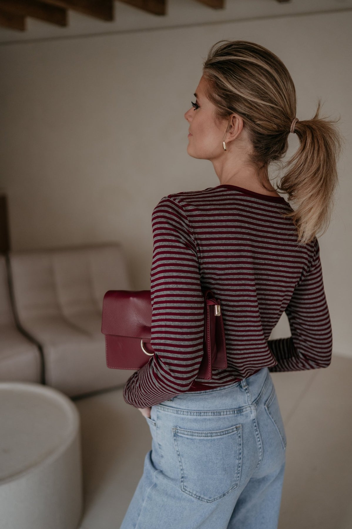 Heel toffe longsleeve met bordeaux en grijze streepjes, ideaal voor een casual maar stijlvolle look.