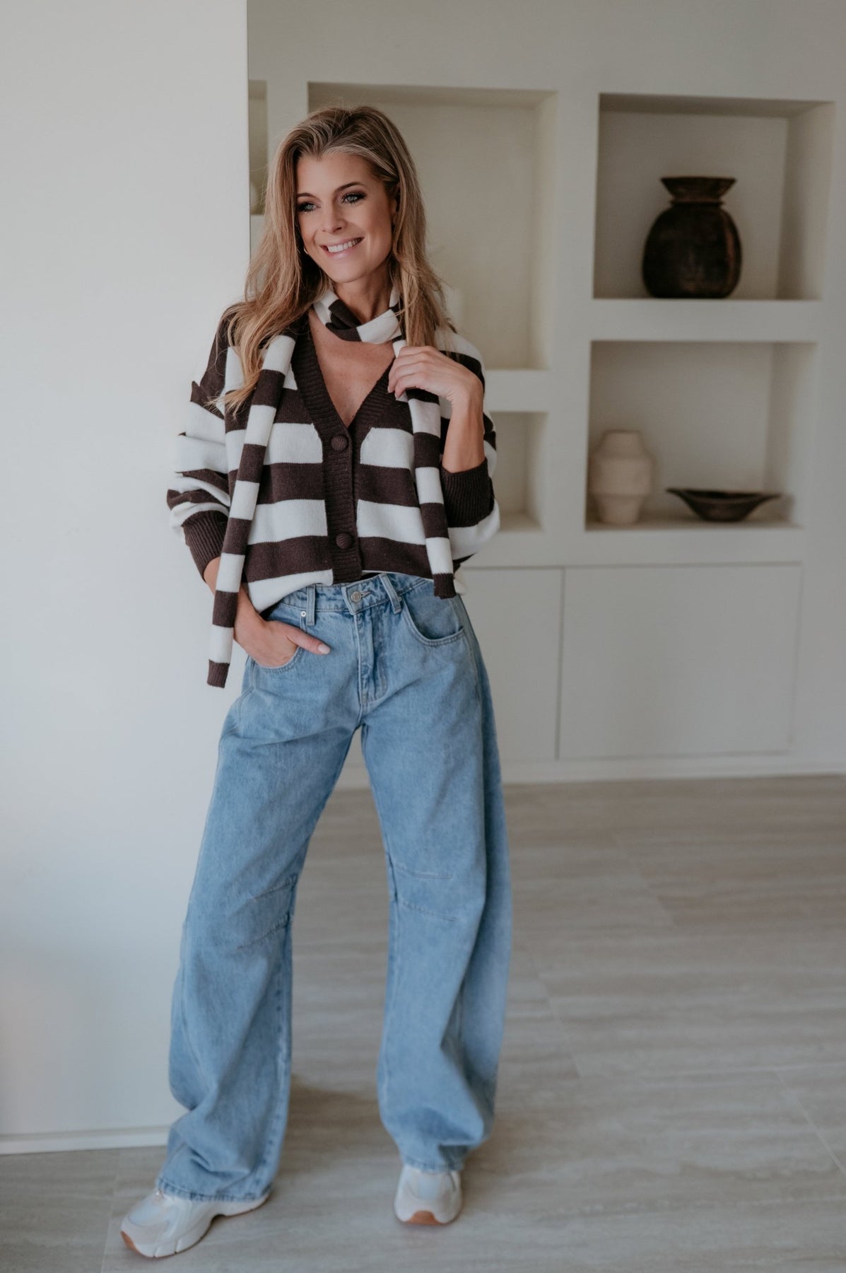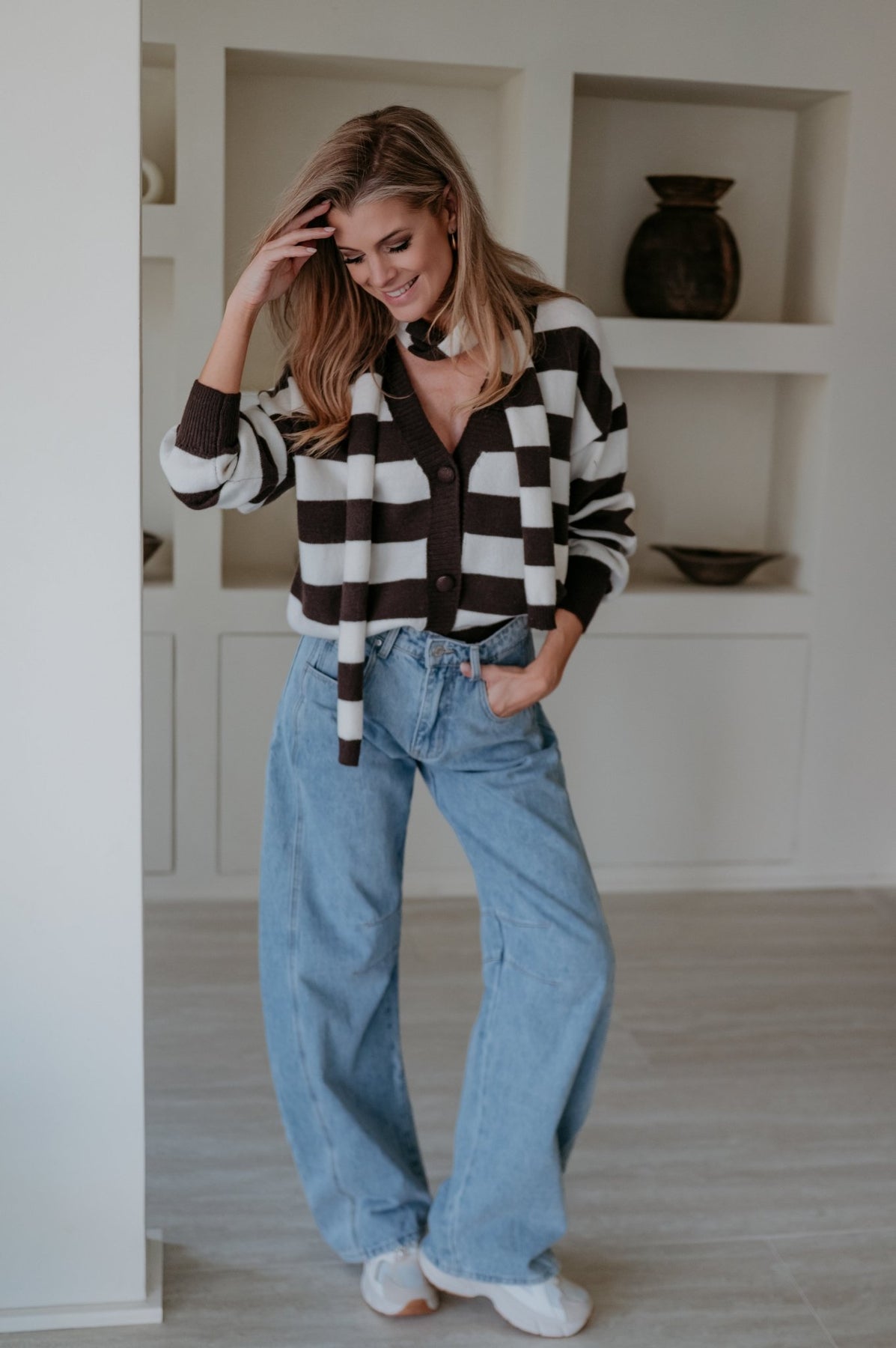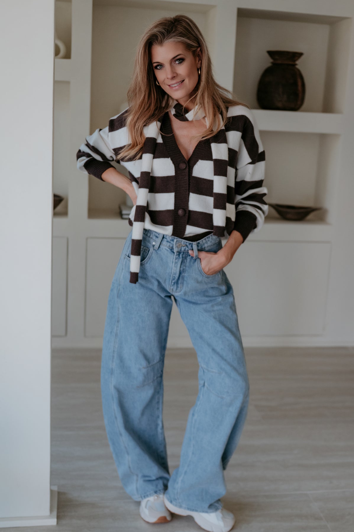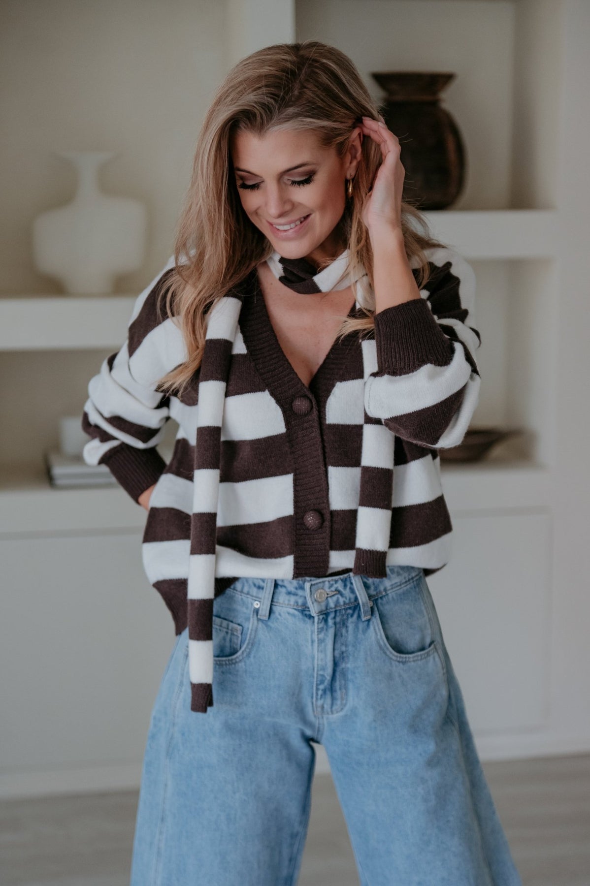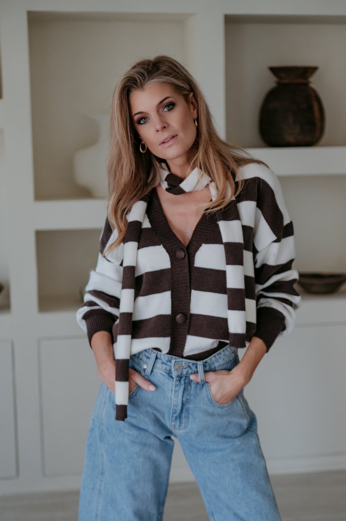 Deze prachtige cardigan met V-hals en strepen is een echte eyecatcher.