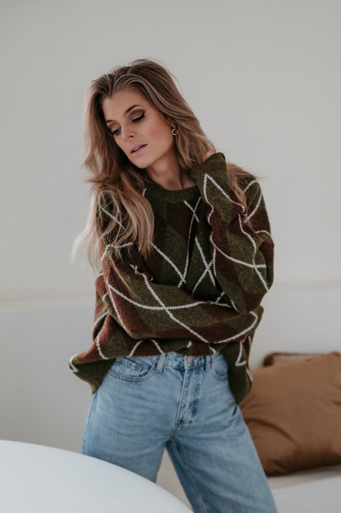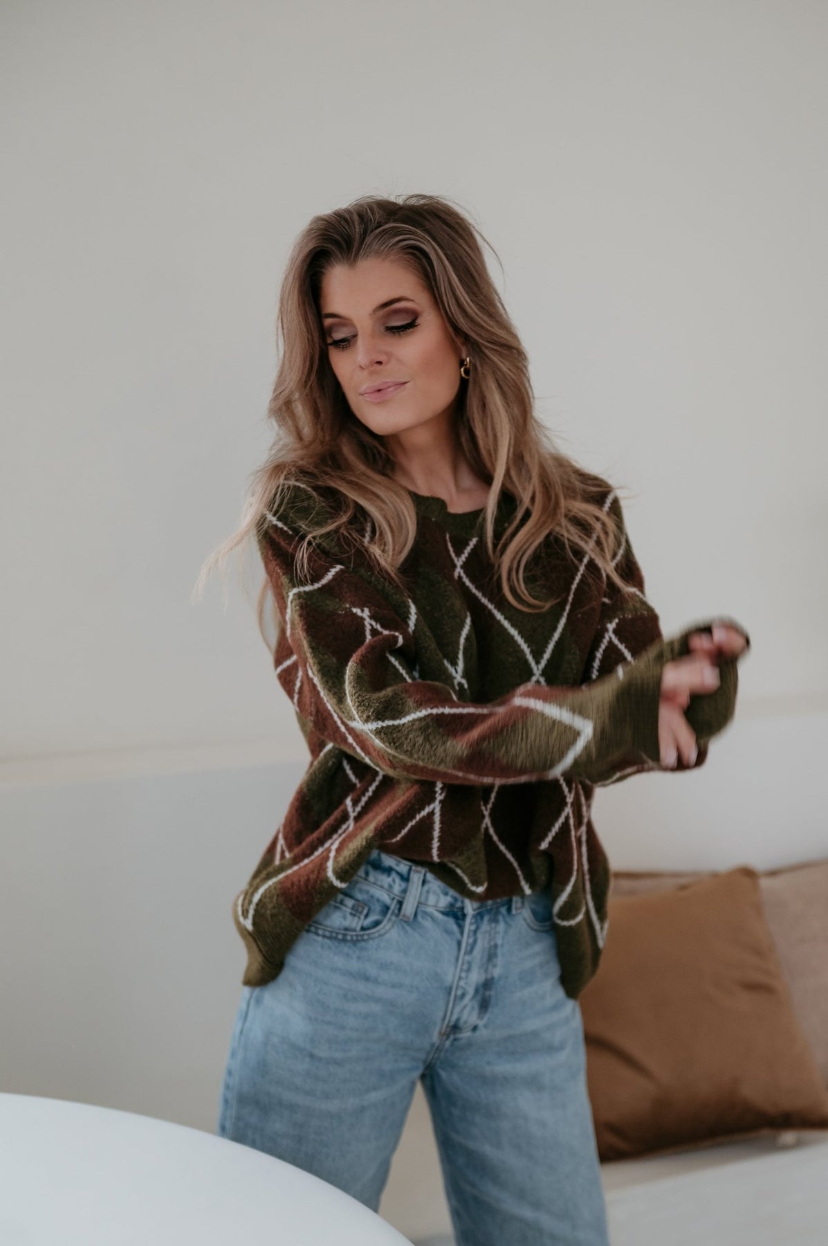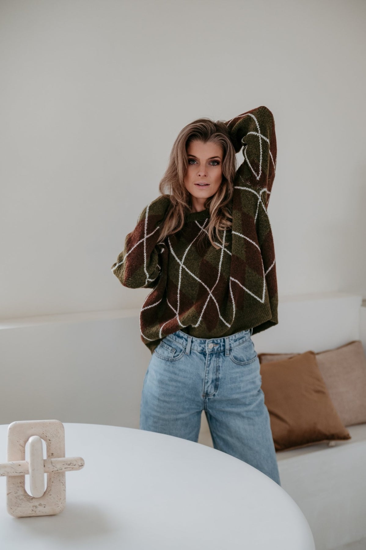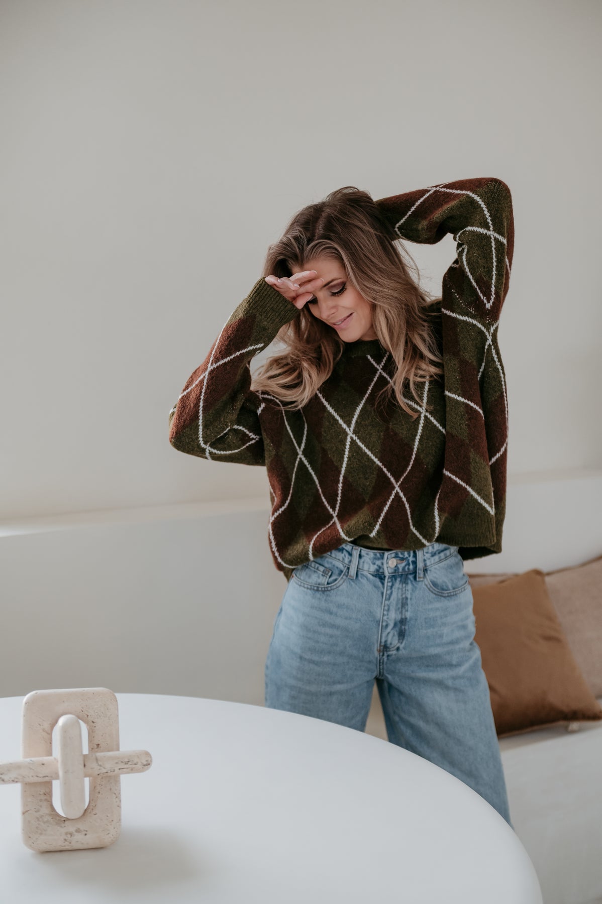 Deze mega toffe bruine trui met khaki kleurige ruiten is een echte eyecatcher voor je wintergarderobe.