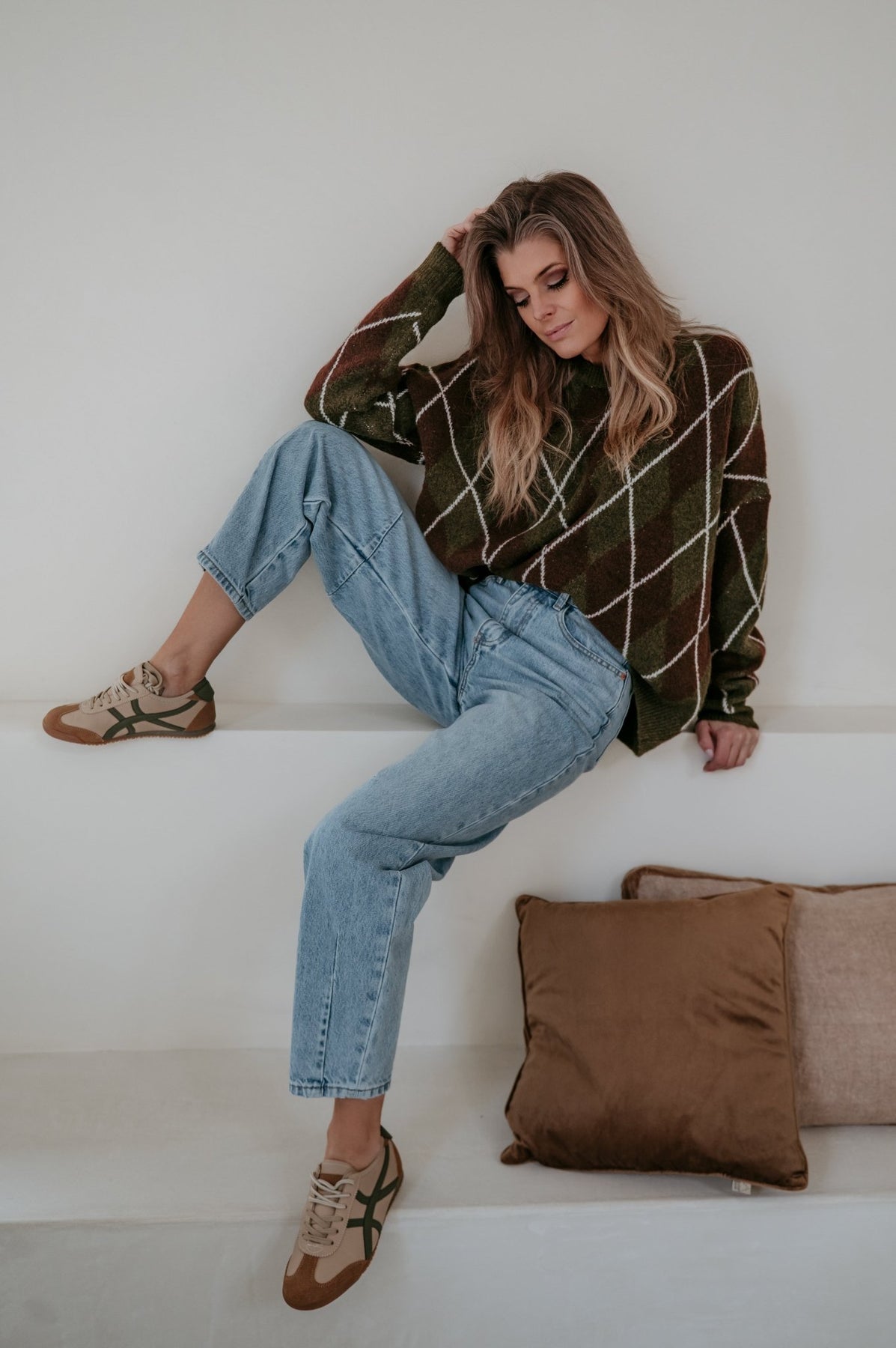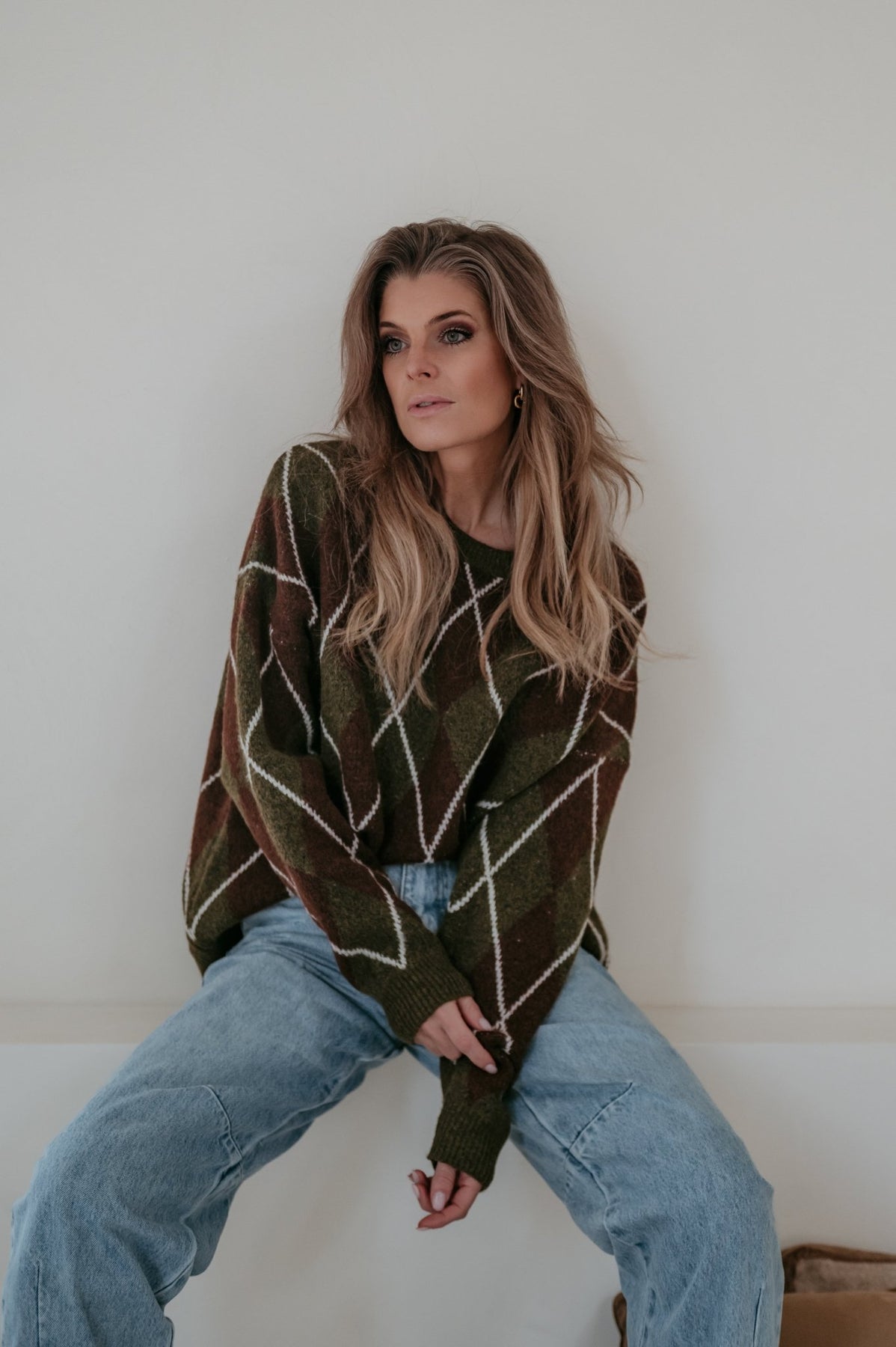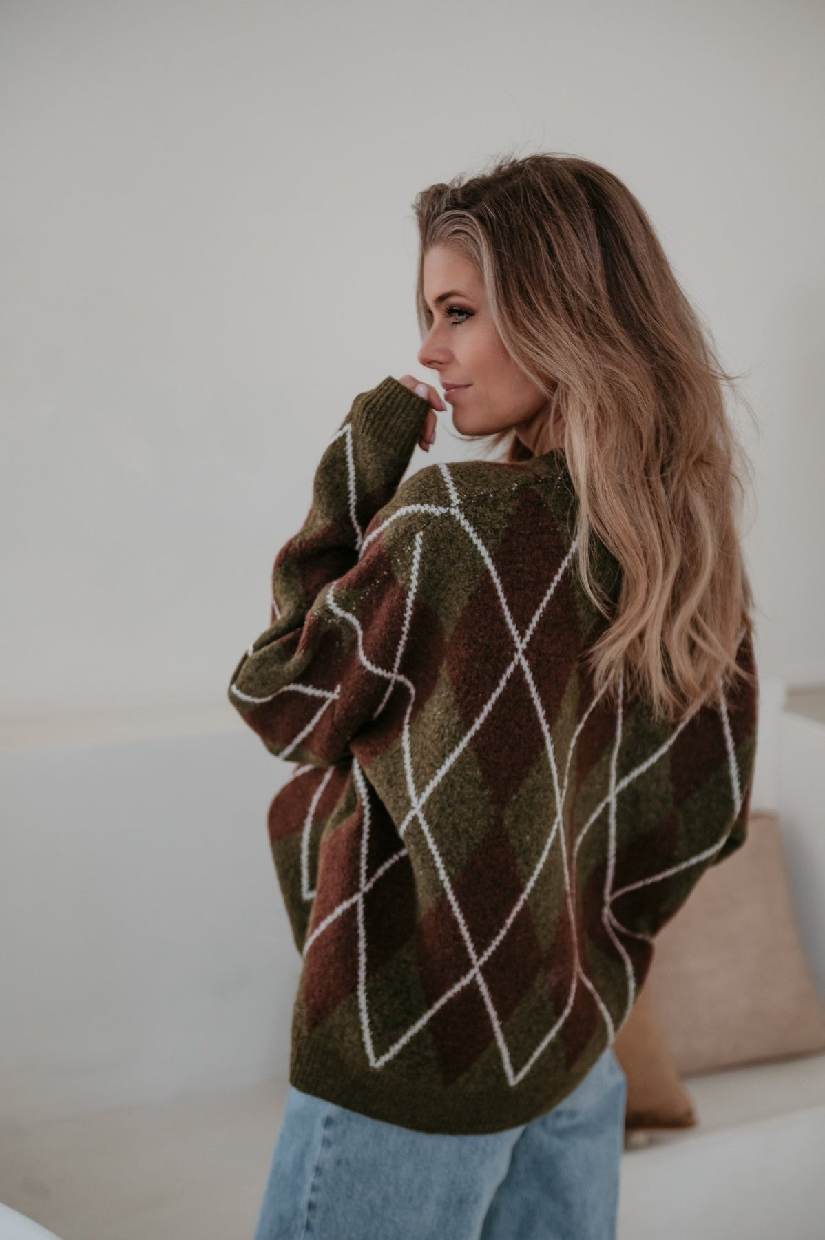 Deze mega toffe bruine trui met khaki kleurige ruiten is een echte eyecatcher voor je wintergarderobe.