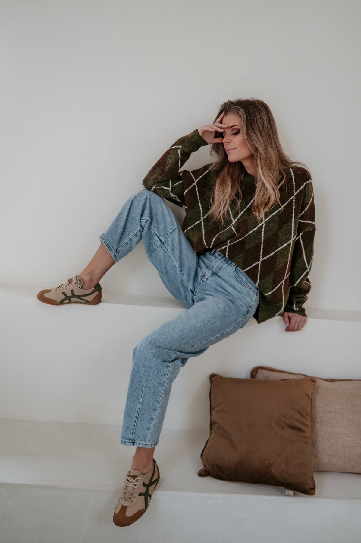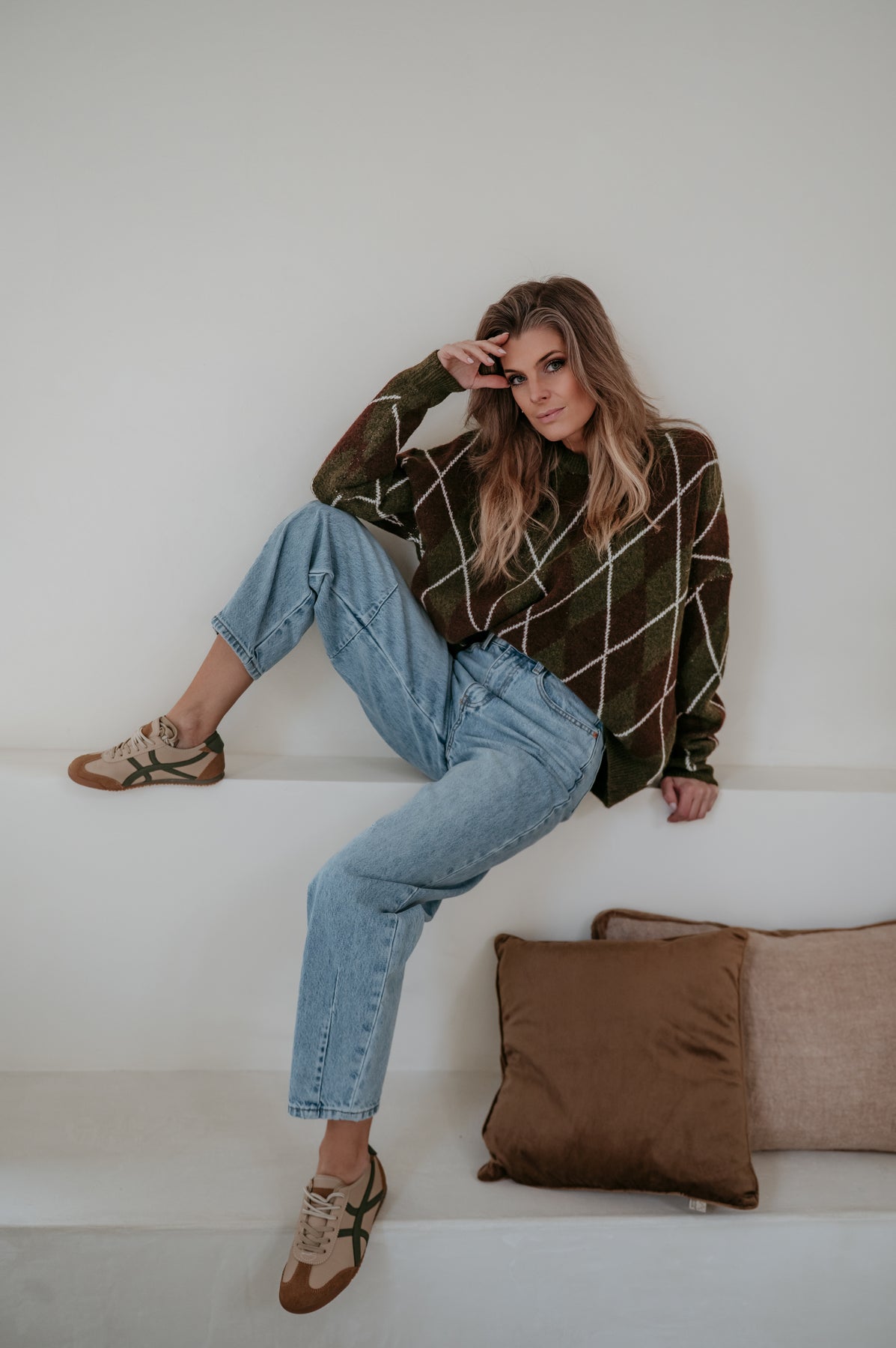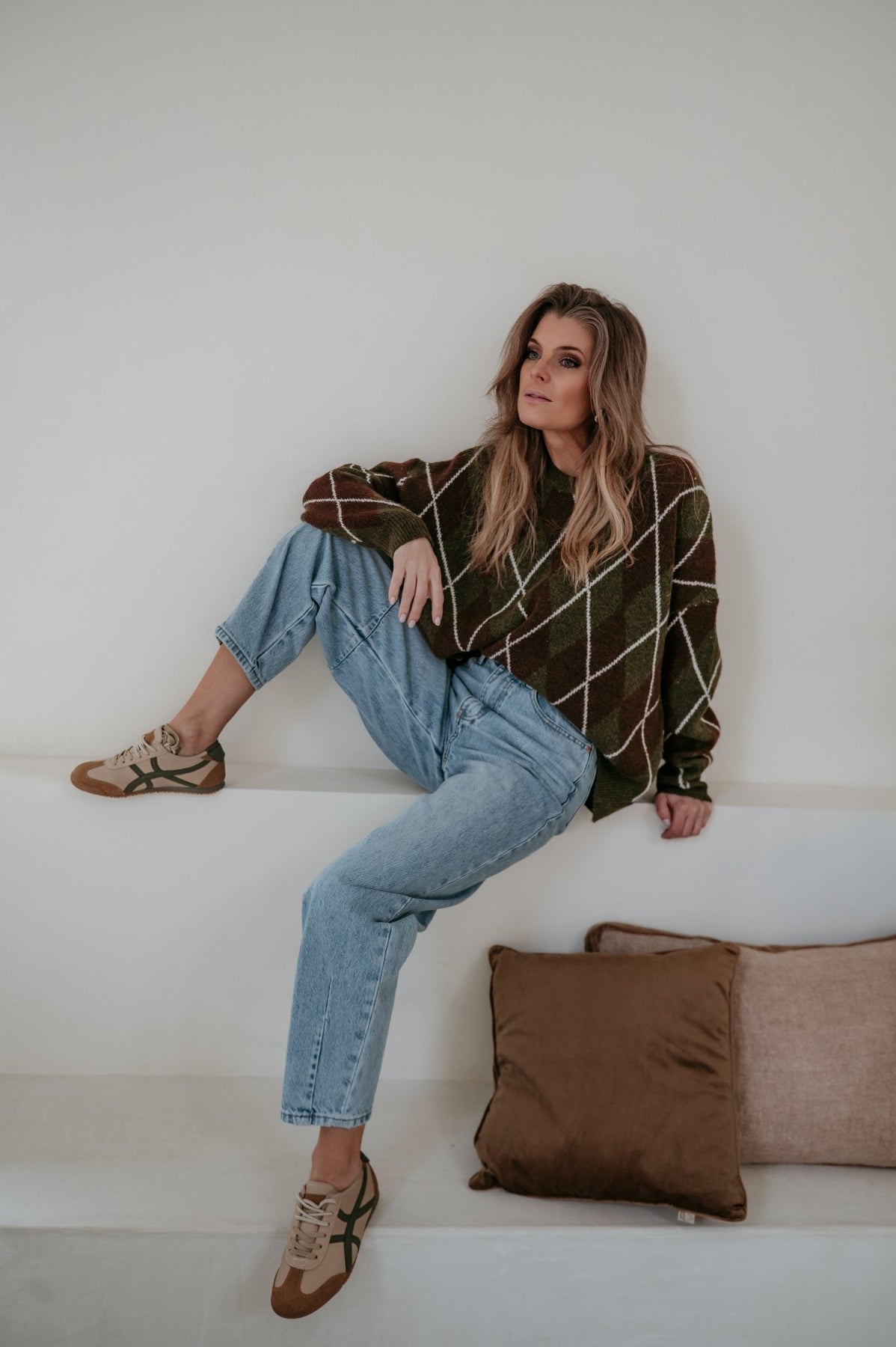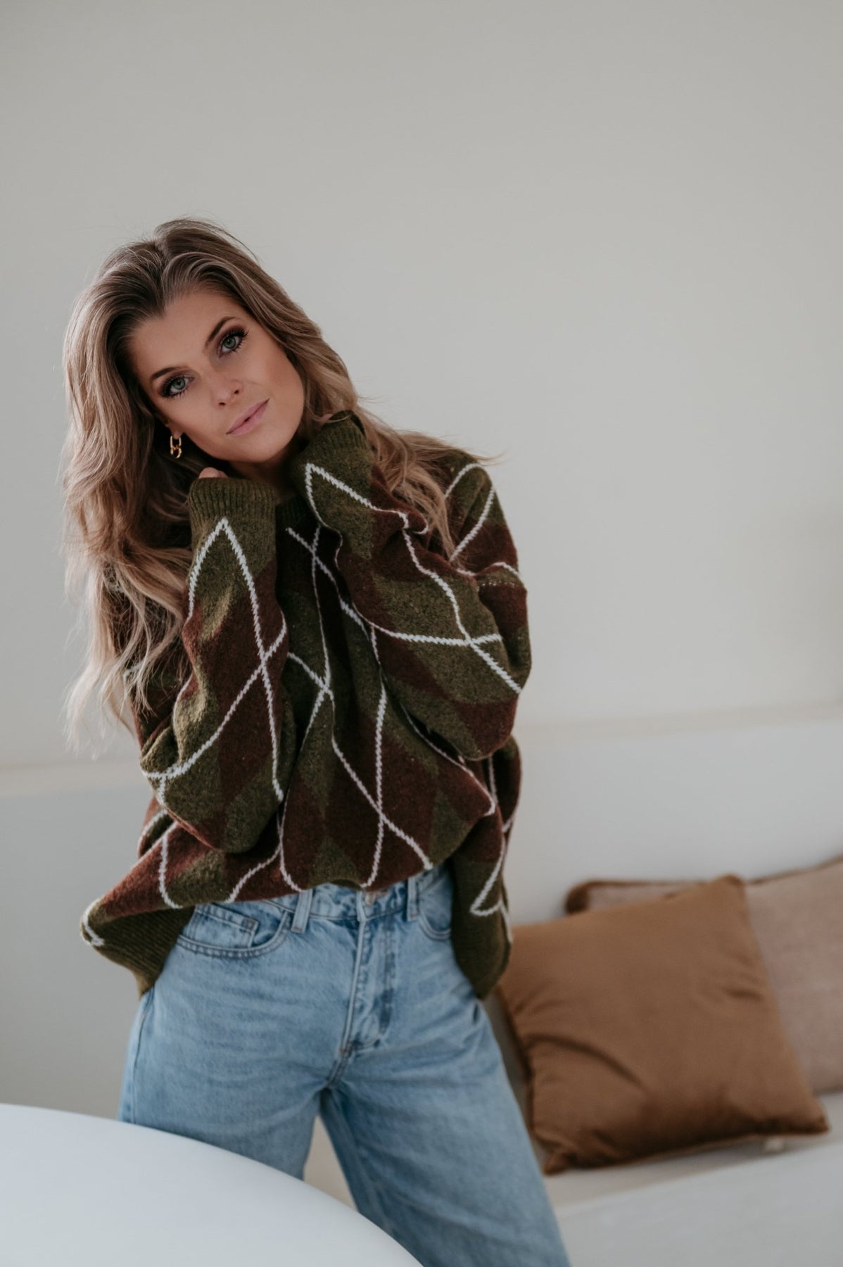 Deze mega toffe bruine trui met khaki kleurige ruiten is een echte eyecatcher voor je wintergarderobe.