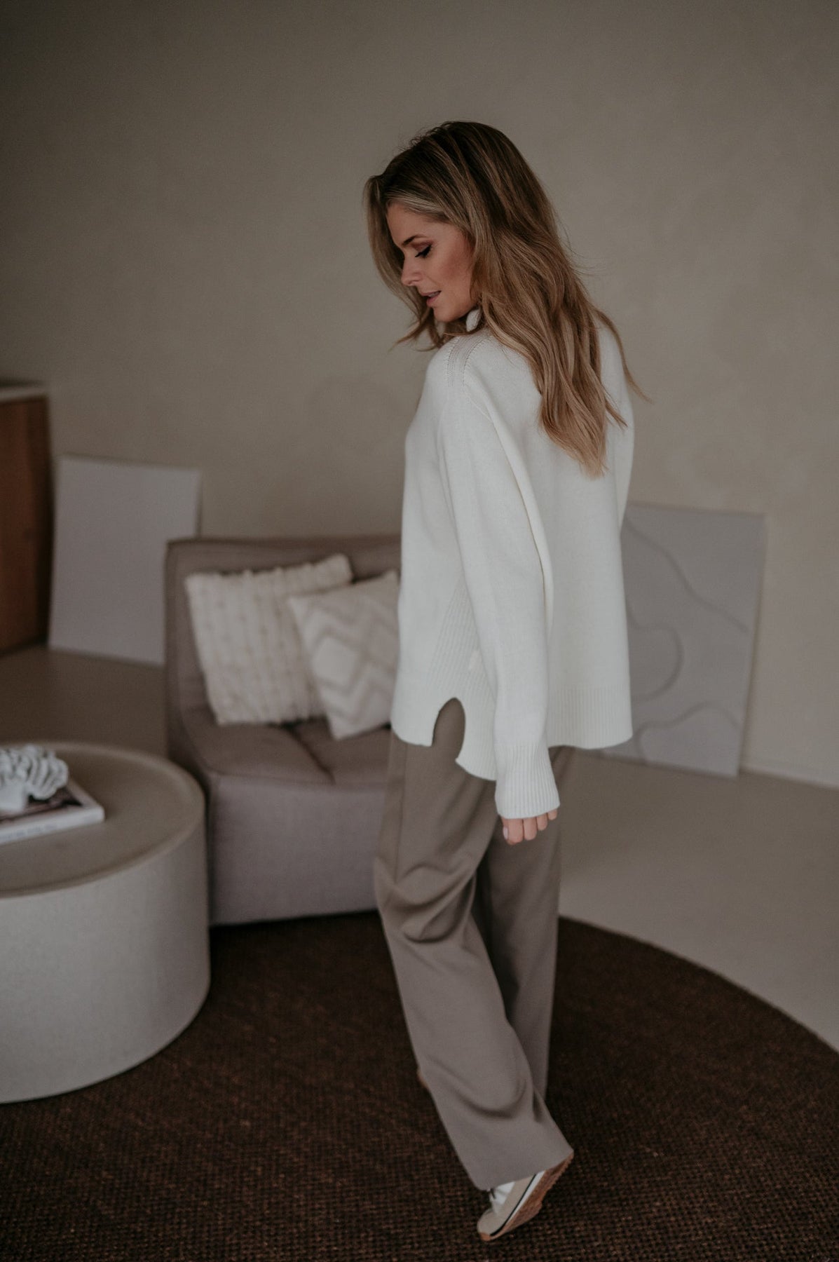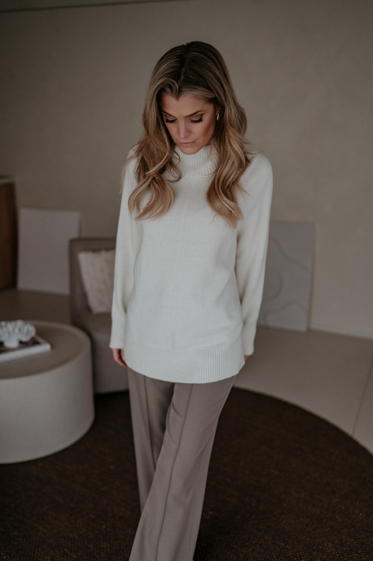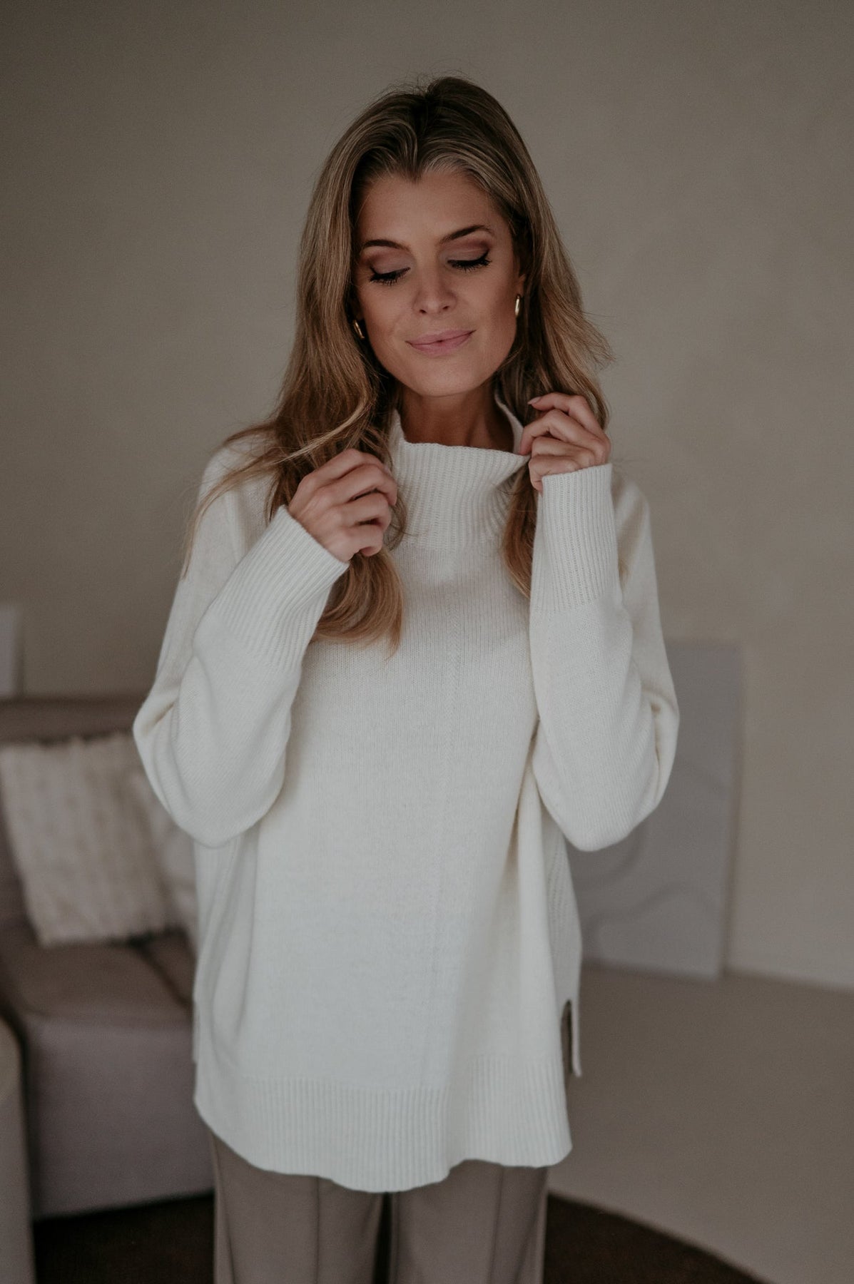 Heel mooie trui met een elegante hals en een subtiel langer model achteraan dan vooraan.