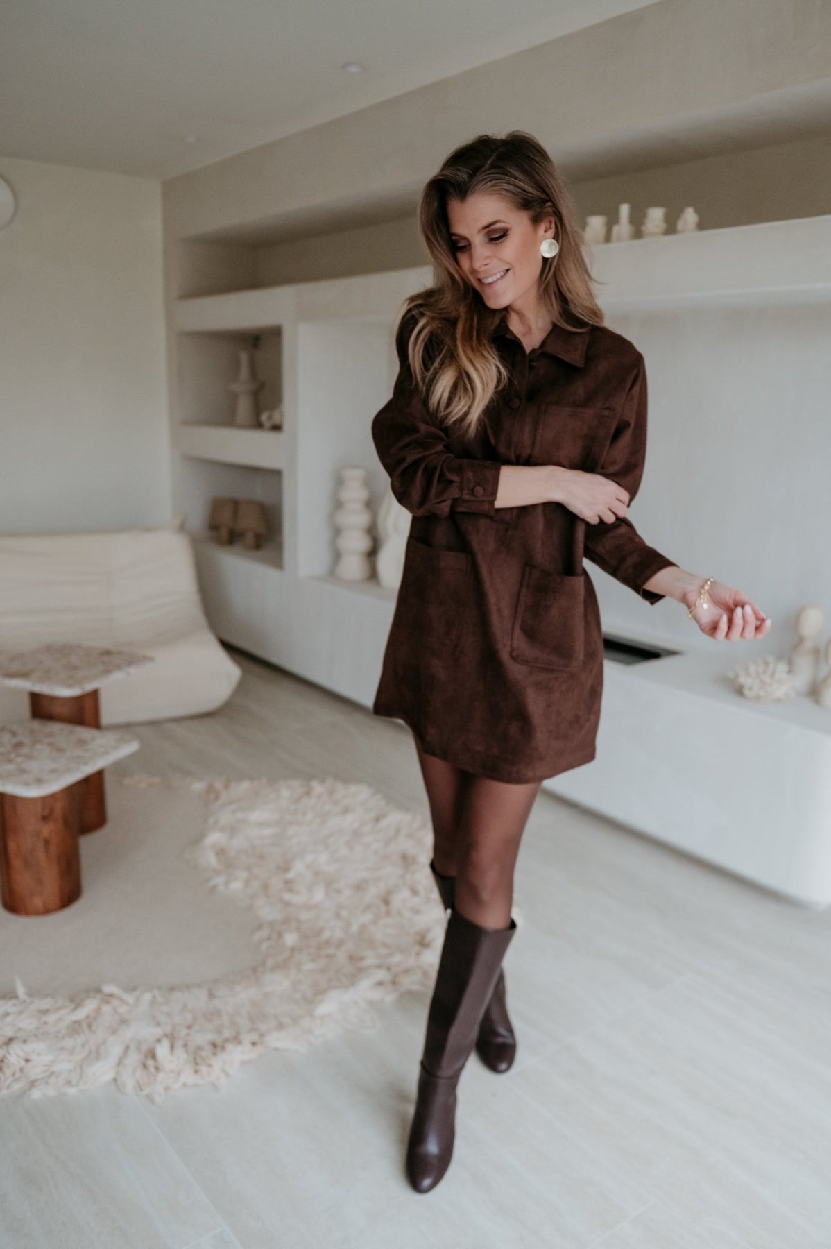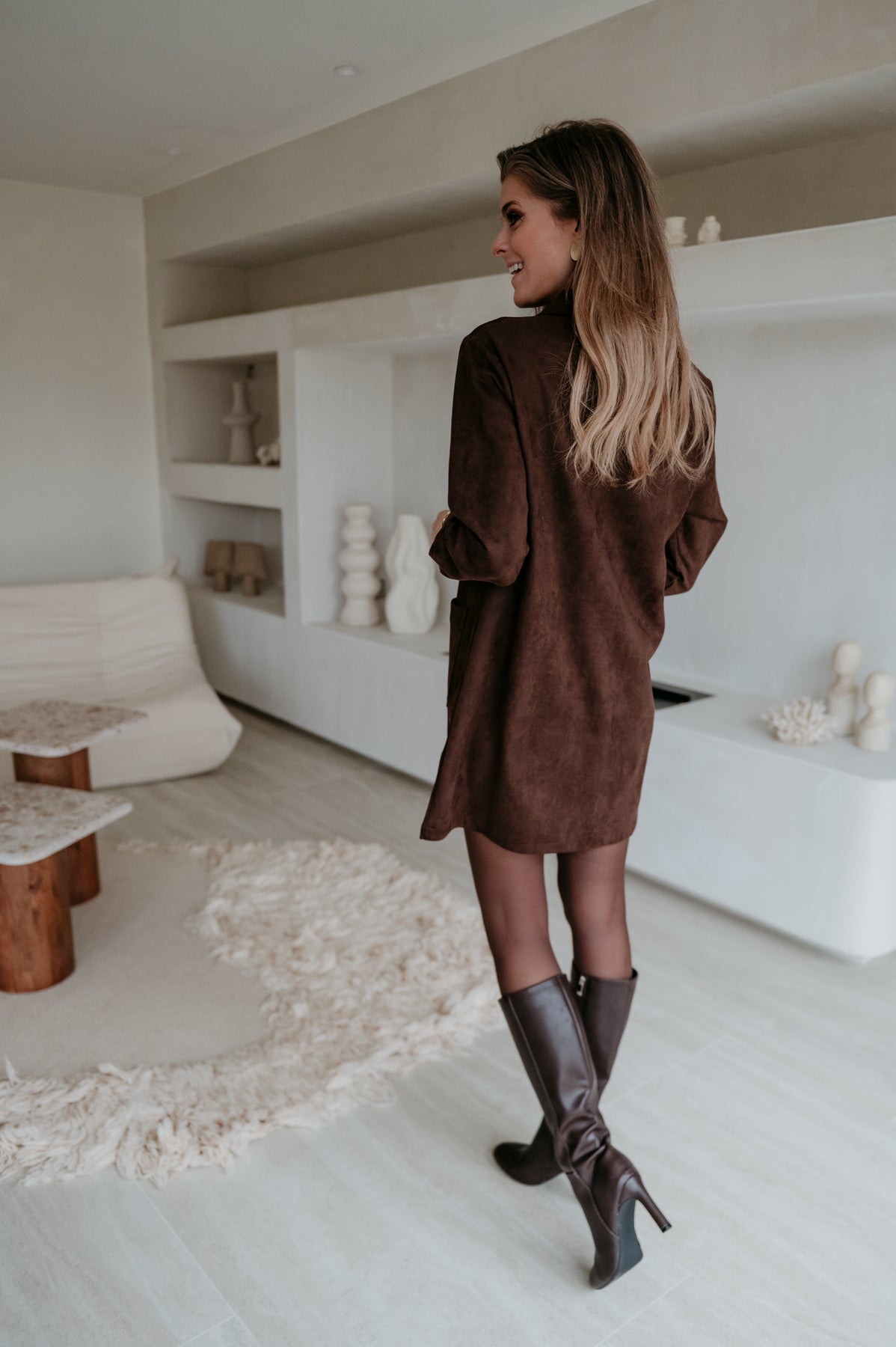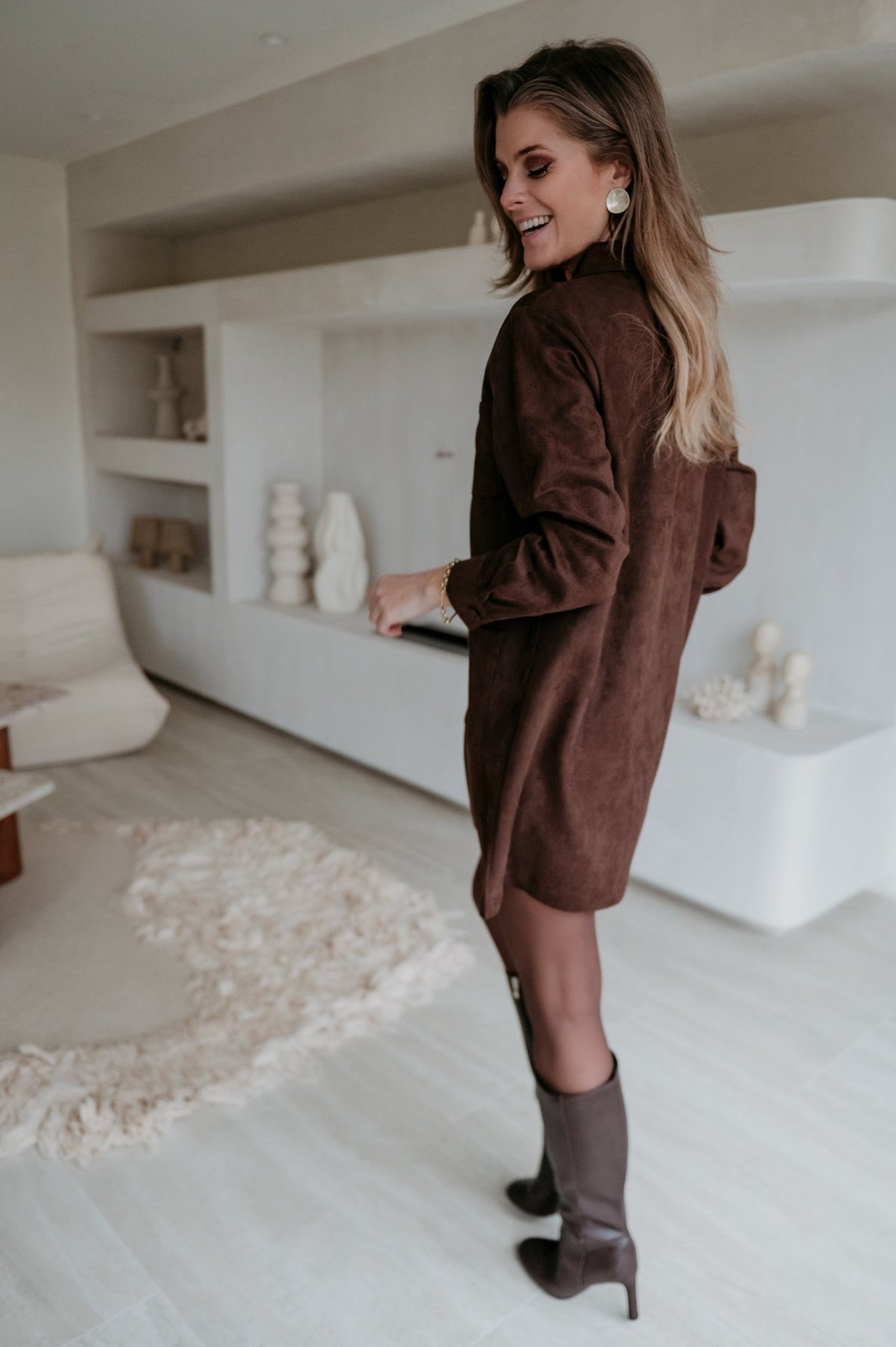 Dit bruine kleedje in nep suède is supertof en voelt heerlijk zacht aan.