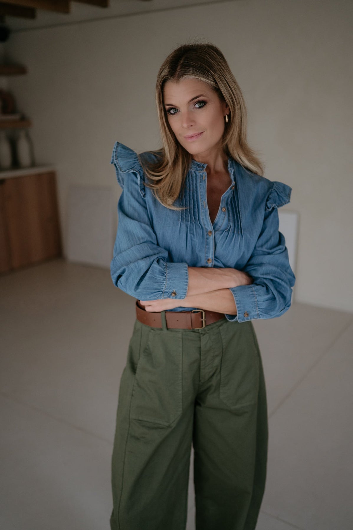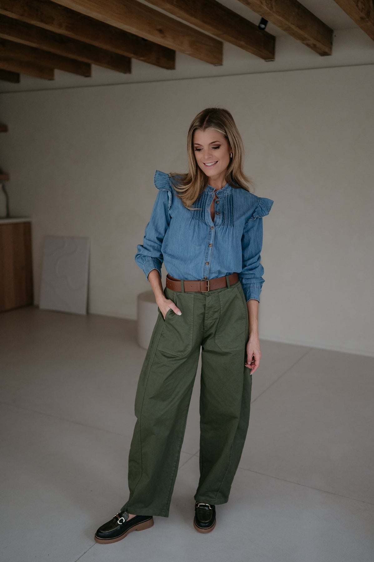 Dit mooie jeans bloesje krijgt een unieke twist door de toffe roesjes aan de schouders.