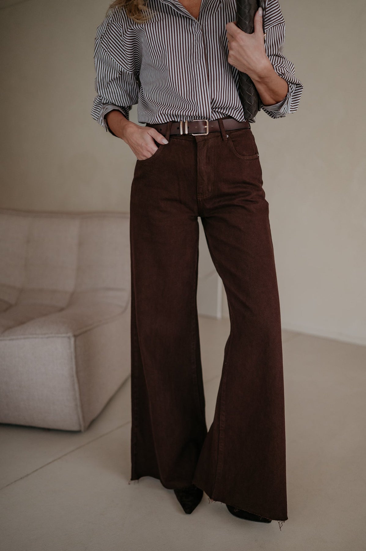 Deze heel toffe, brede chocoladebruine jeans met rafeltjes aan de onderkant is een echte must-have.