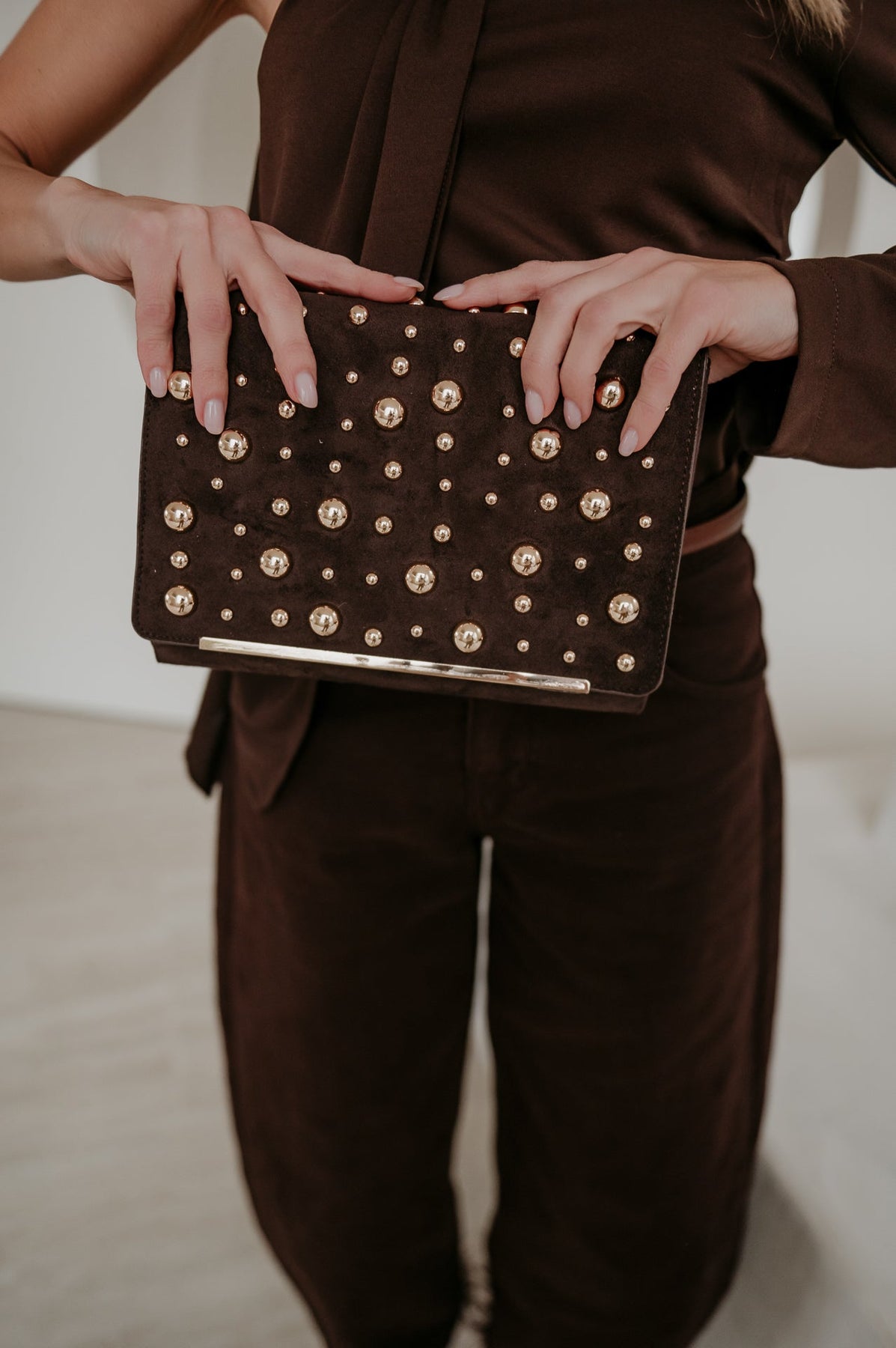 Deze bruine clutch met gouden studs is een stijlvolle en veelzijdige tas.