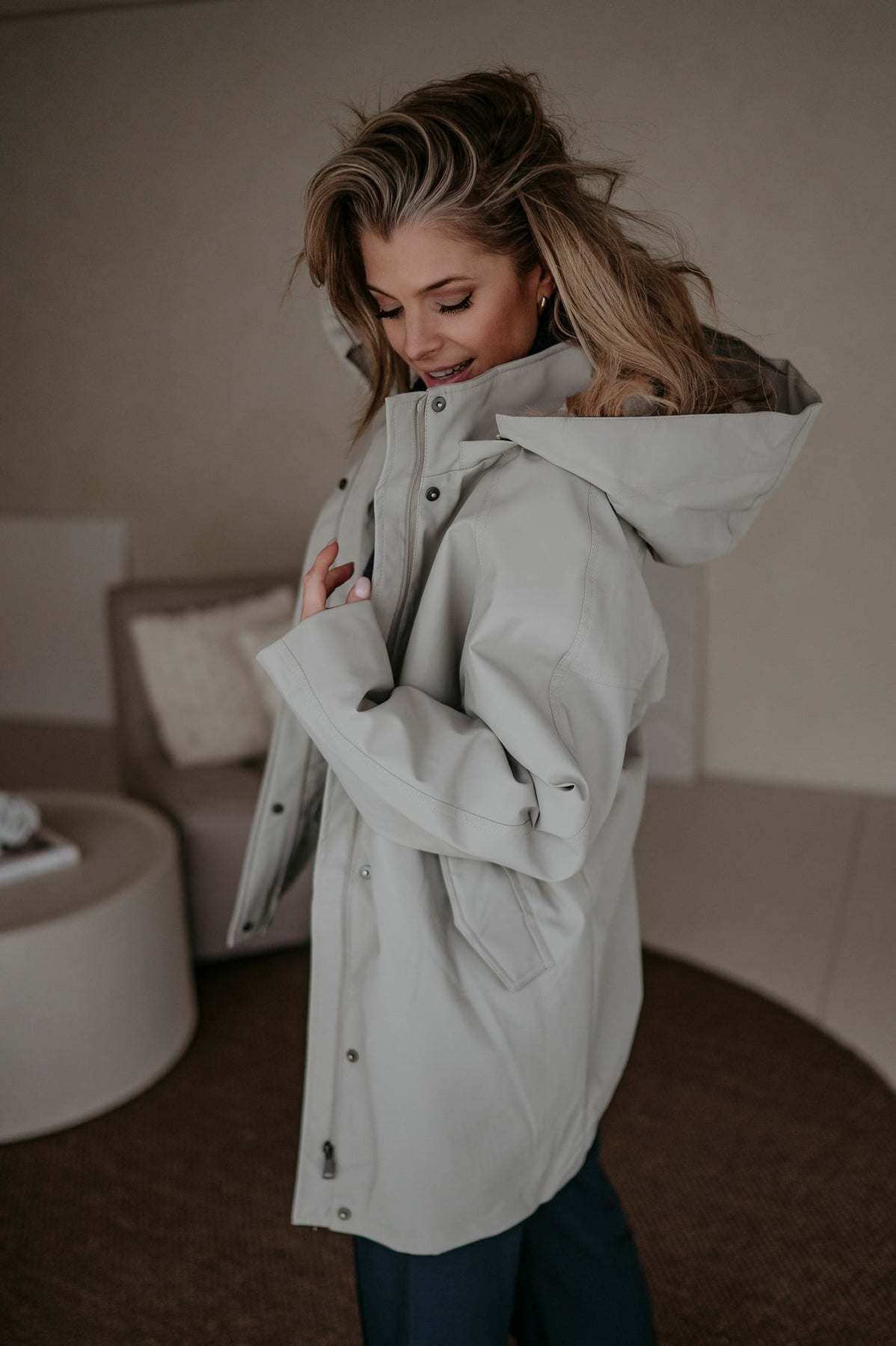 Deze mega leuke beige regenjas is ideaal voor regenachtige dagen.