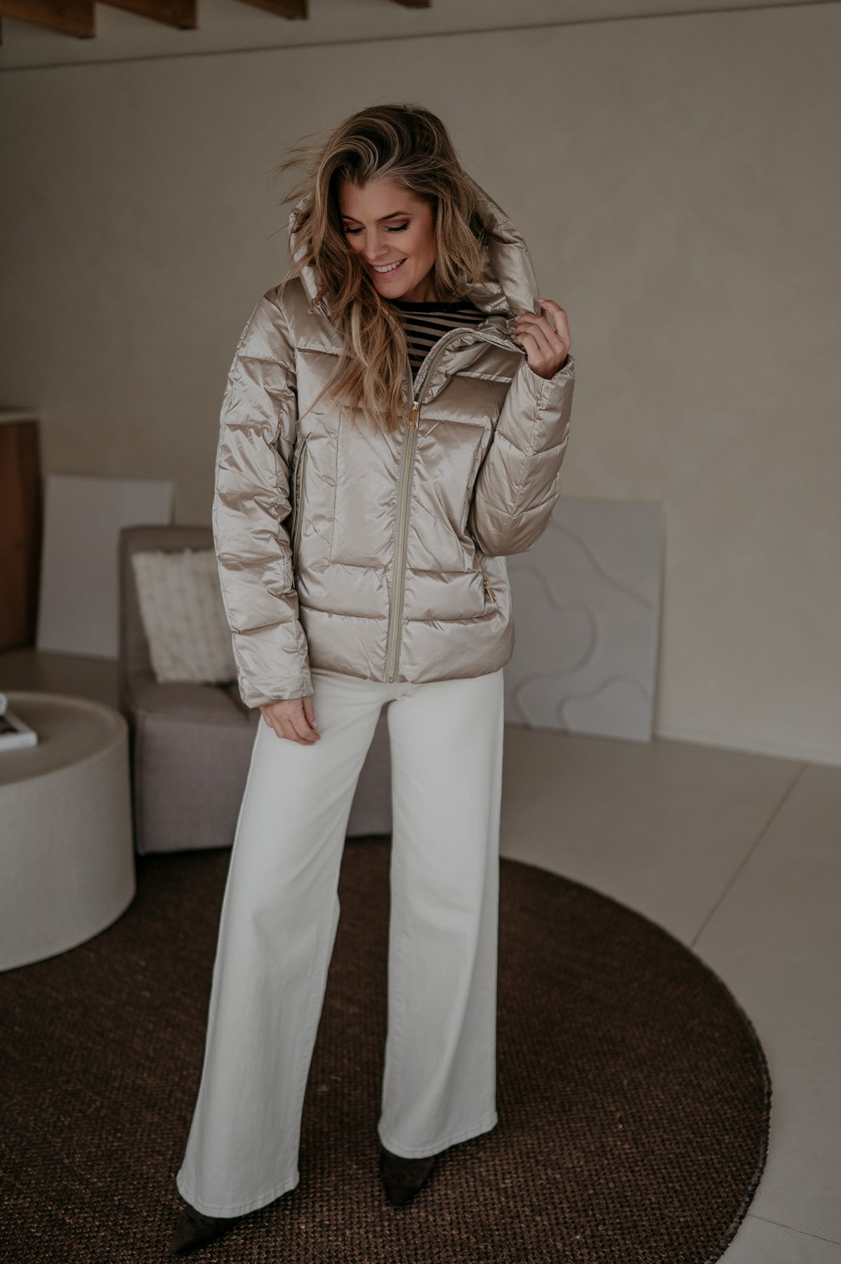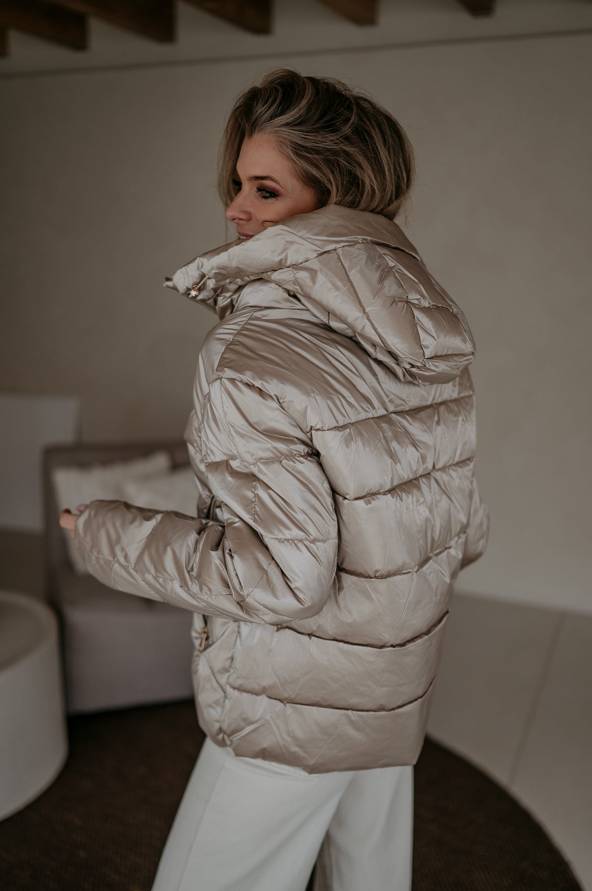 Prachtige gouden puffer jas die onmiddellijk opvalt door haar stijlvolle glans.