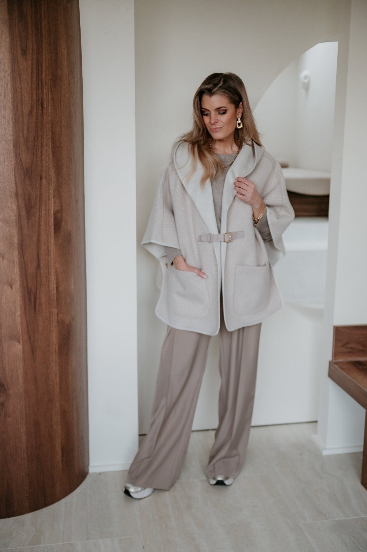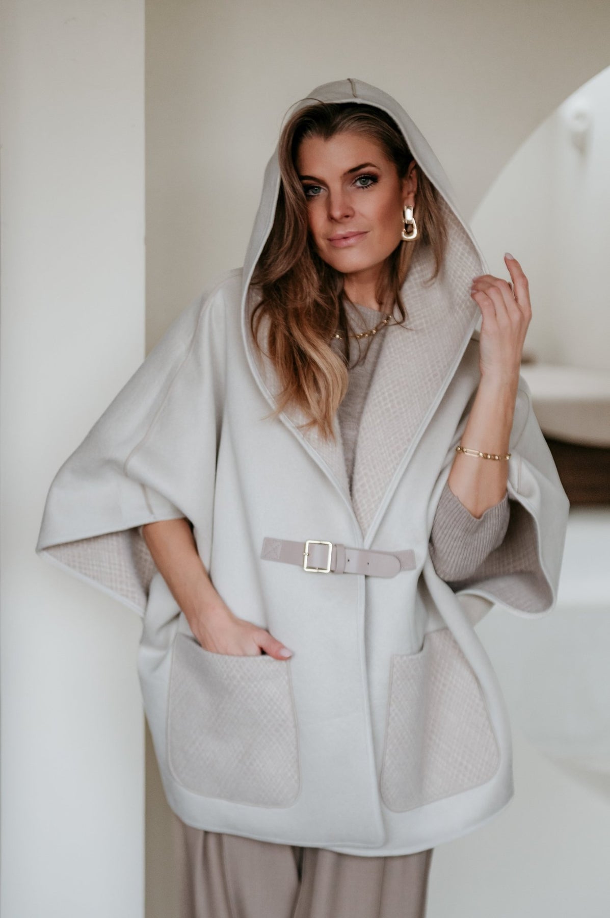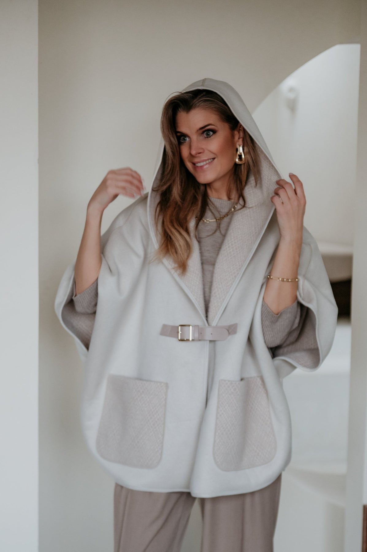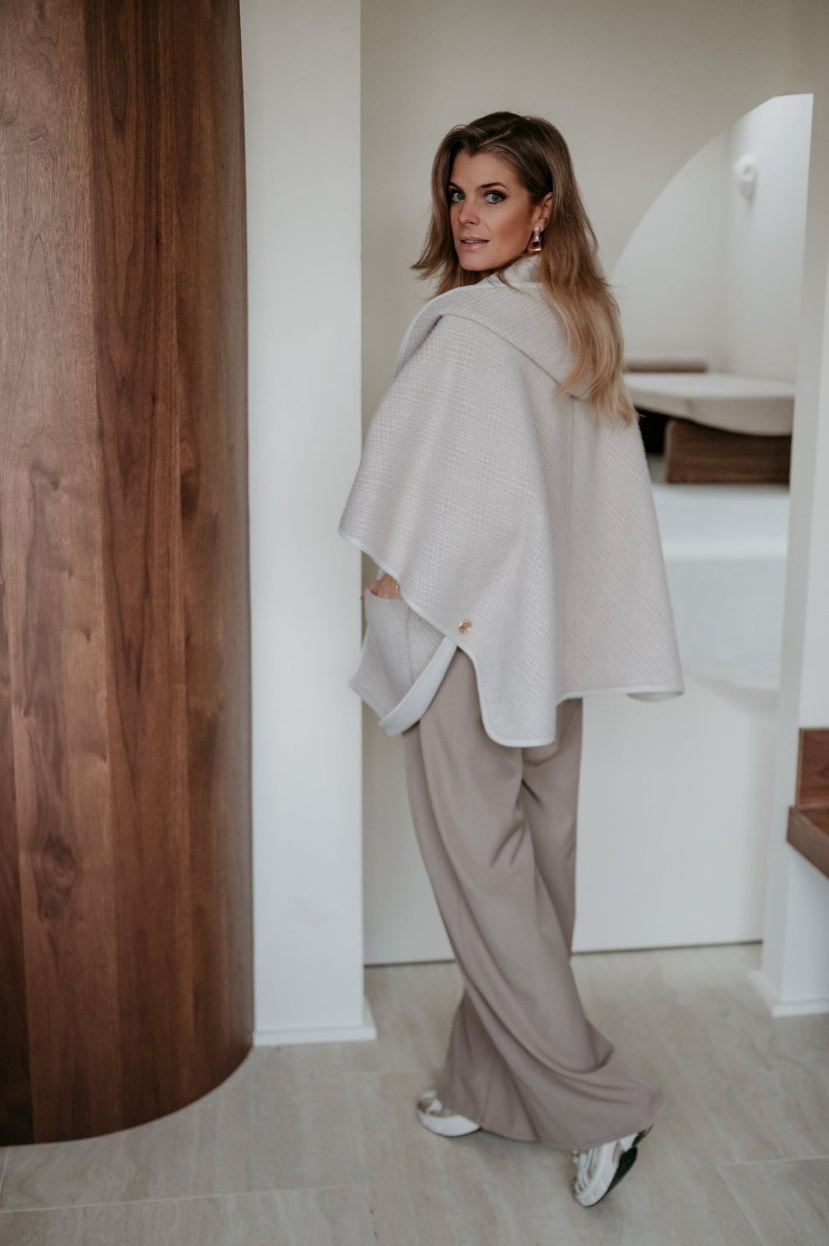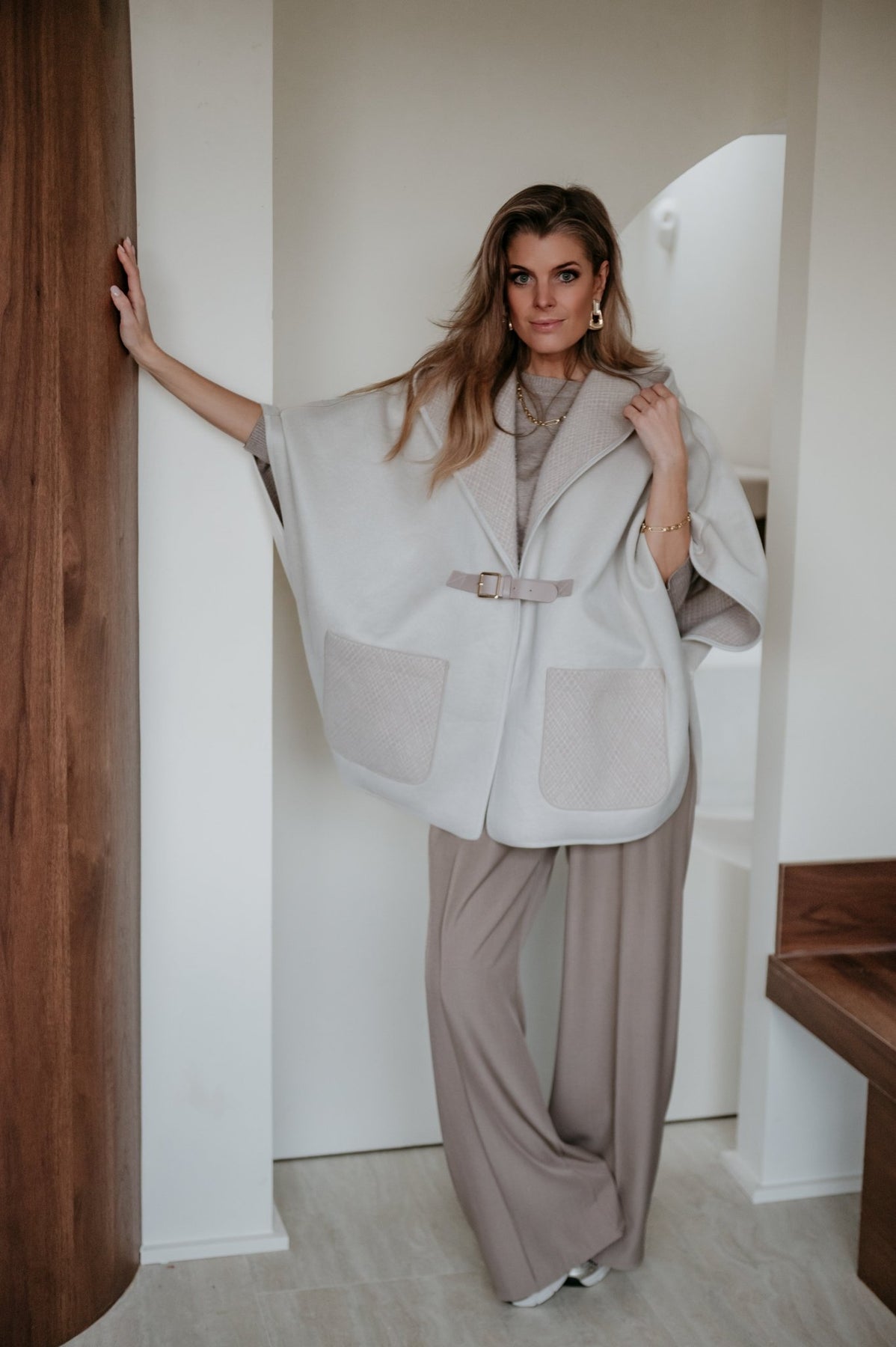 Een prachtige beige cape die je op twee manieren kunt dragen, waardoor je elke keer een net iets andere look creëert.