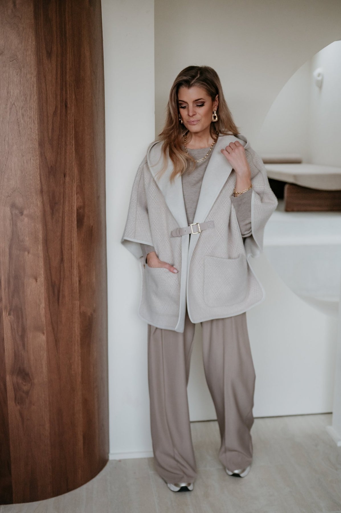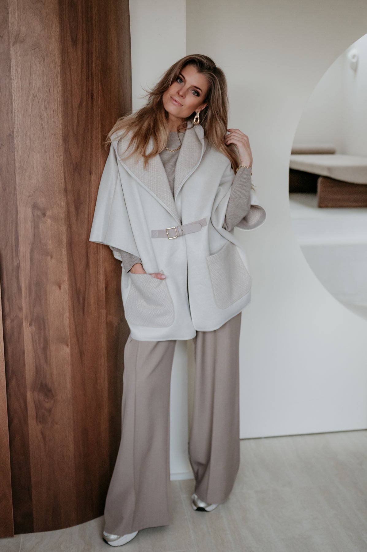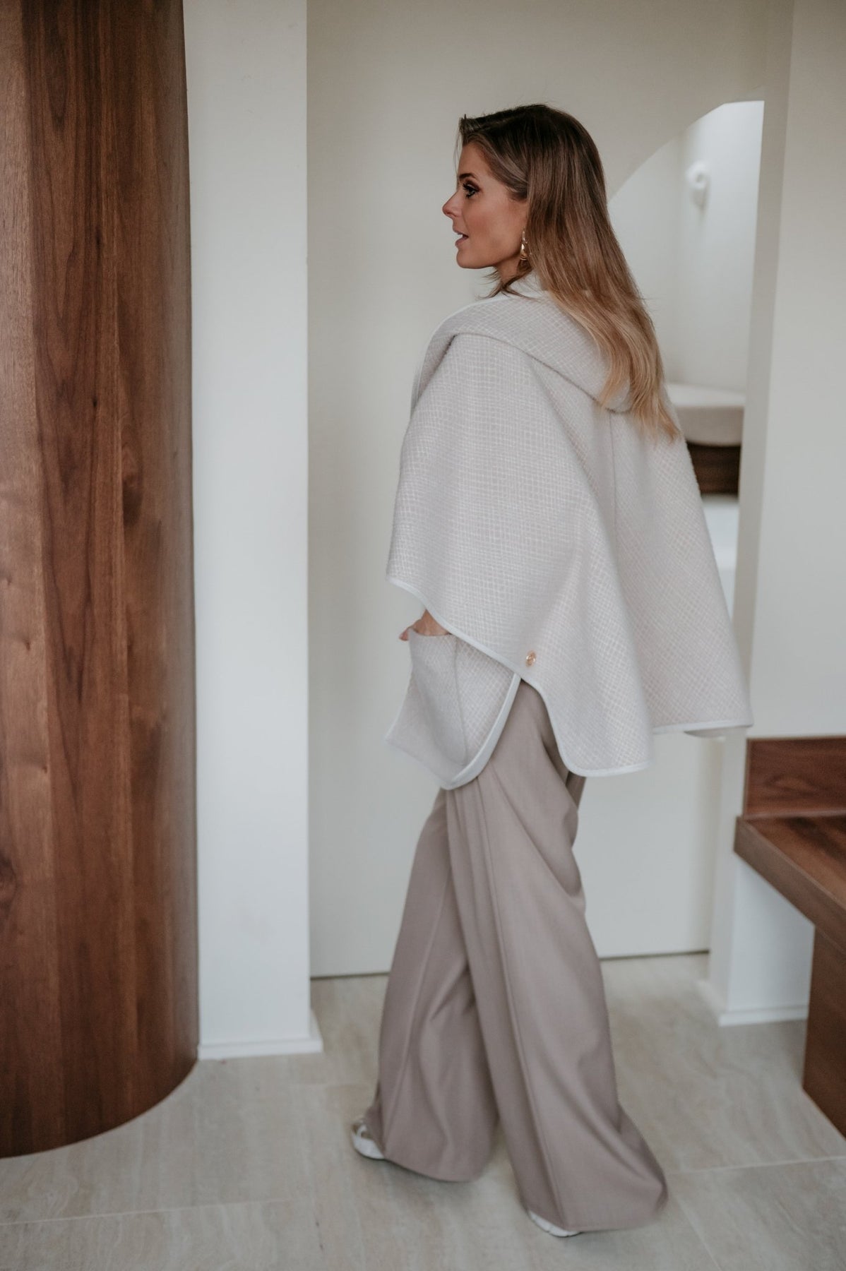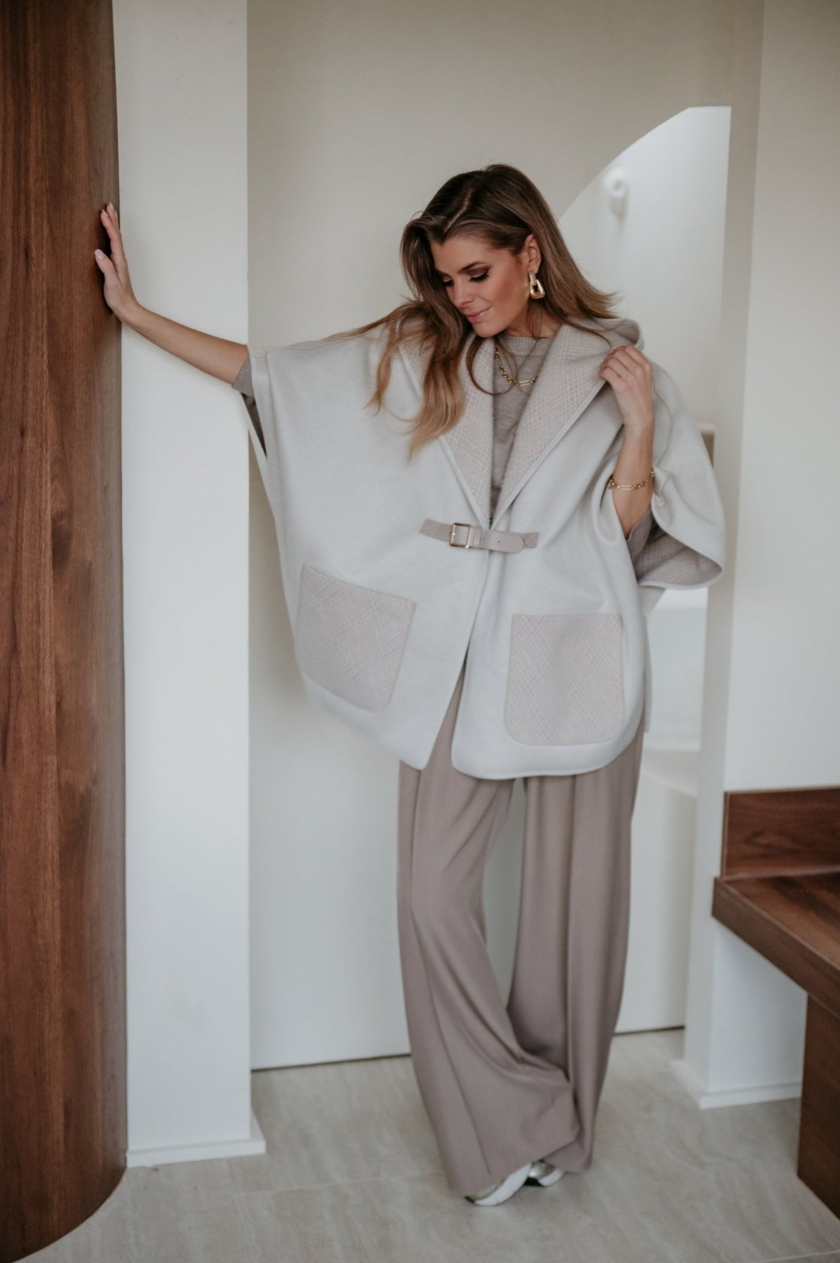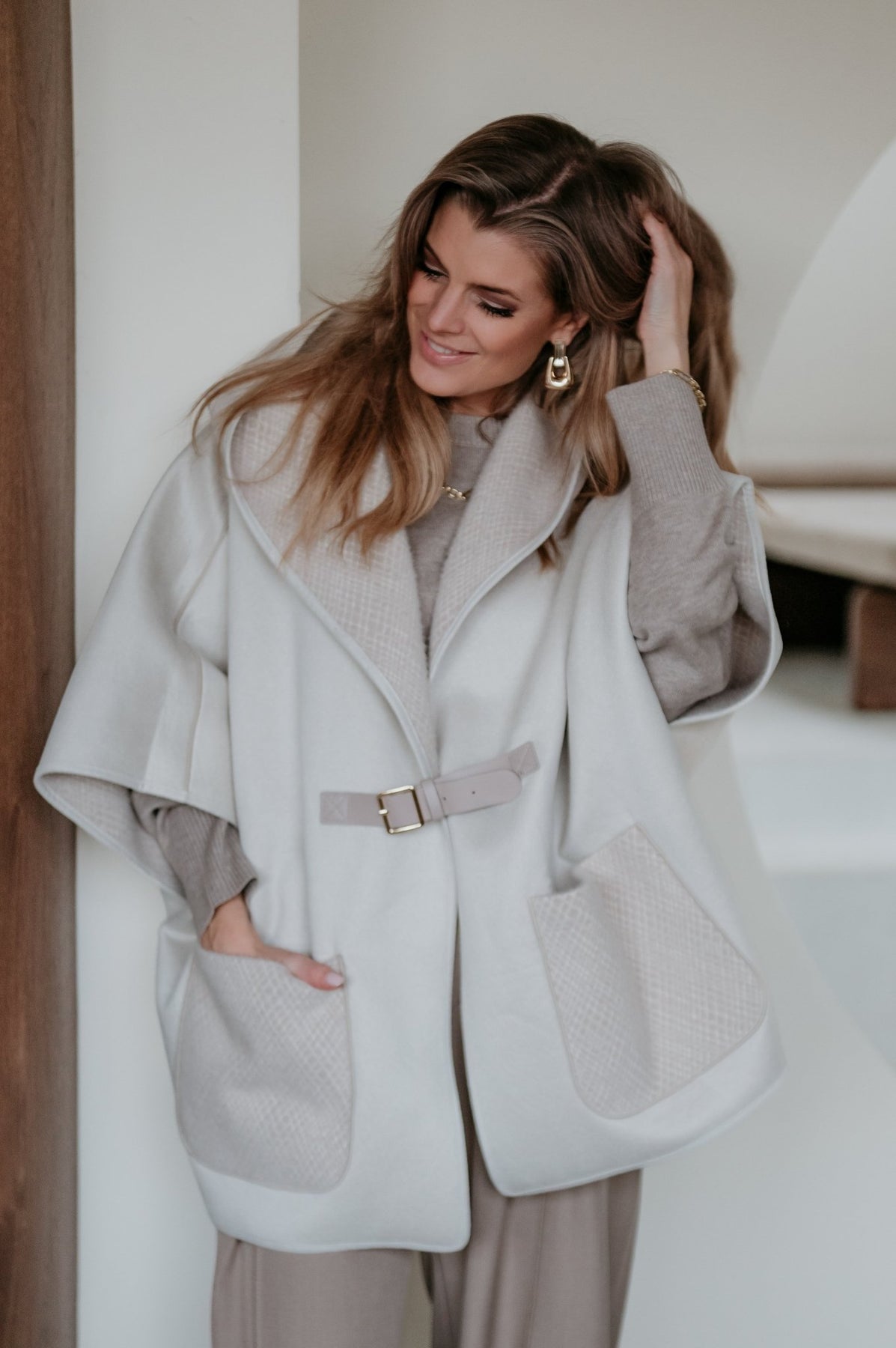 Een prachtige beige cape die je op twee manieren kunt dragen, waardoor je elke keer een net iets andere look creëert.