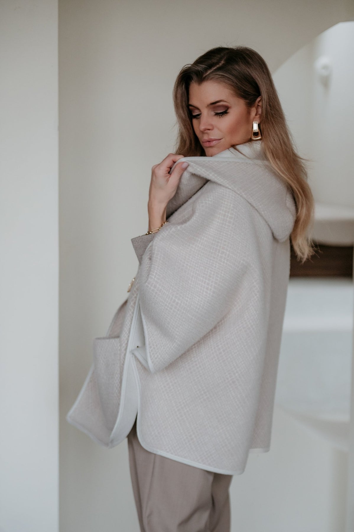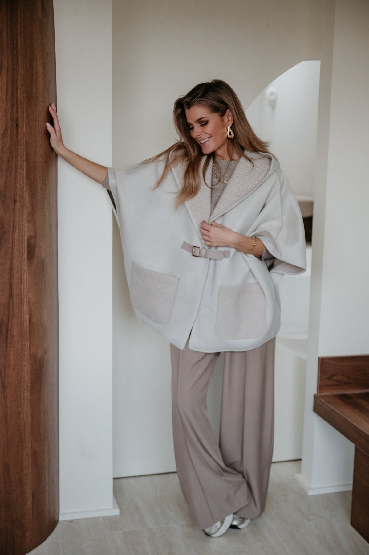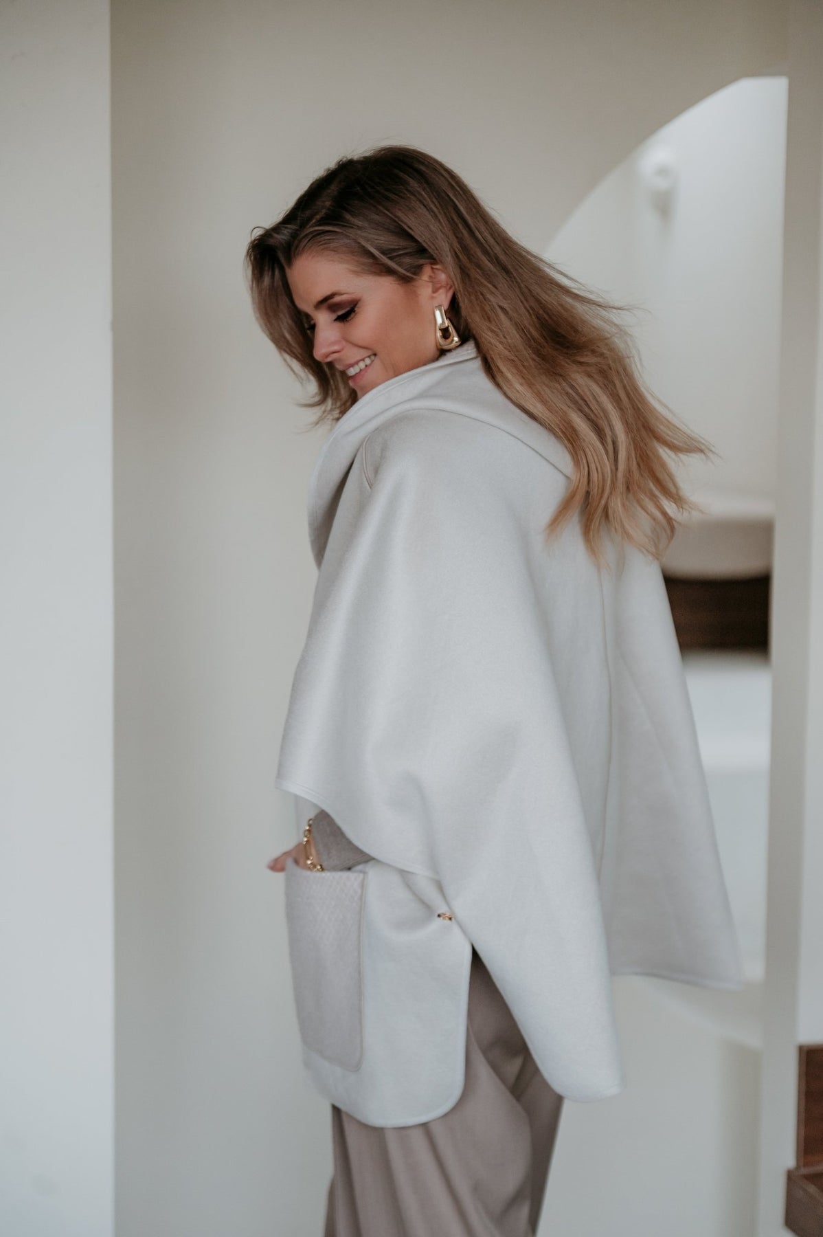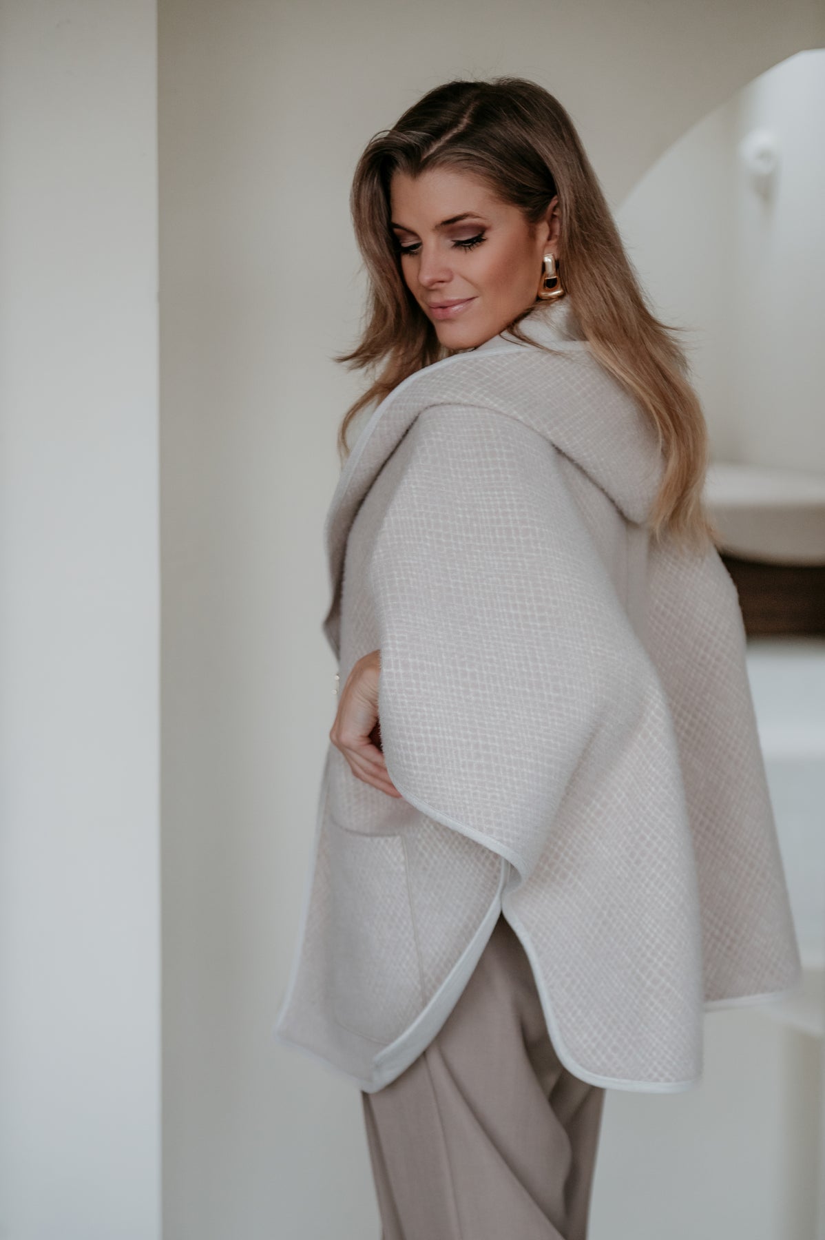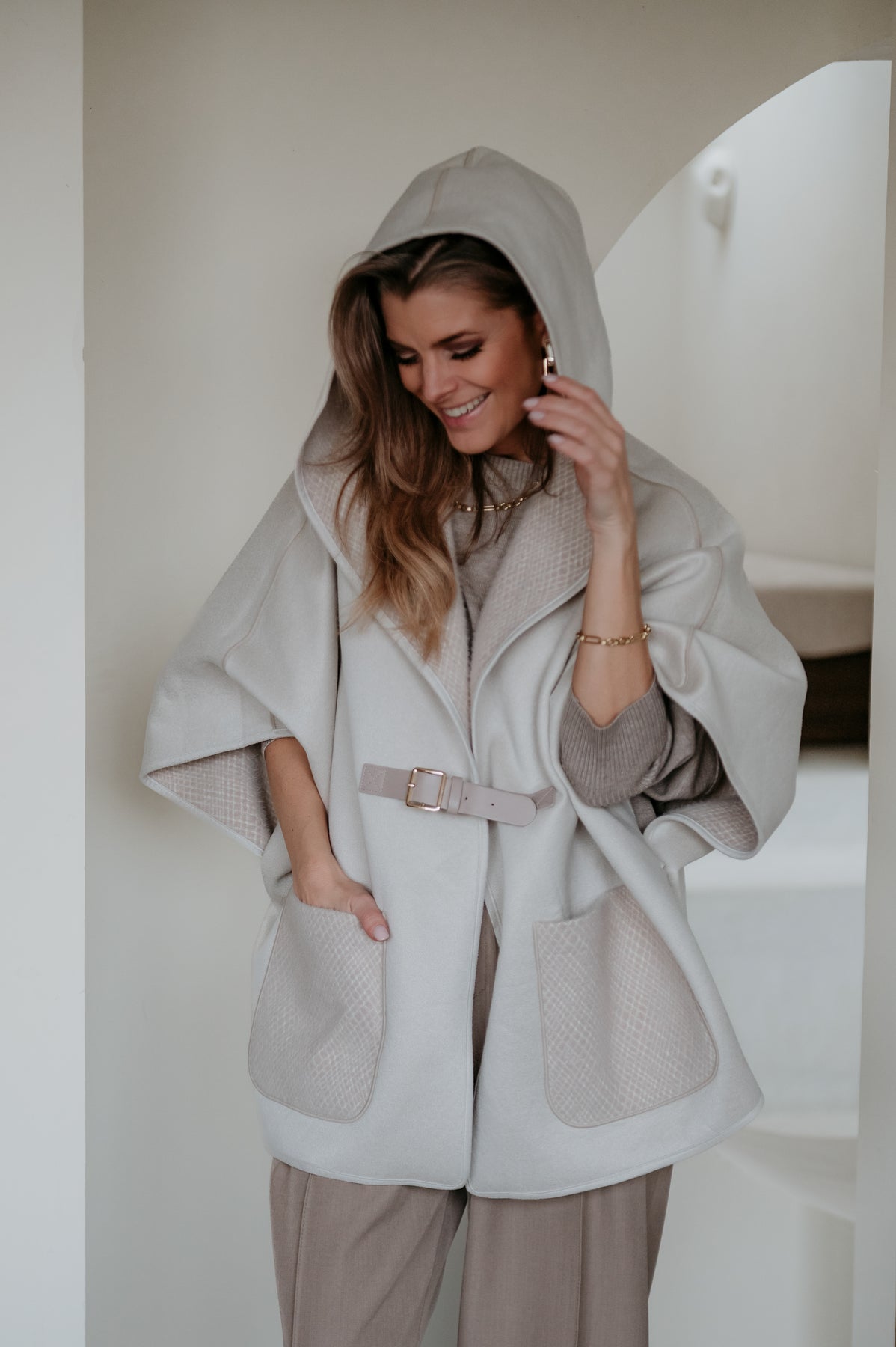 Een prachtige beige cape die je op twee manieren kunt dragen, waardoor je elke keer een net iets andere look creëert.