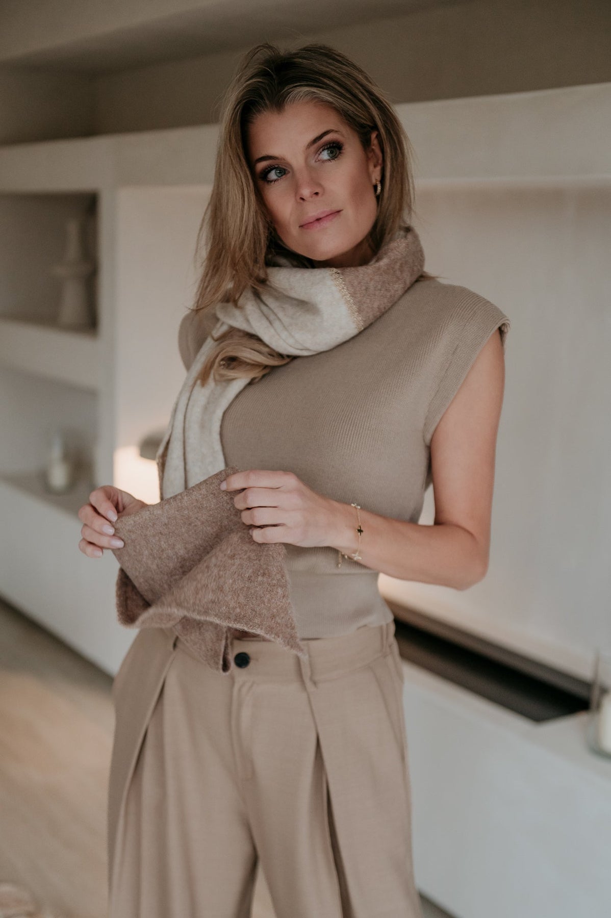 Deze sjaal heeft een prachtige combinatie van ecru en taupe, afgewerkt met subtiele gouden details.