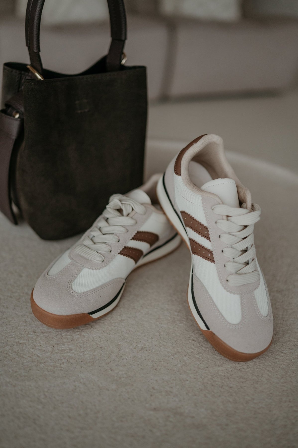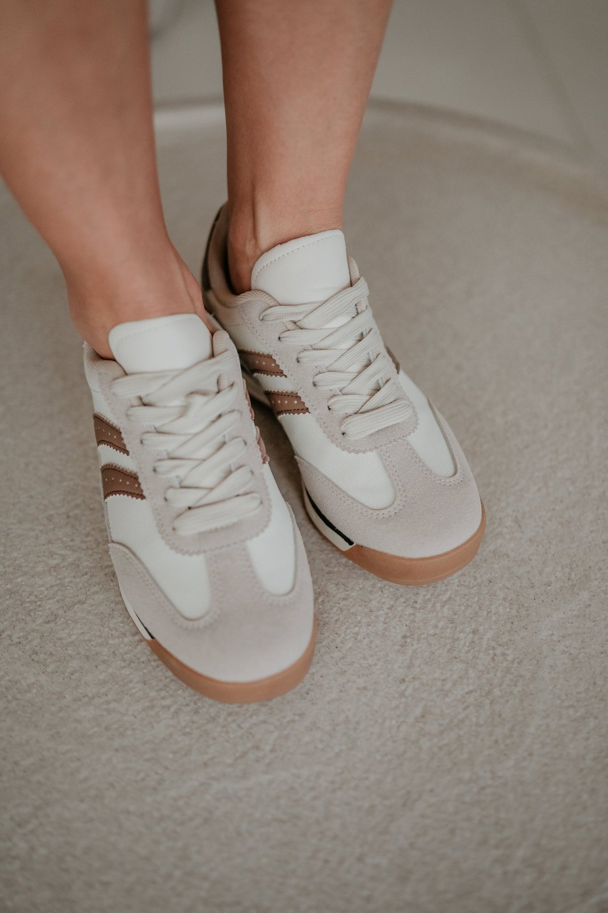 Heel toffe beige sneakers met lichtbruine details die zorgen voor een stijlvolle, neutrale look.