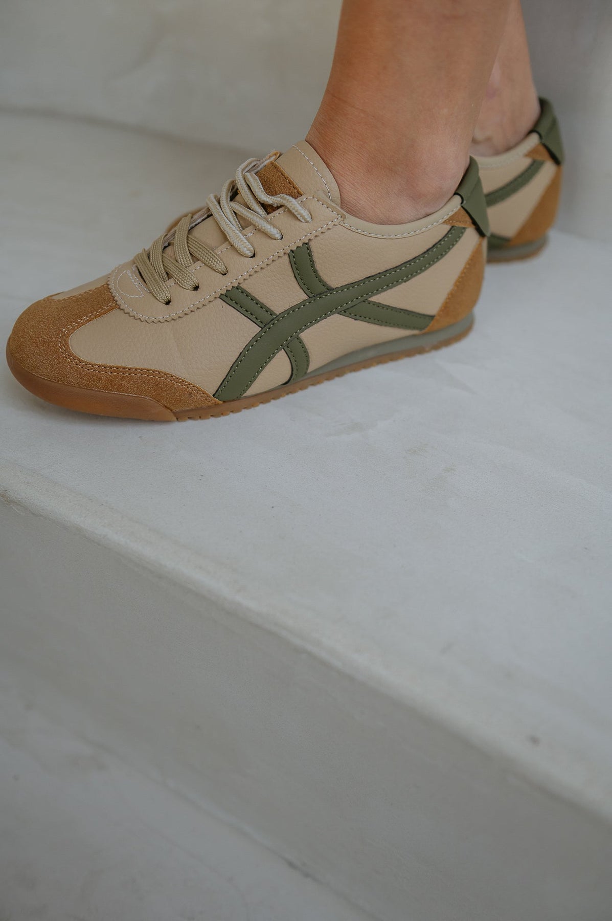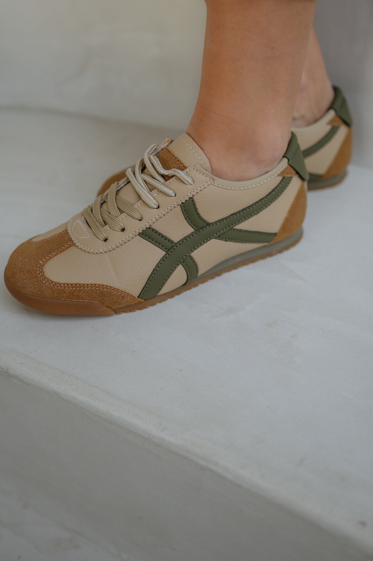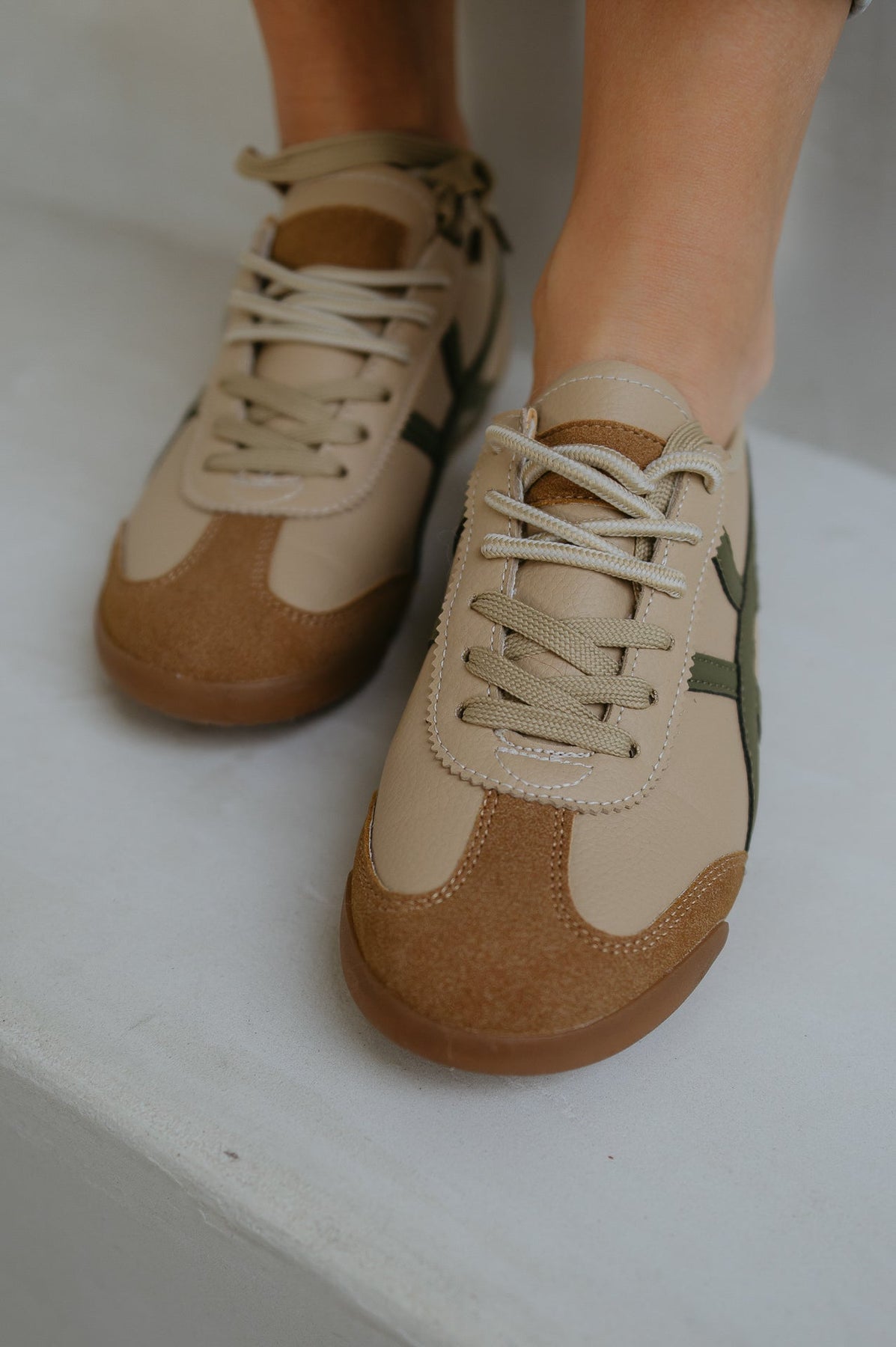 Leuke beige sneakers met een khaki detail die elke outfit een frisse en trendy uitstraling geven.
