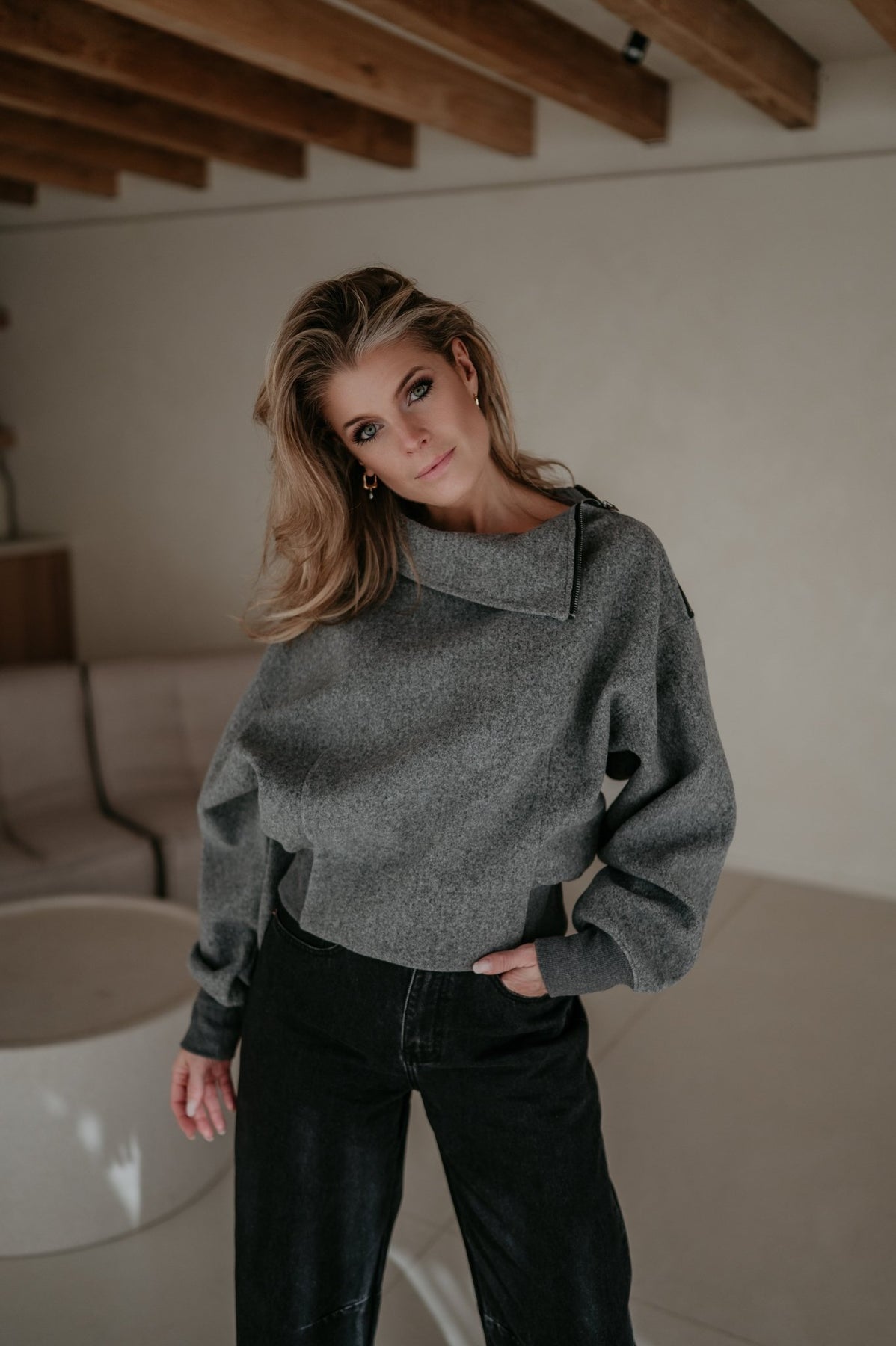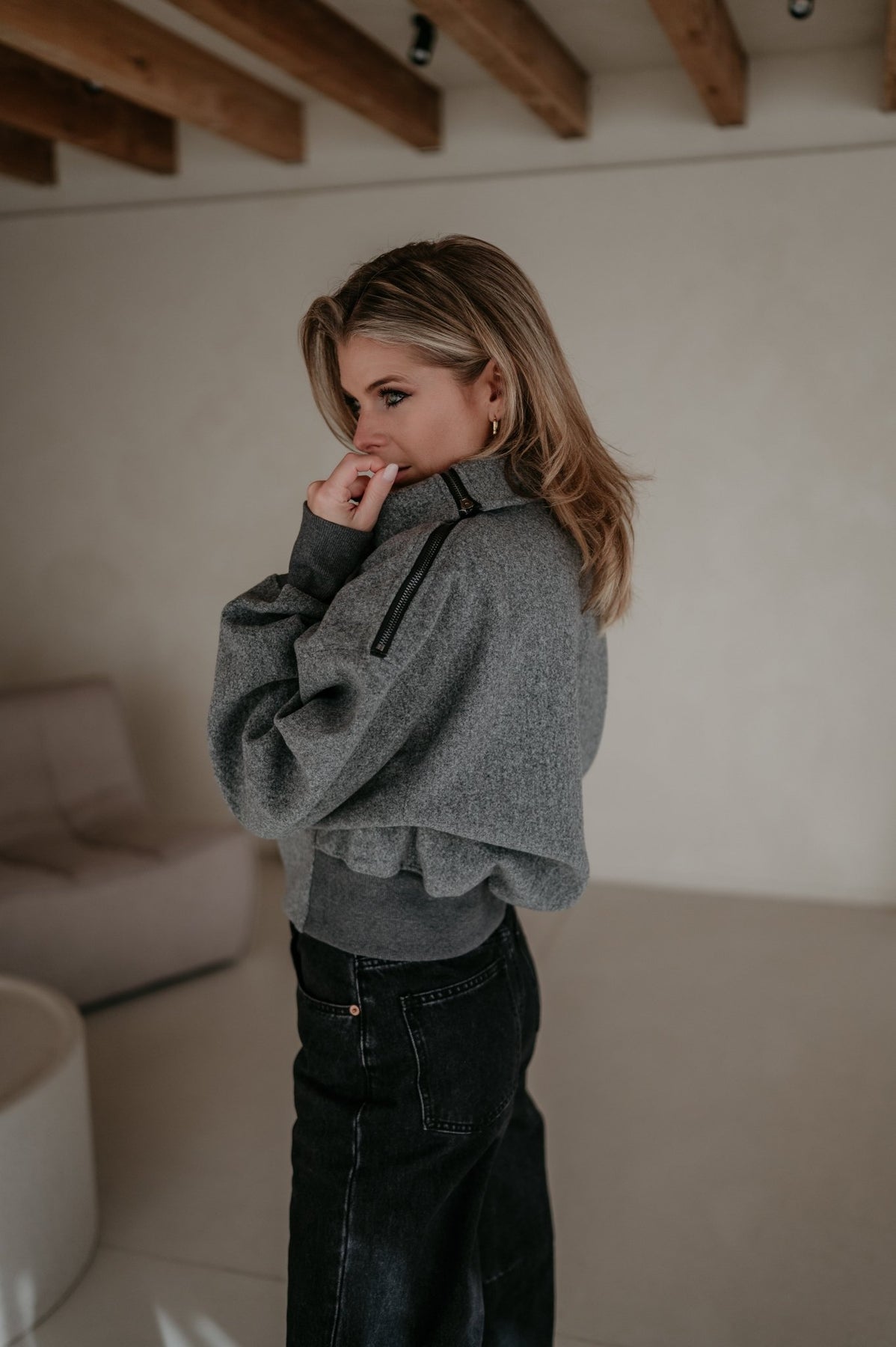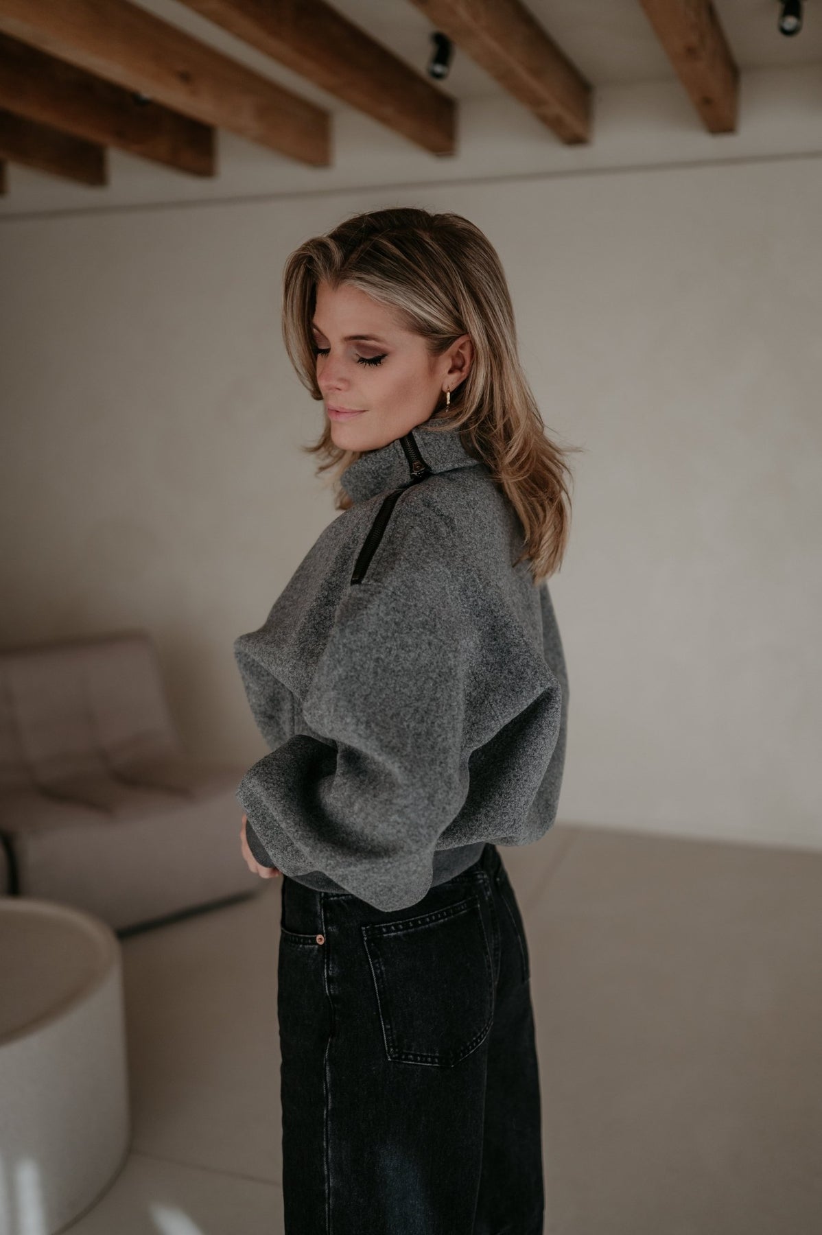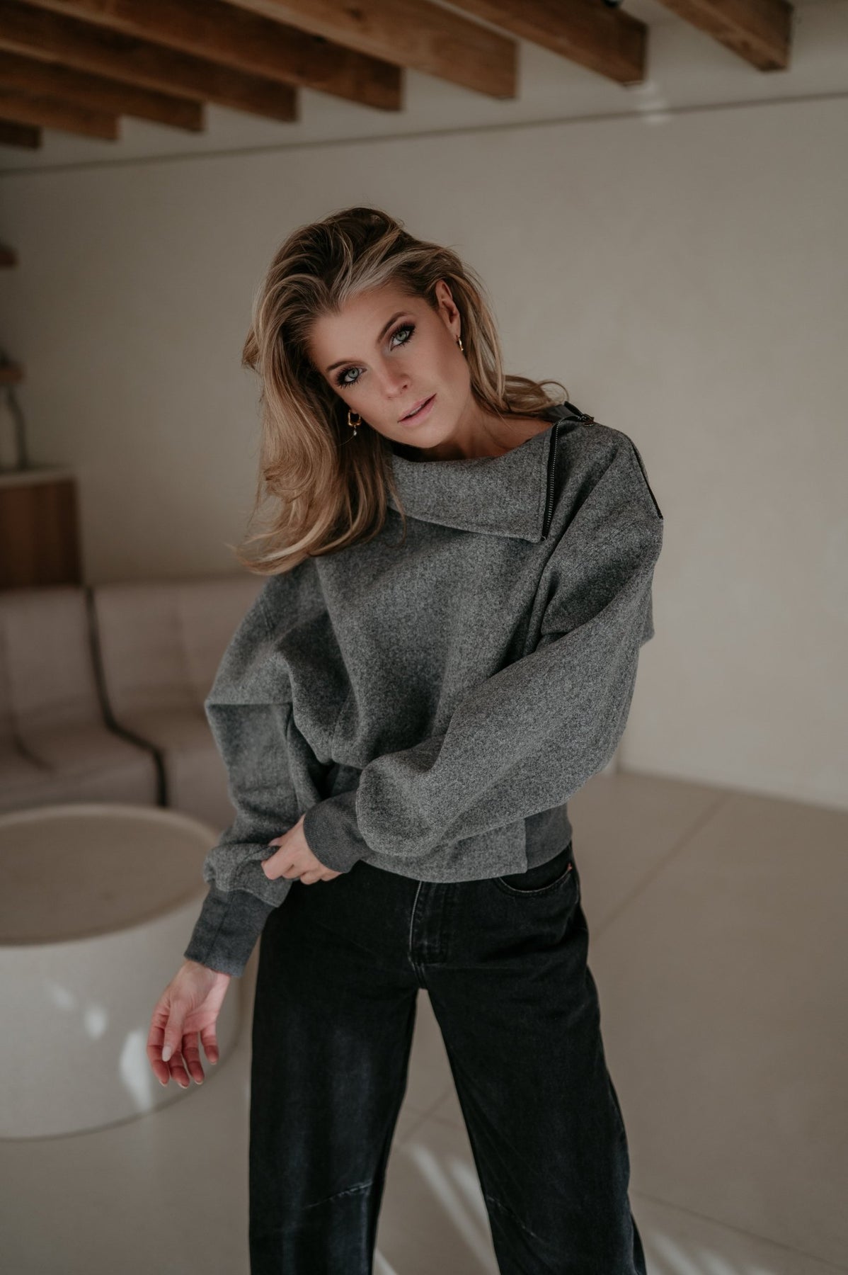 Prachtige grijze trui met een stijlvolle rits aan de kraag.
