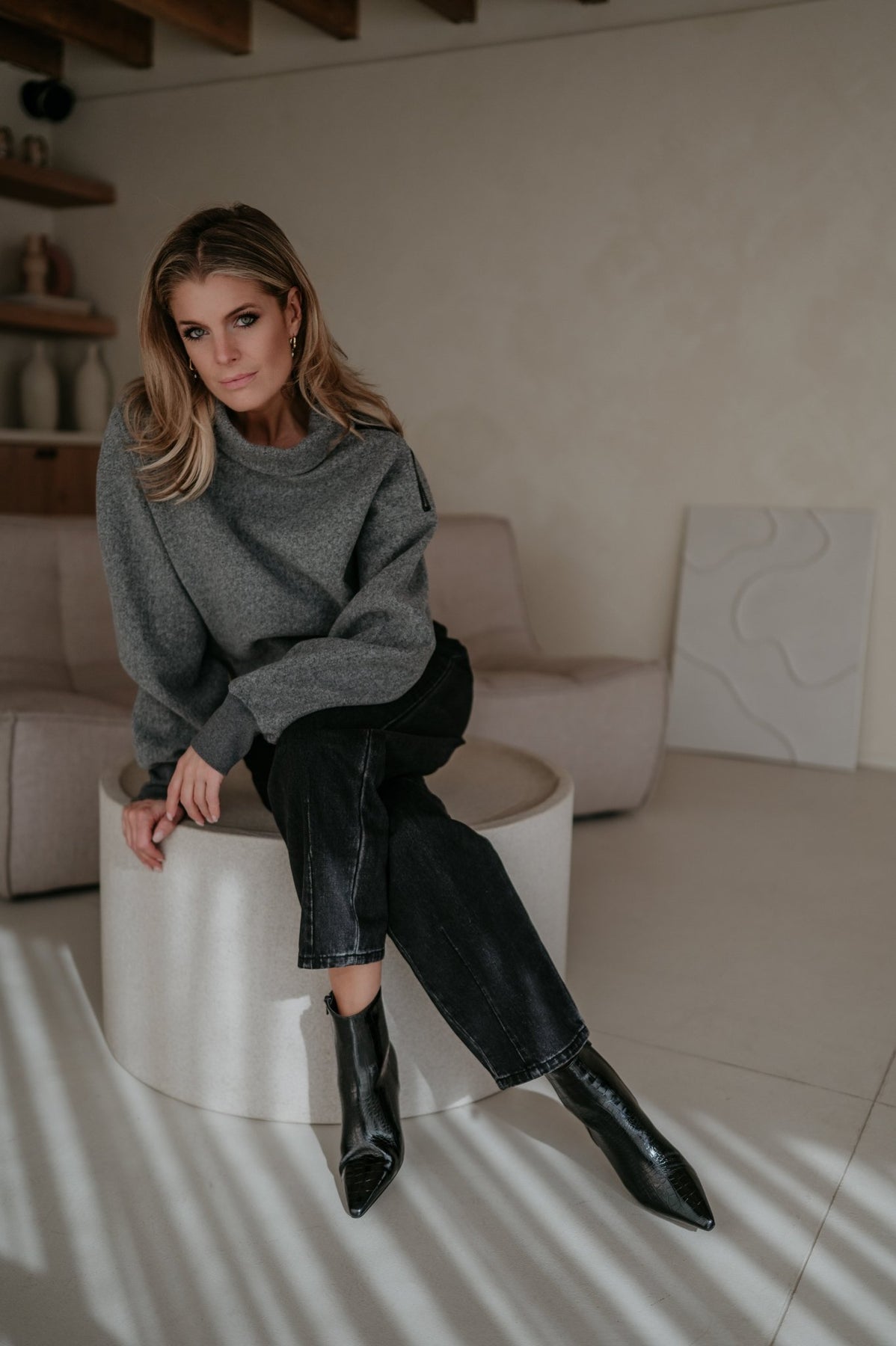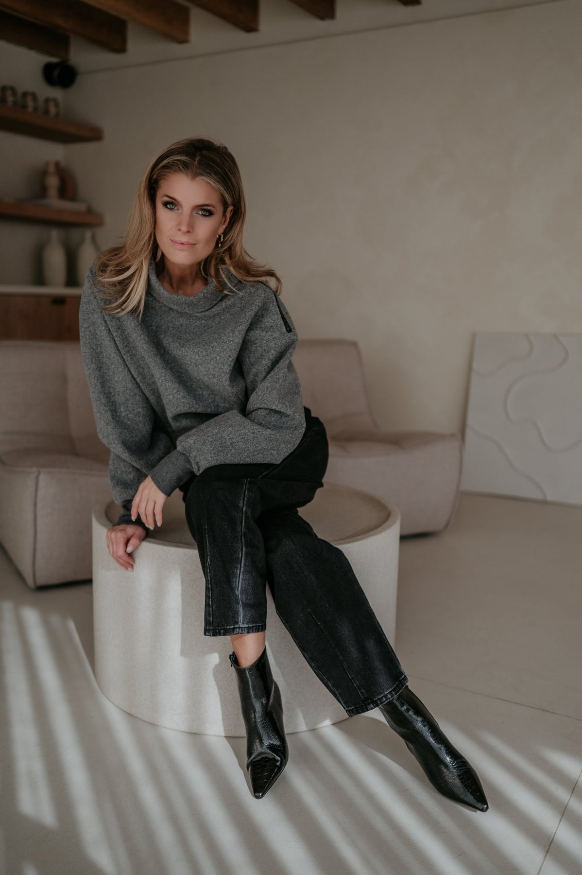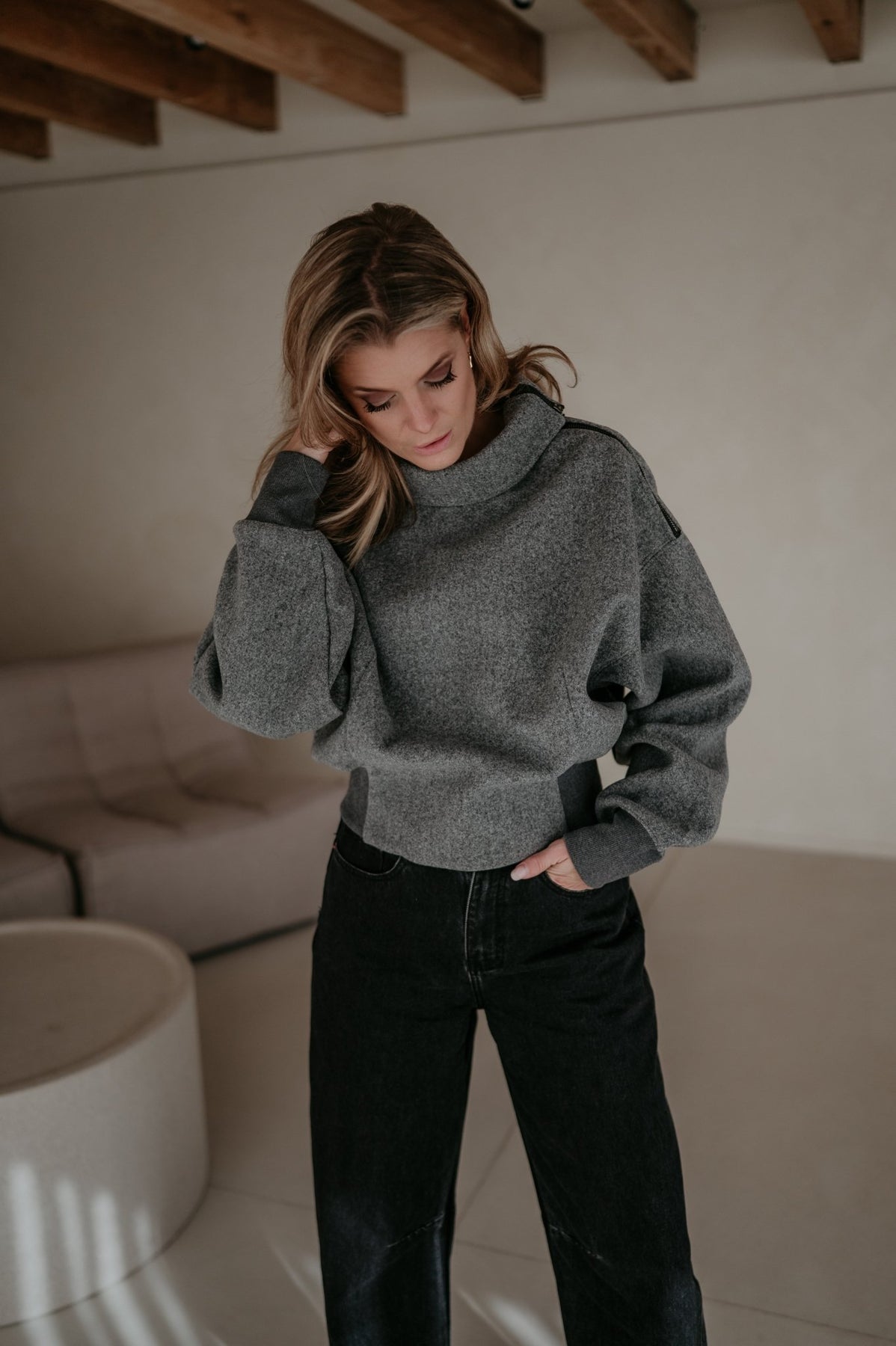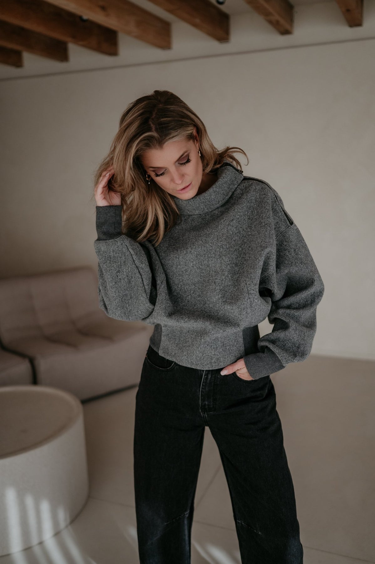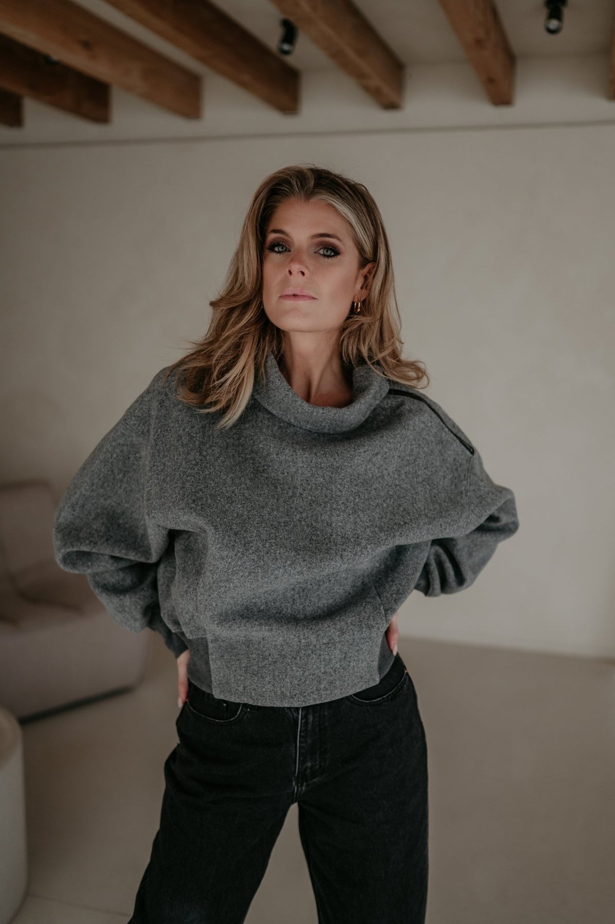 Prachtige grijze trui met een stijlvolle rits aan de kraag.