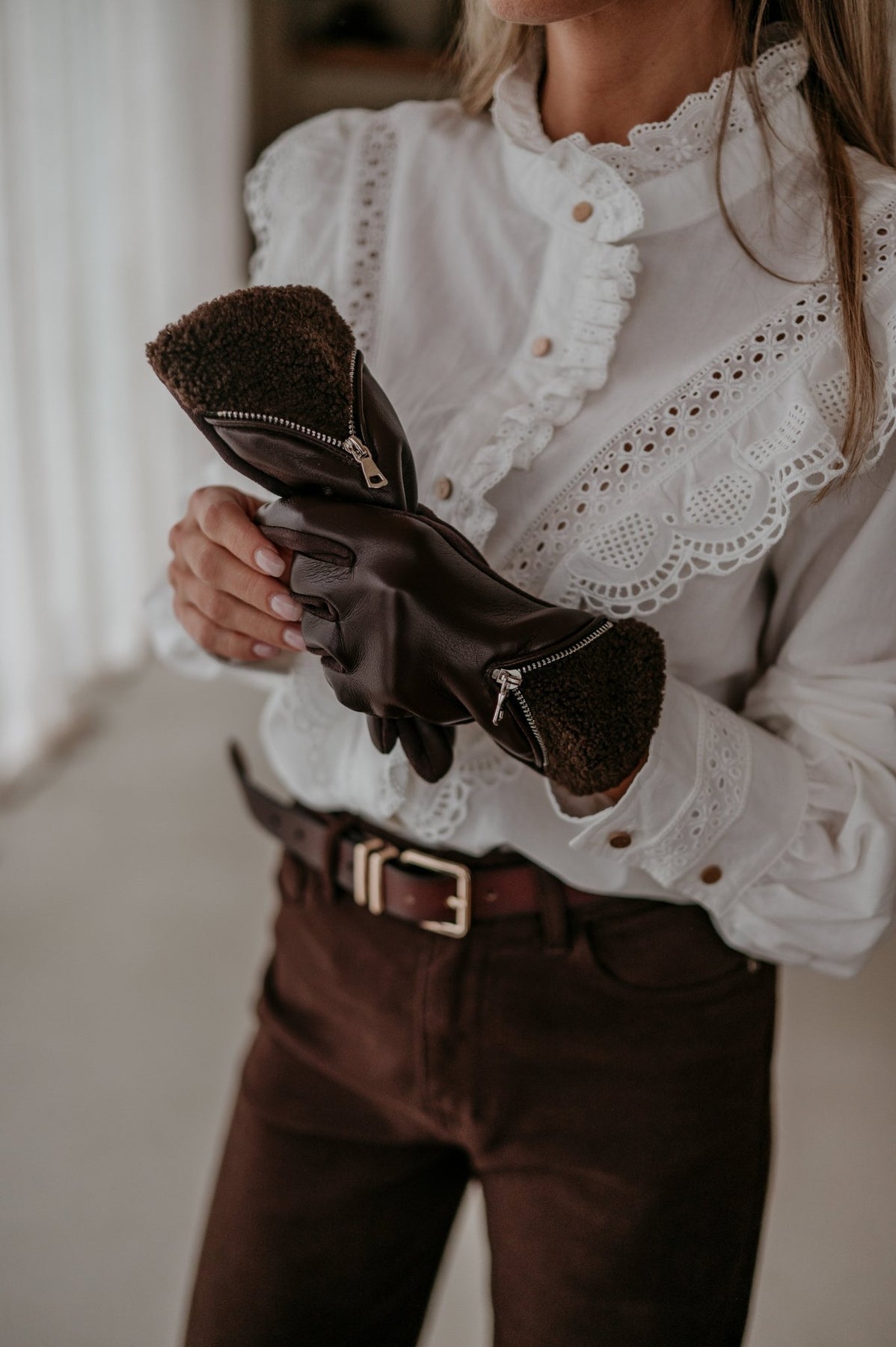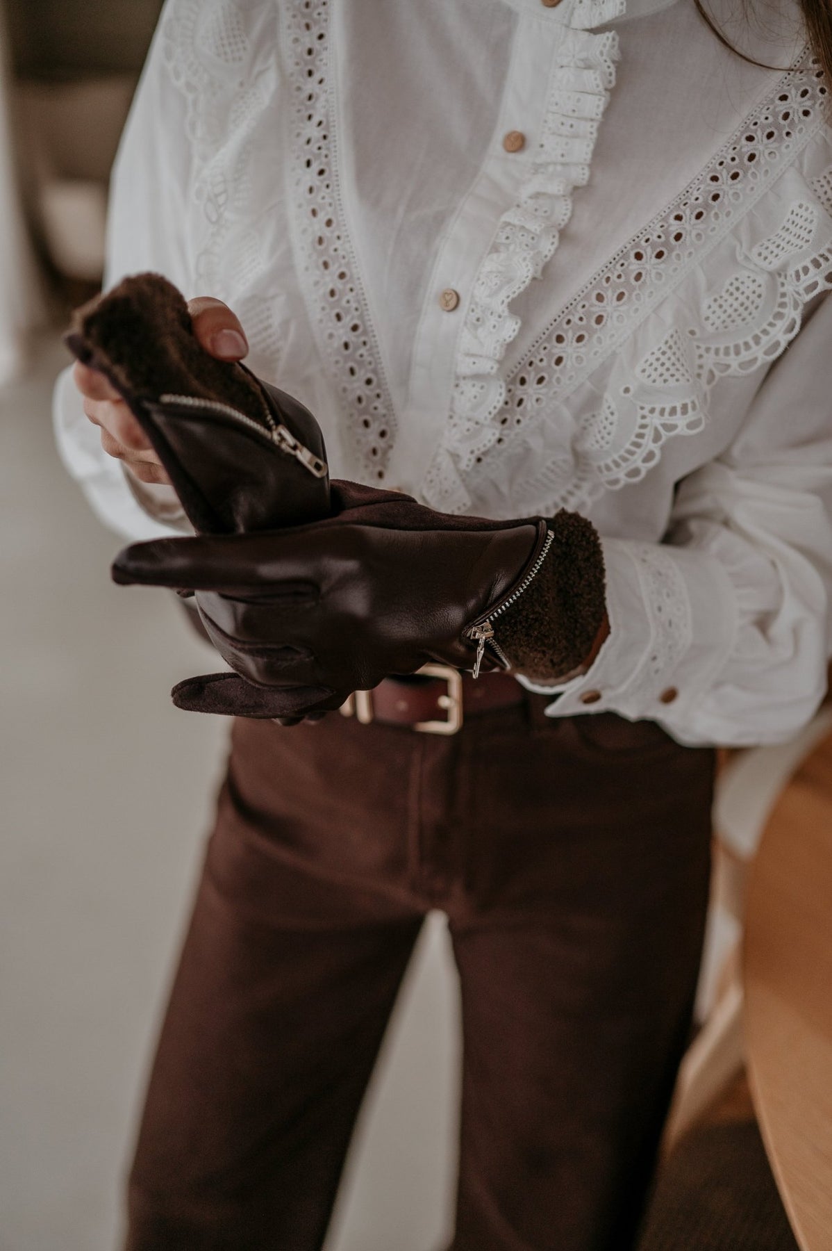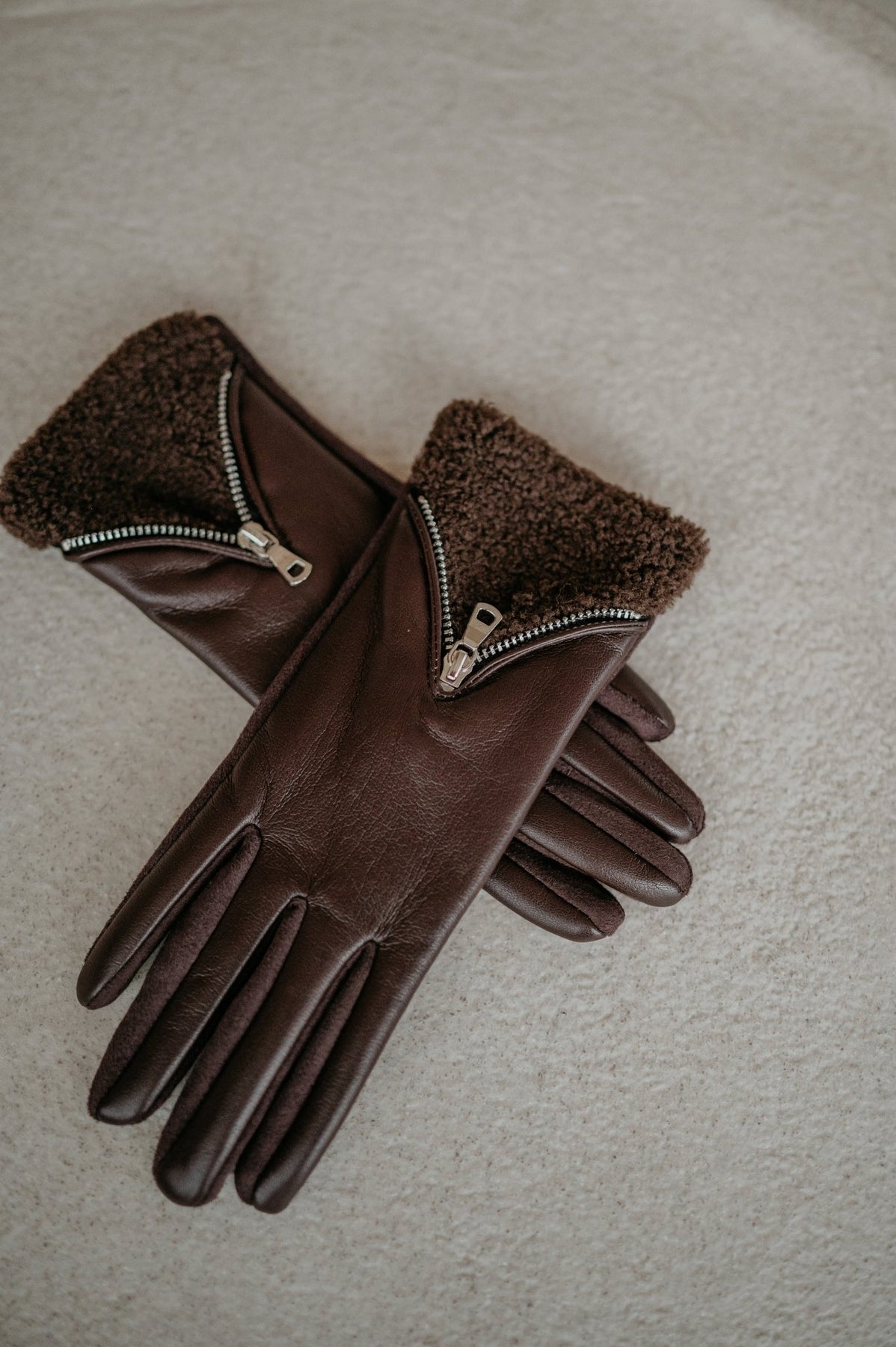 Mooie lederlook handschoenen met een stijlvolle combinatie van glad materiaal aan de bovenkant en zachte stof aan de onderkant.