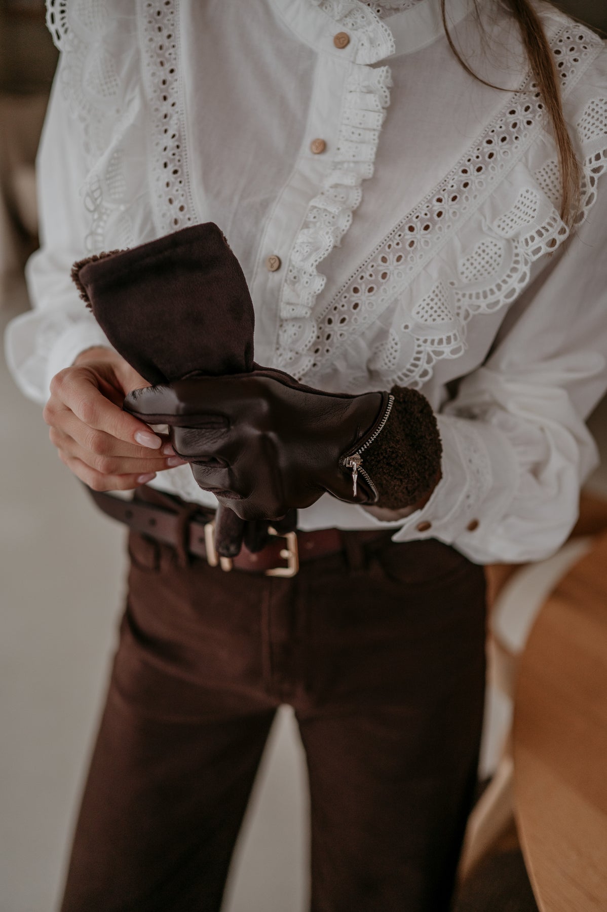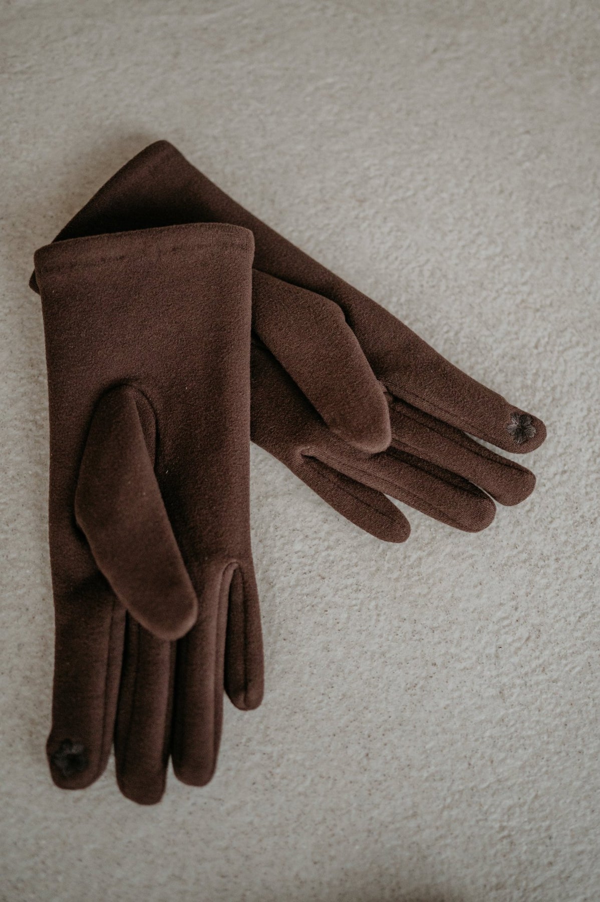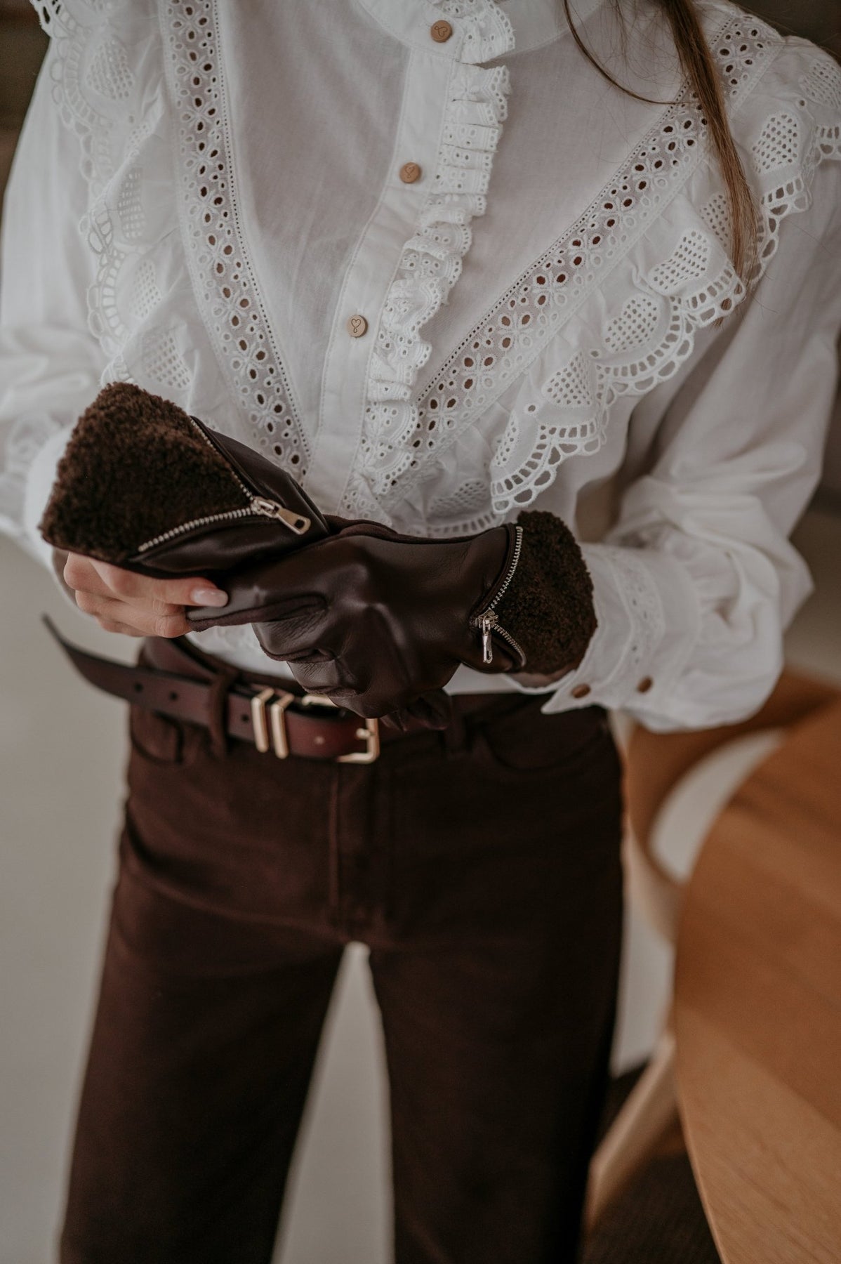 Mooie lederlook handschoenen met een stijlvolle combinatie van glad materiaal aan de bovenkant en zachte stof aan de onderkant.
