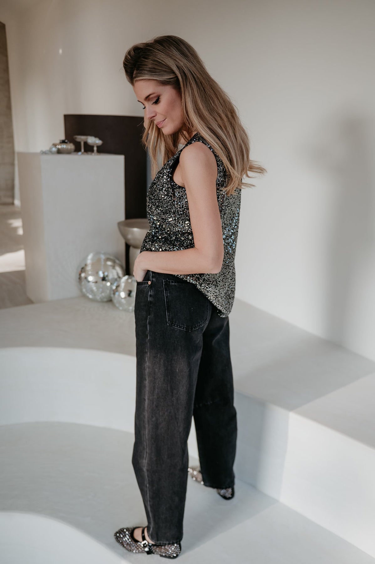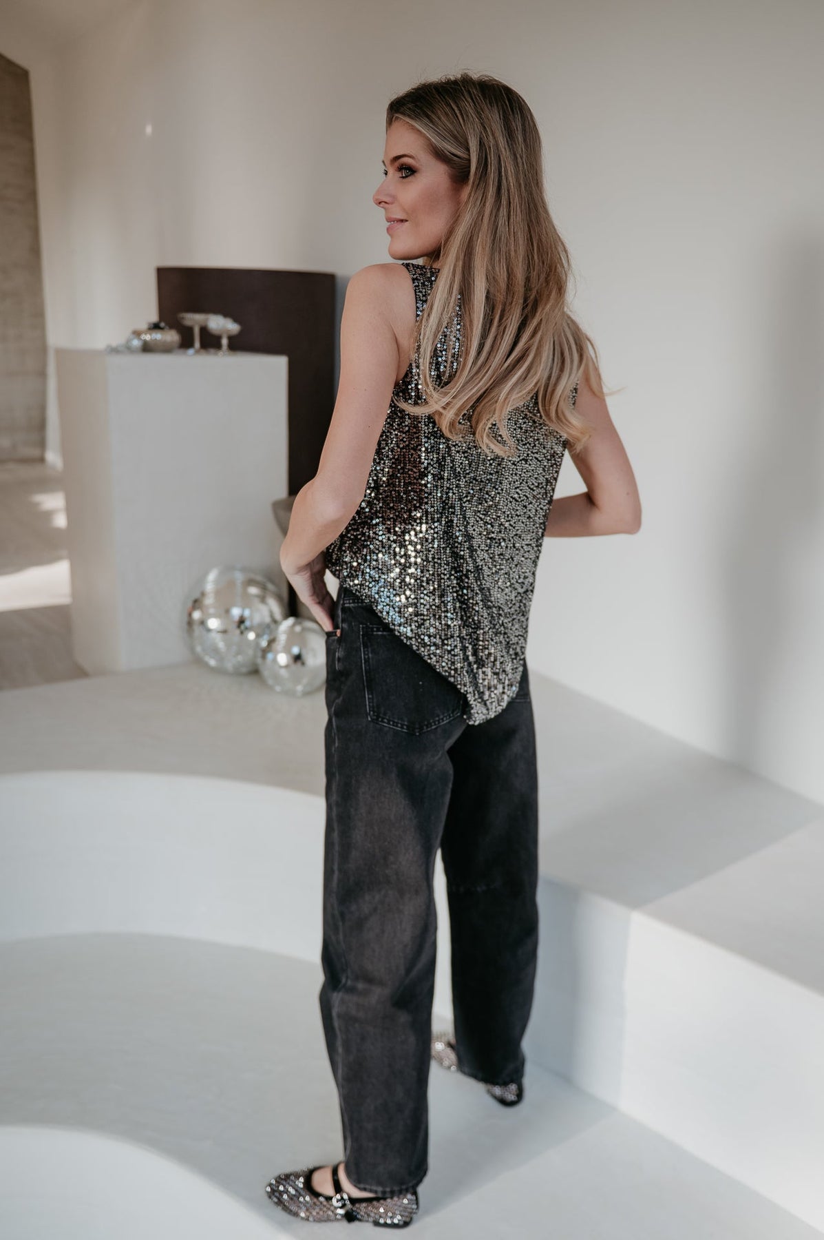 Dit glitter topje is een absolute must-have voor een avond vol glamour.