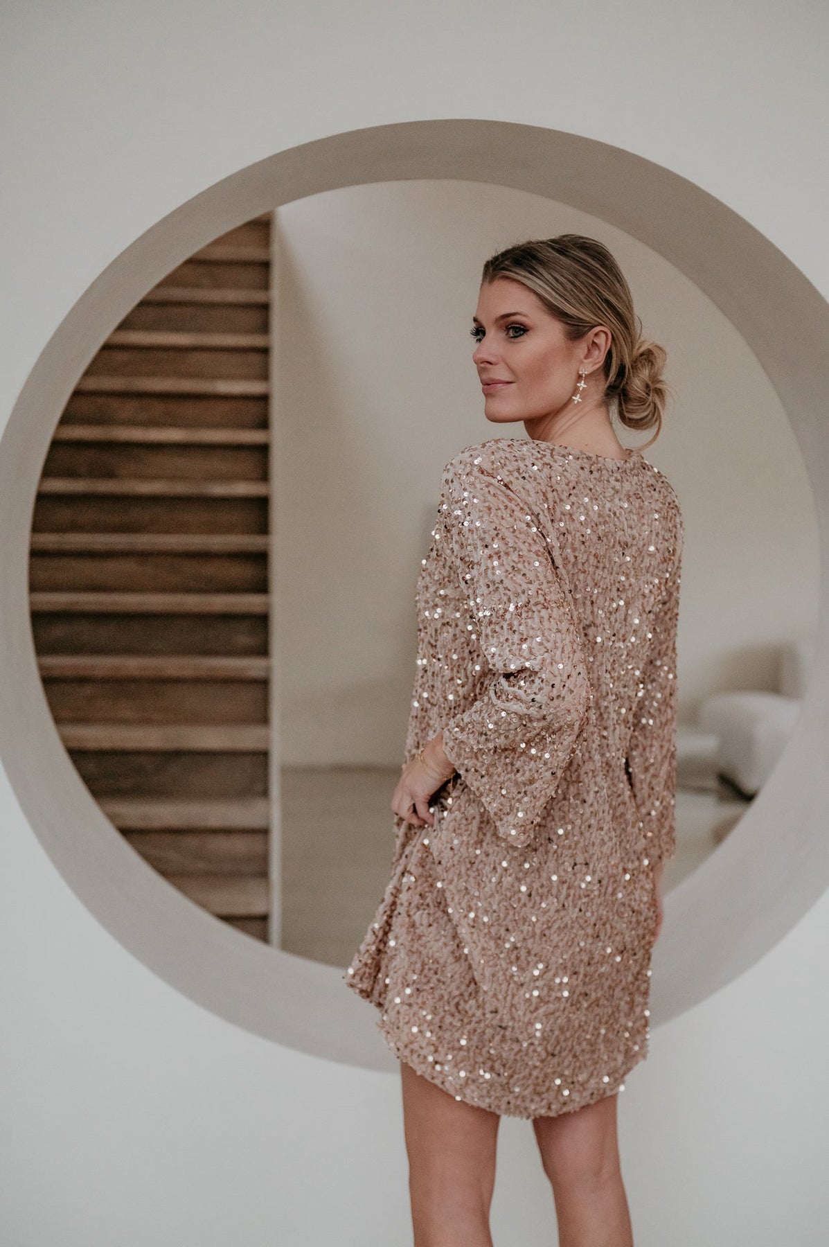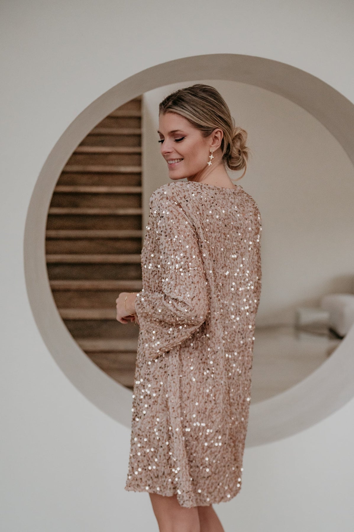 Dit beige glitter kleedje is de perfecte balans tussen elegantie en glamour.