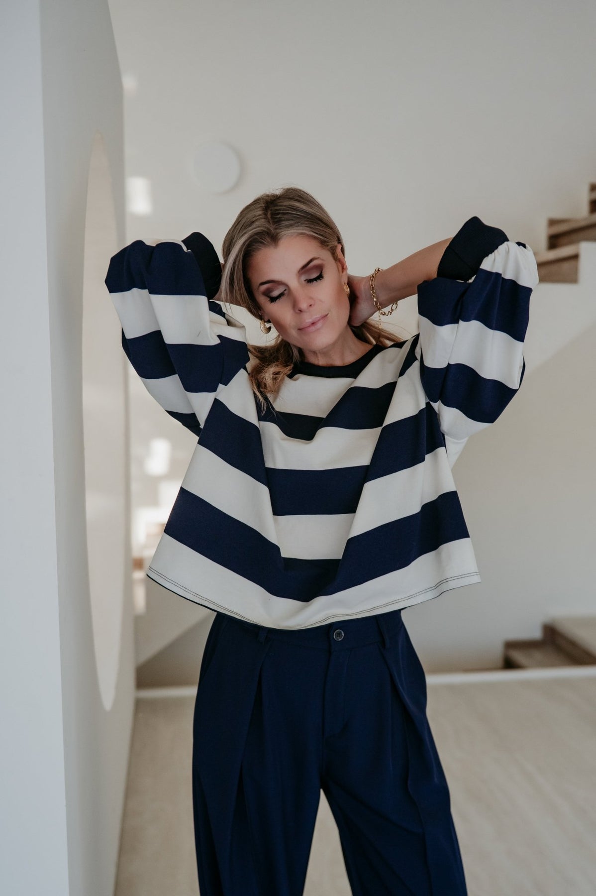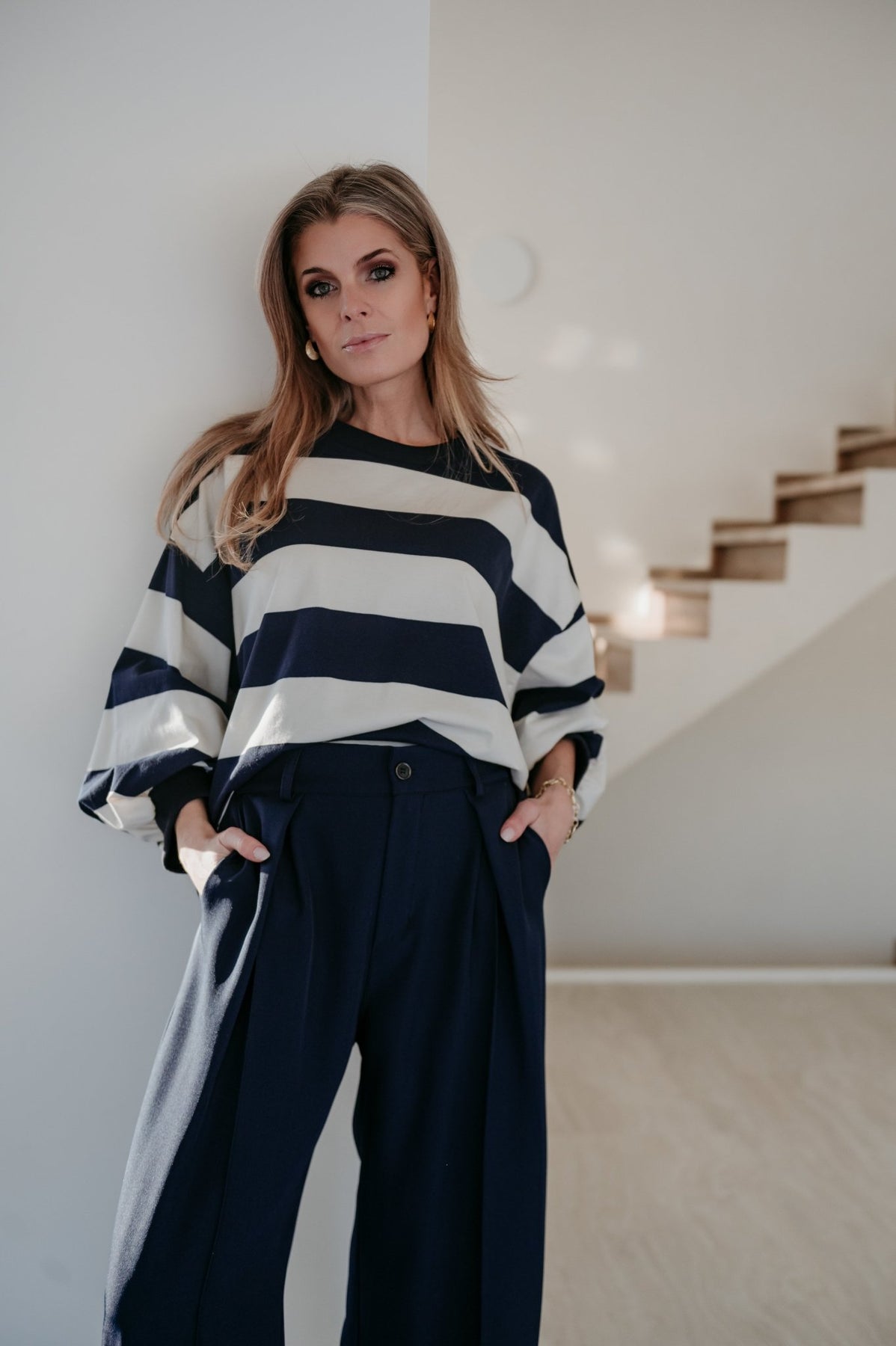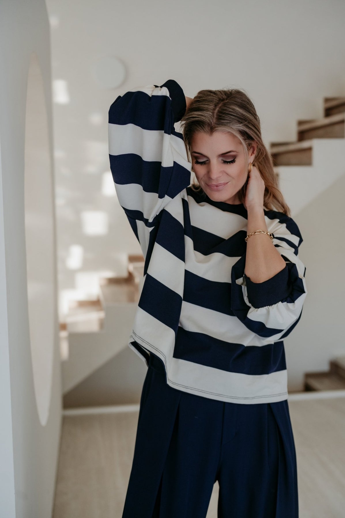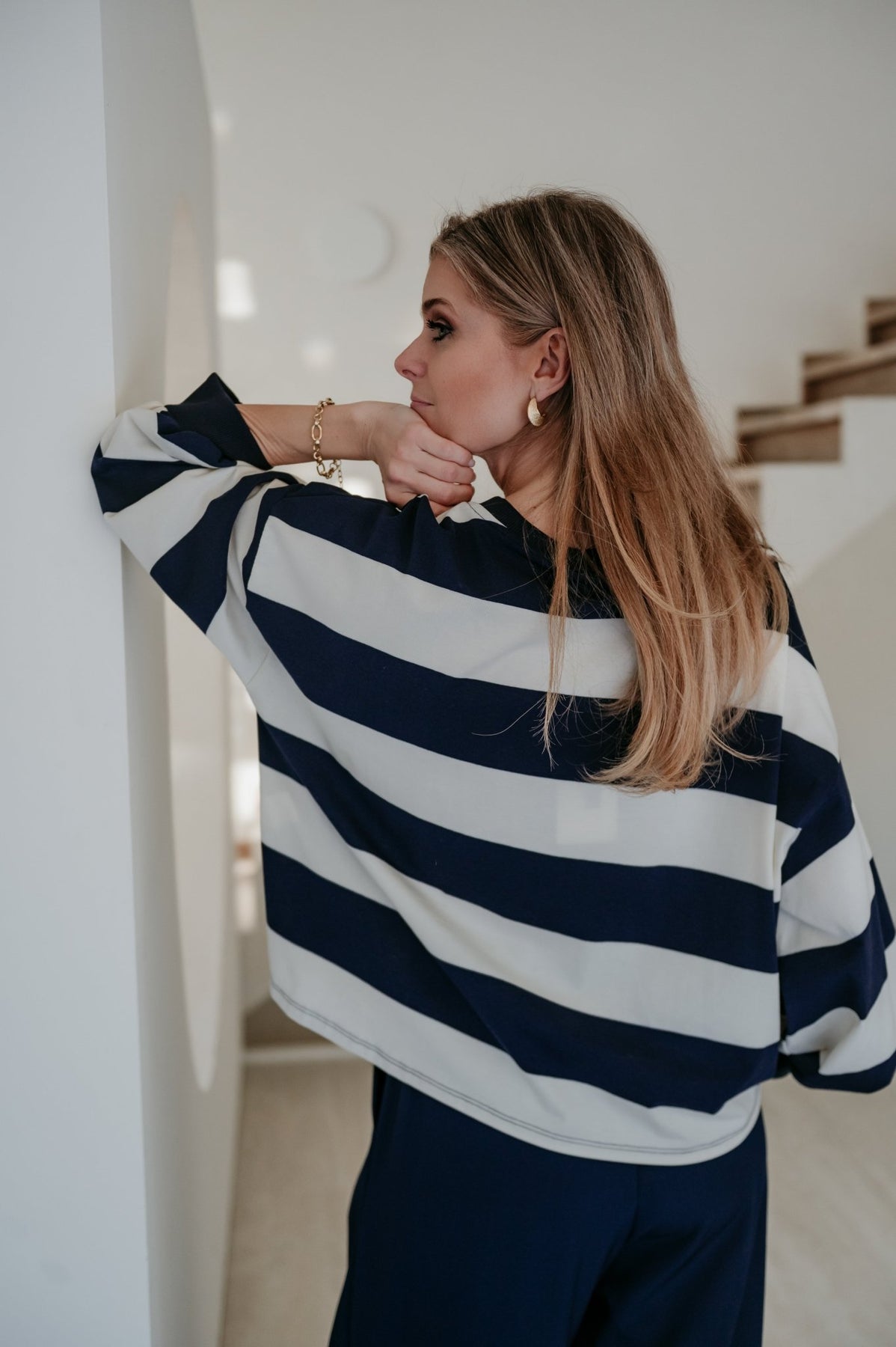 Heel mooie dunnere sweater met navy en witte strepen.