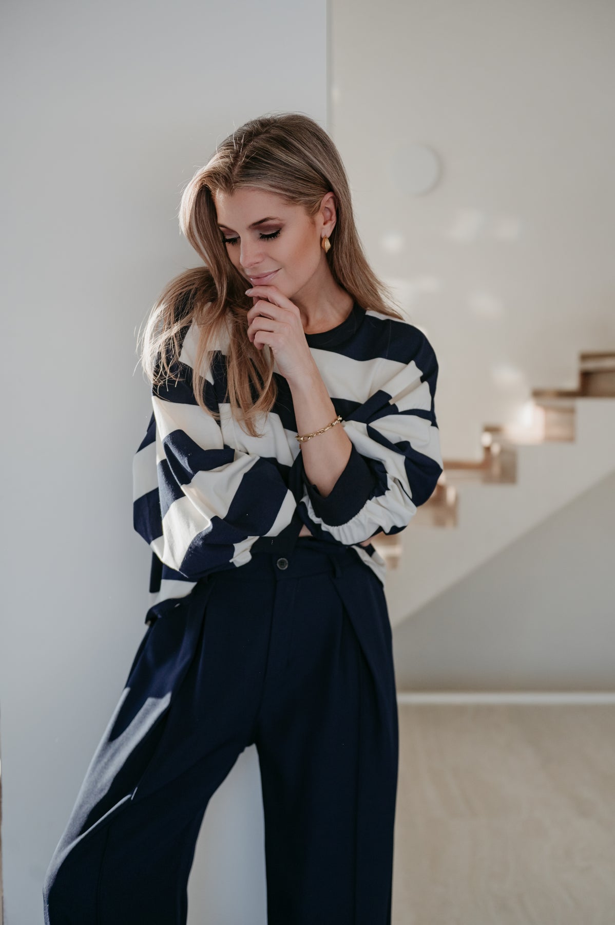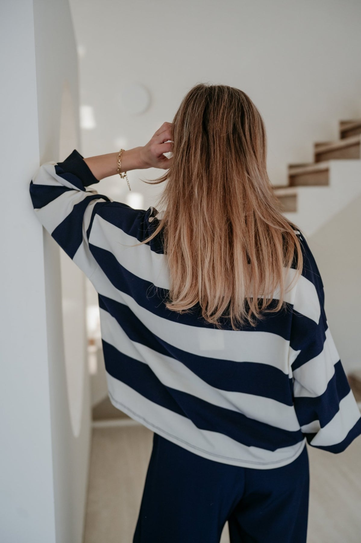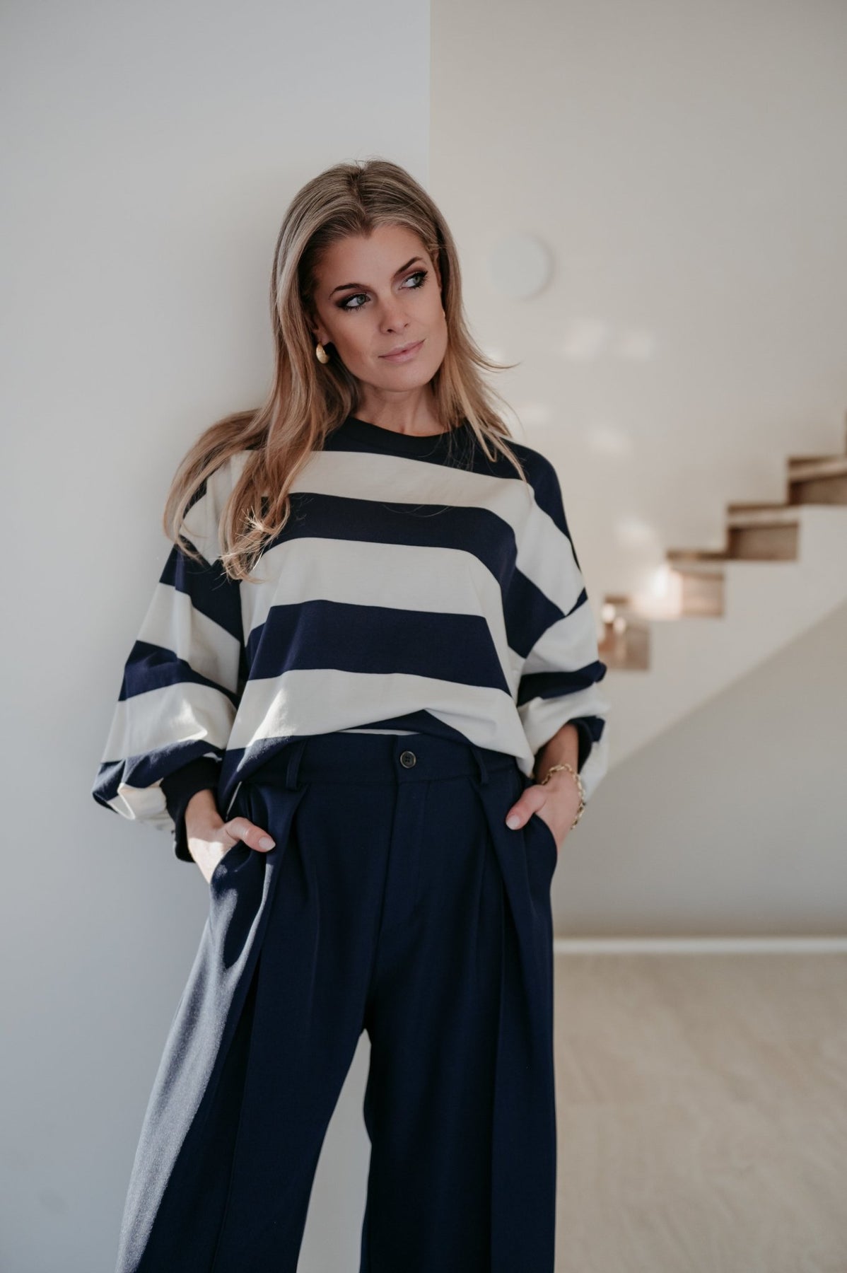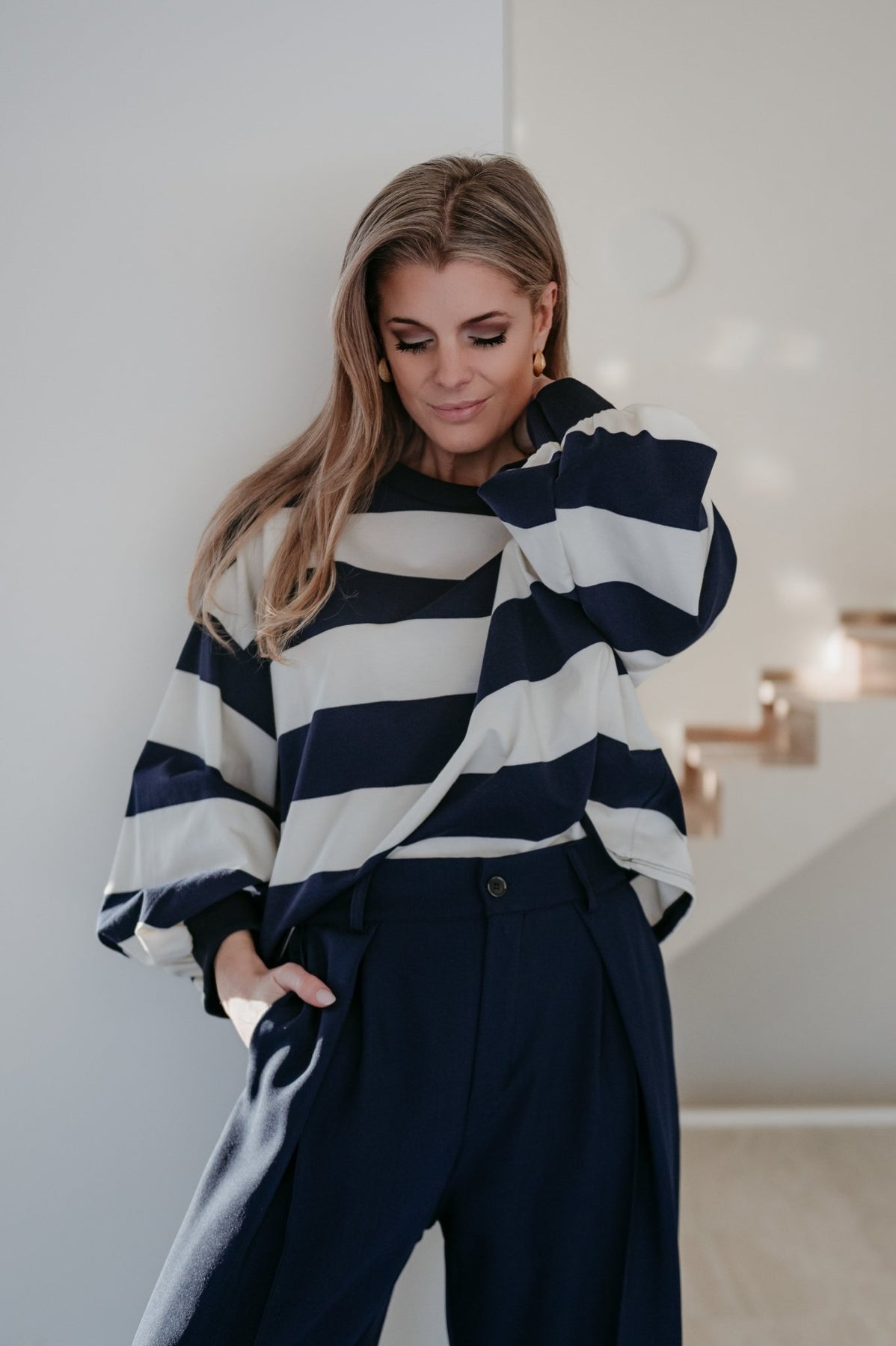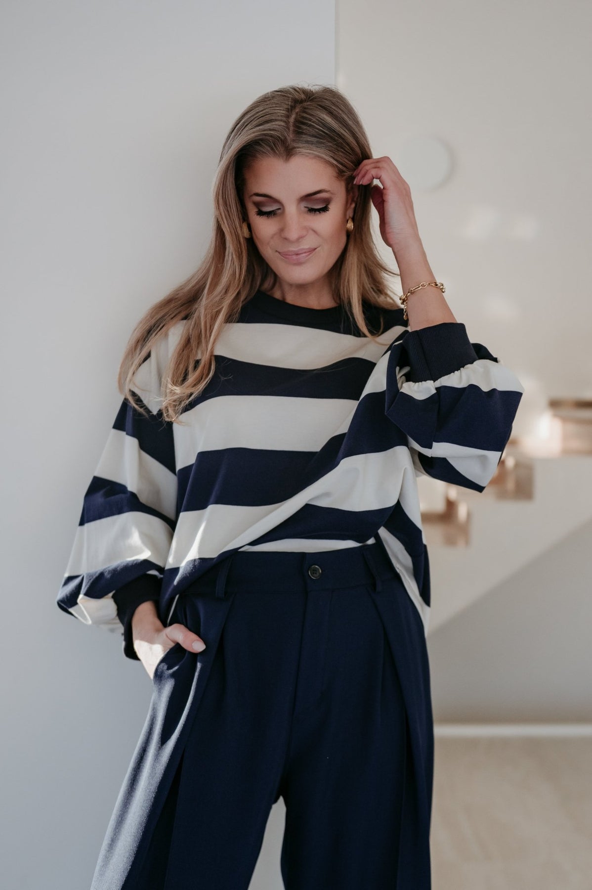 Heel mooie dunnere sweater met navy en witte strepen.