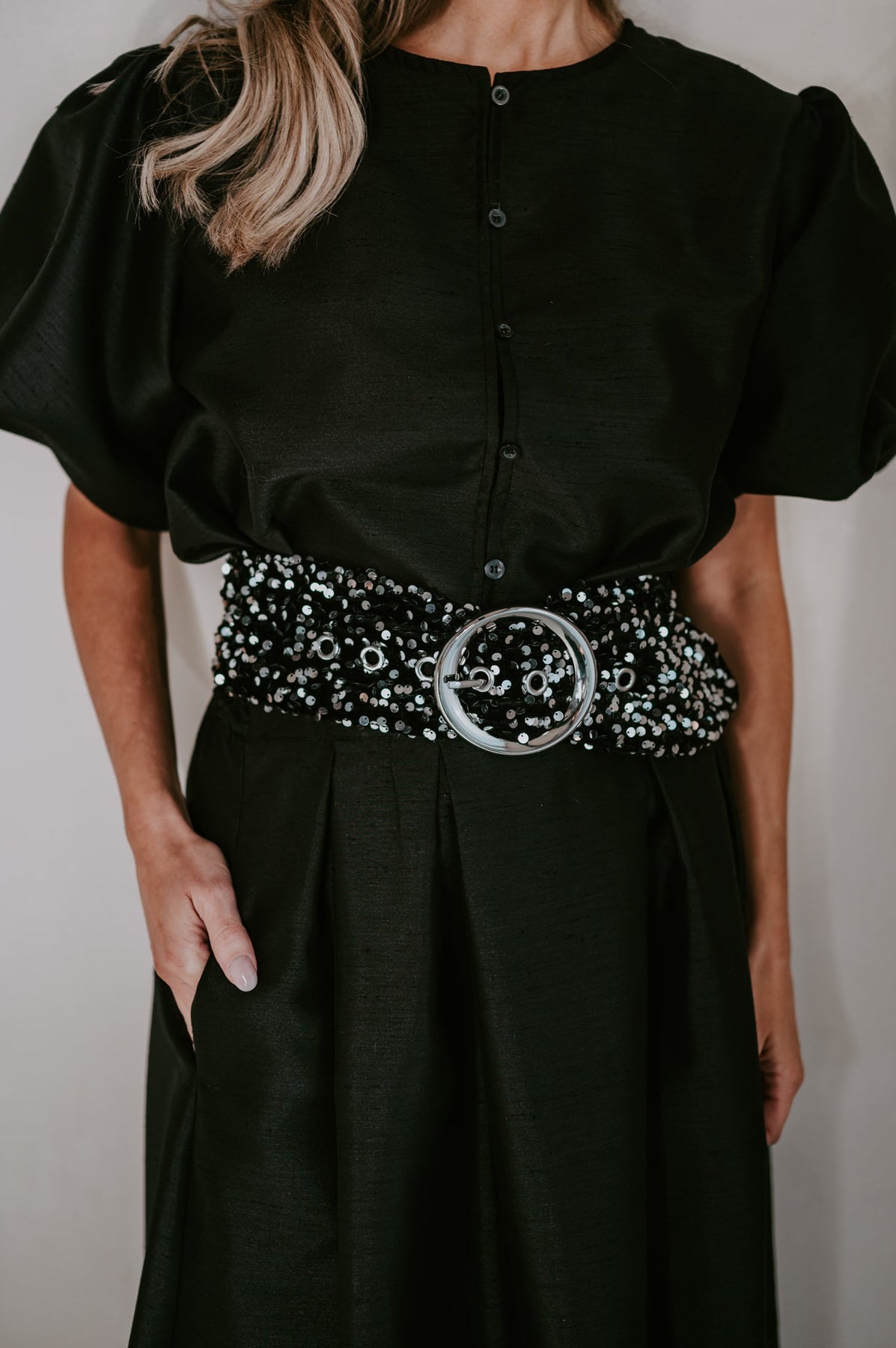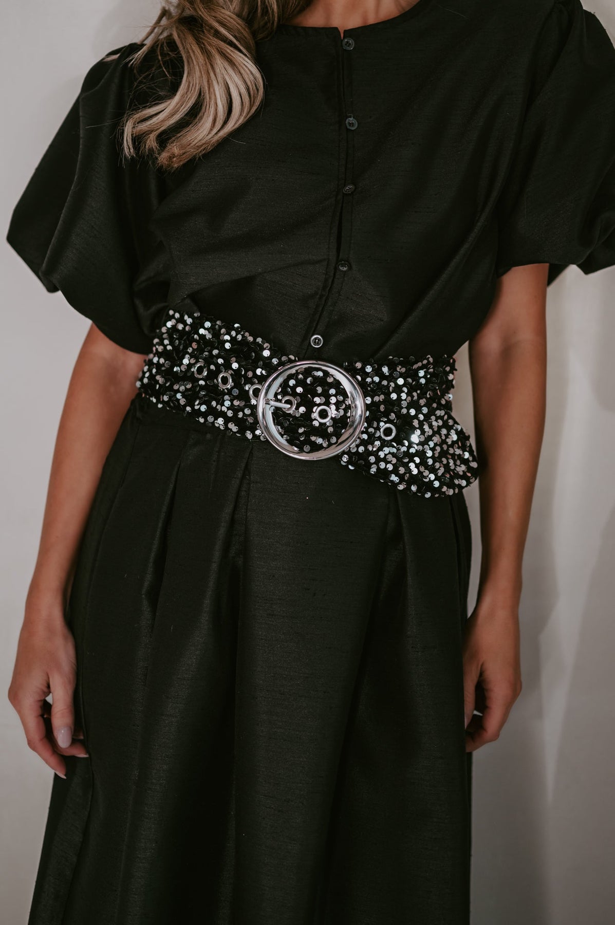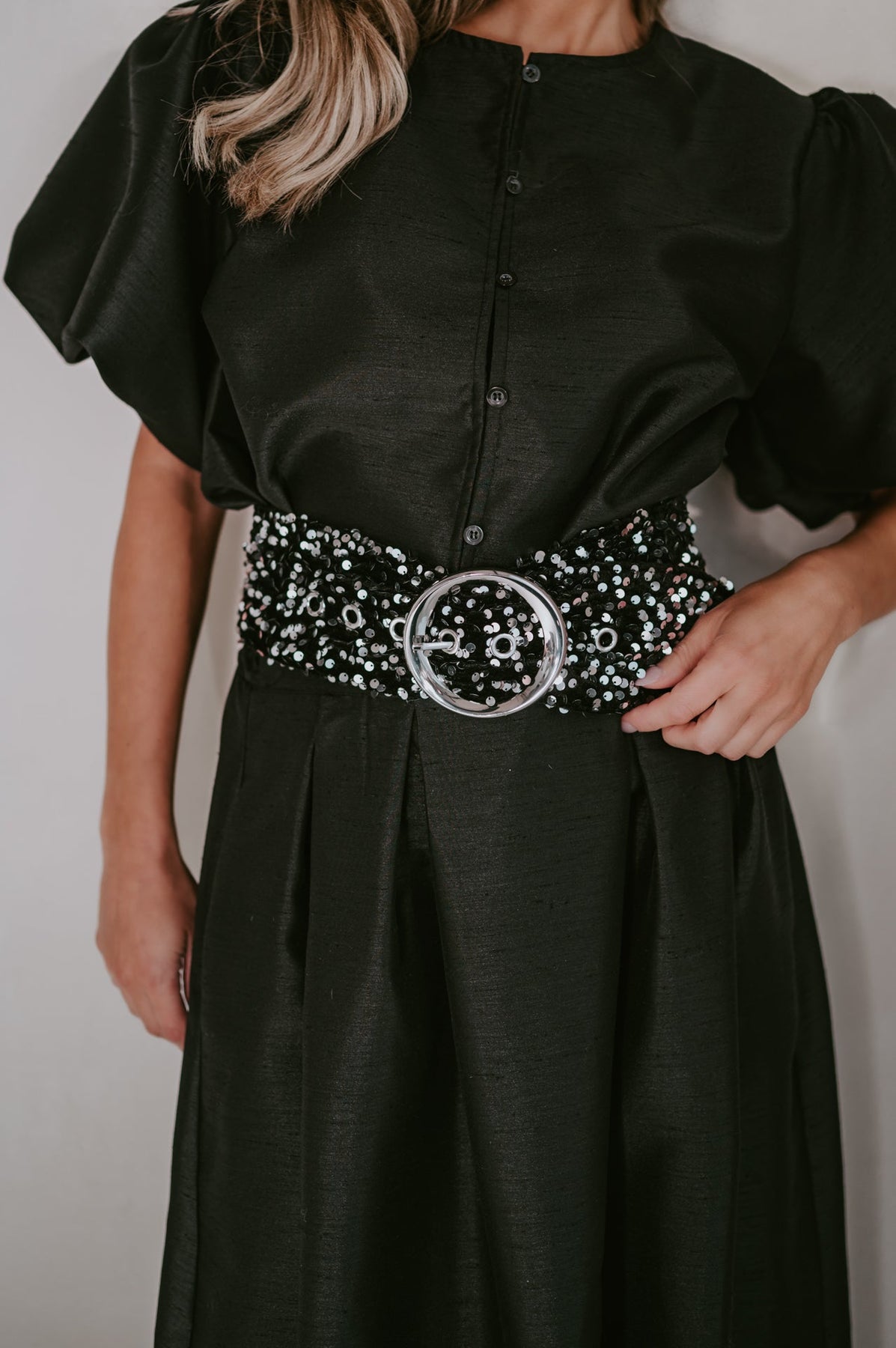 Deze brede glitterriem is de perfecte manier om je outfit net dat beetje extra glamour te geven.