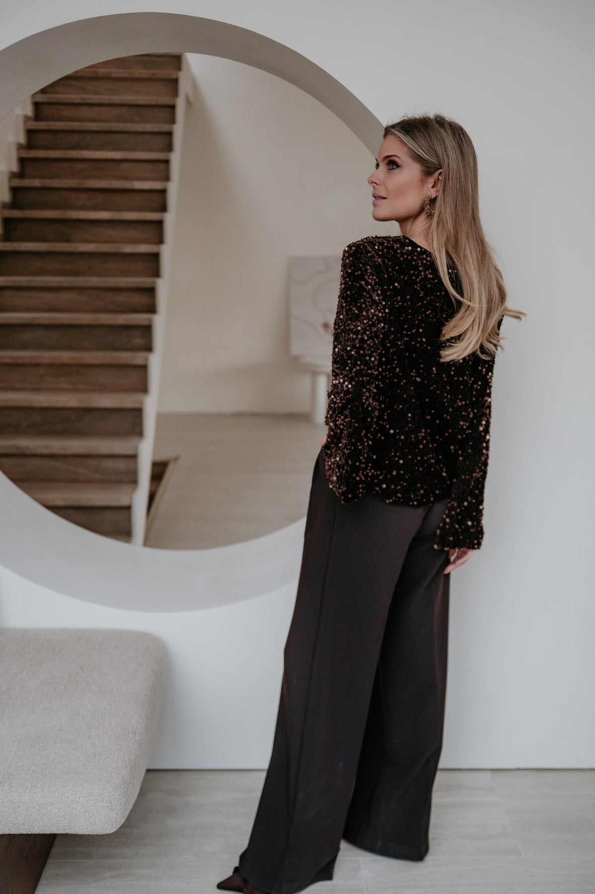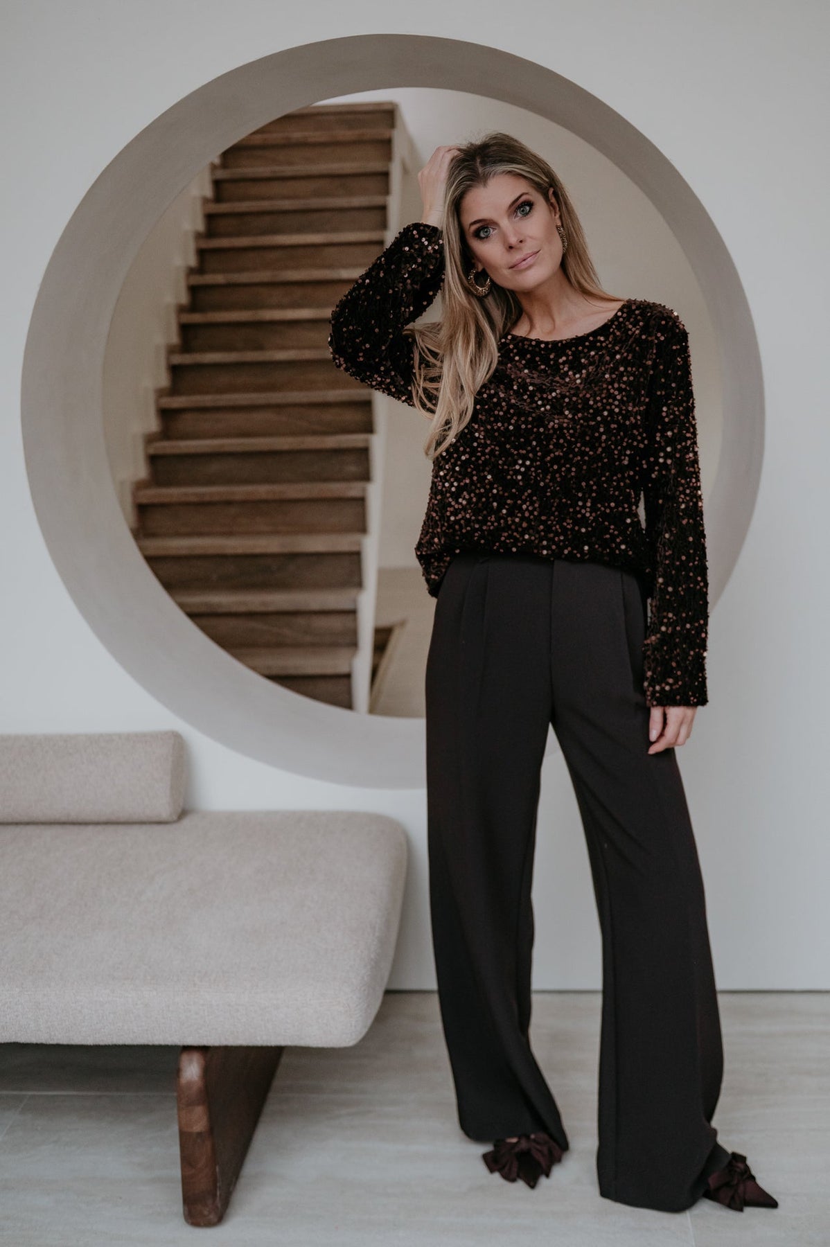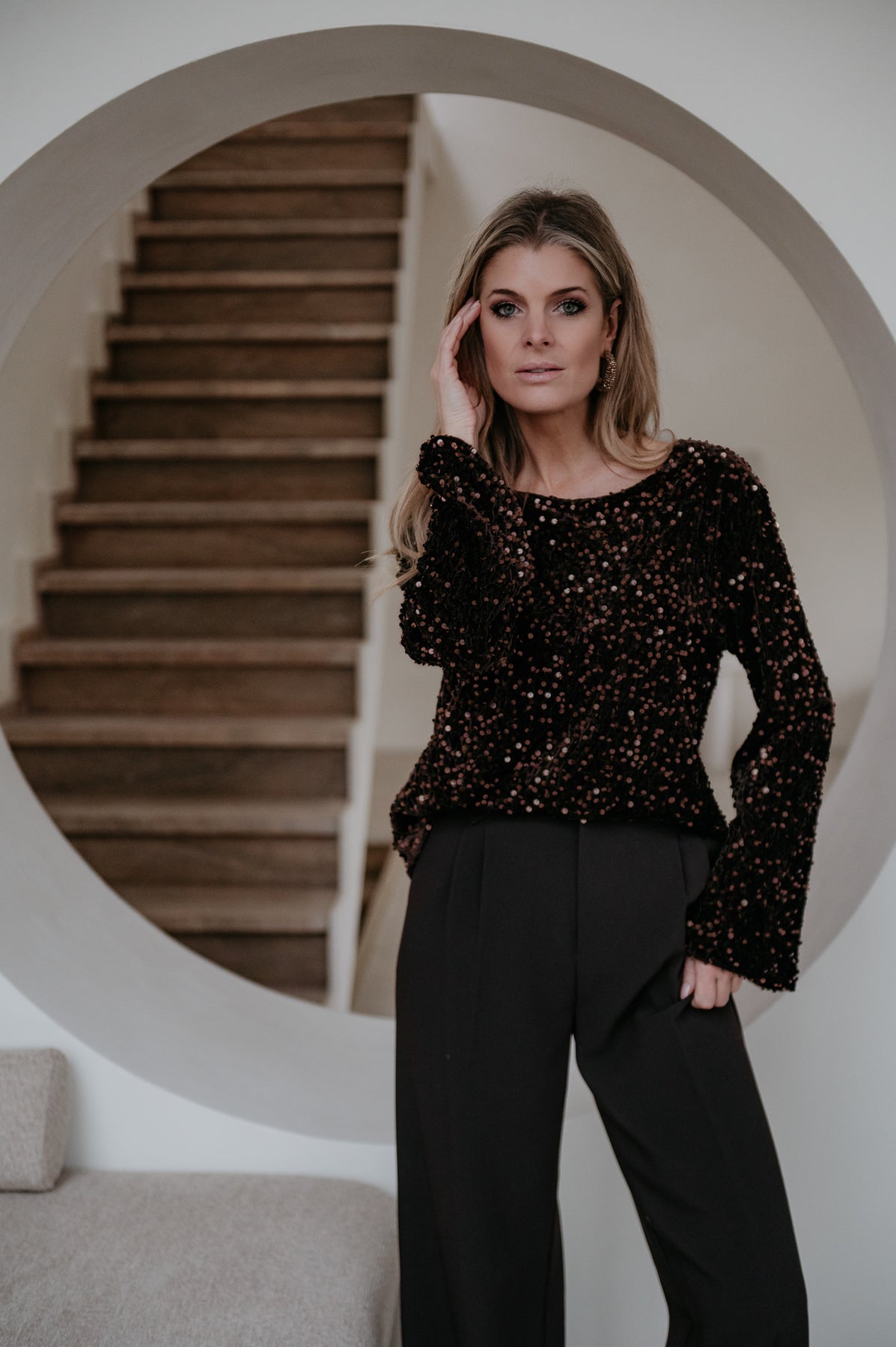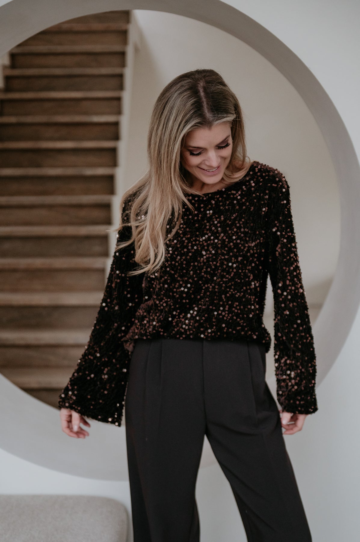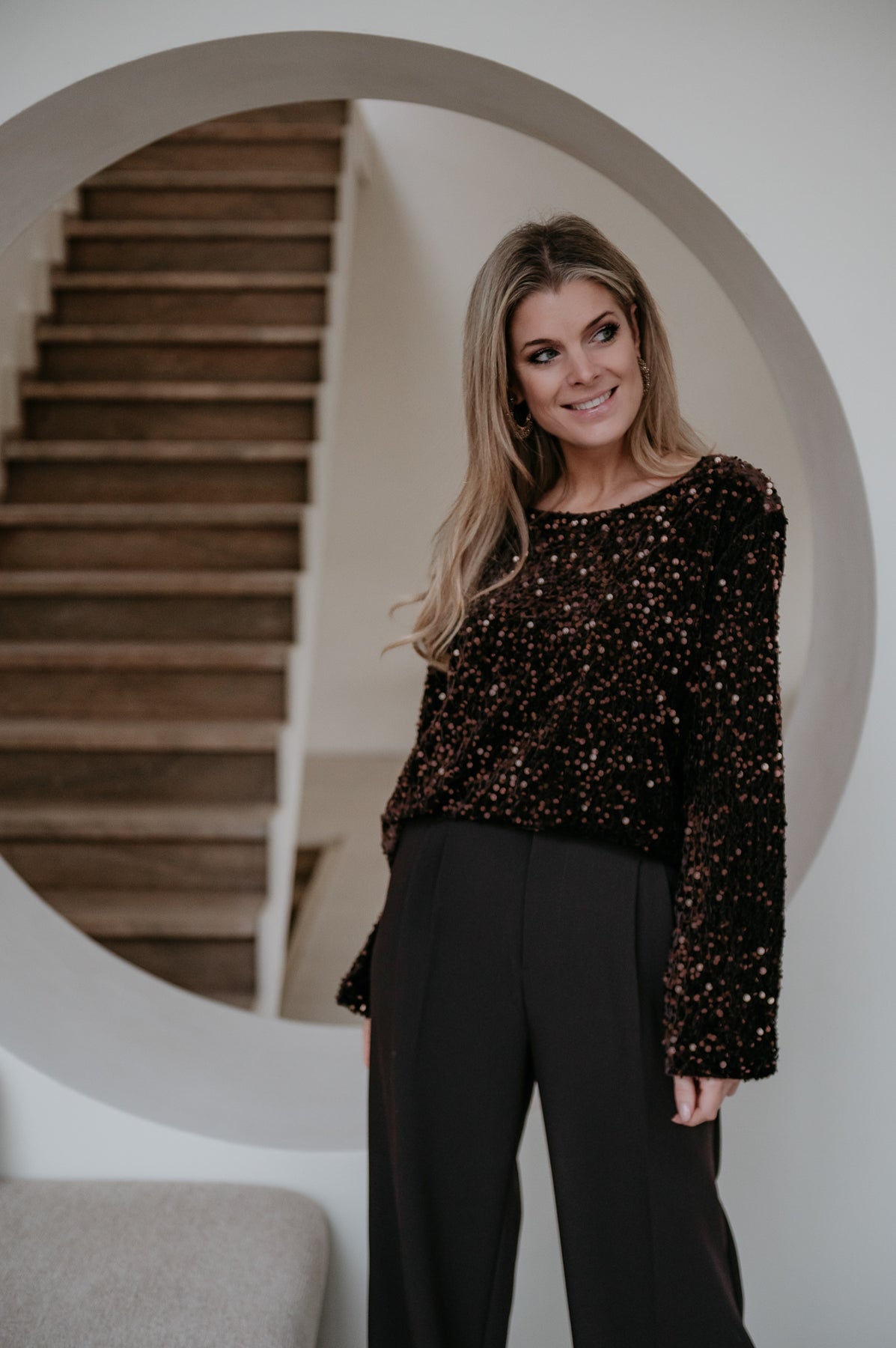 Een heel tof glittertopje met lange mouwen dat direct een feestelijke uitstraling geeft.
