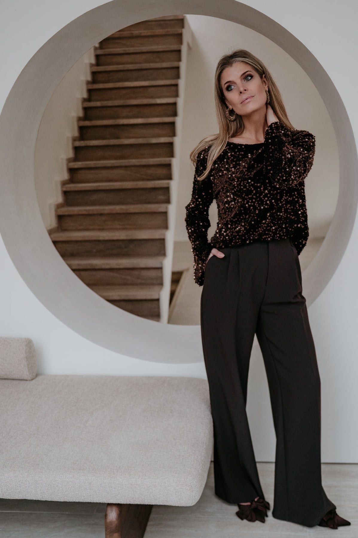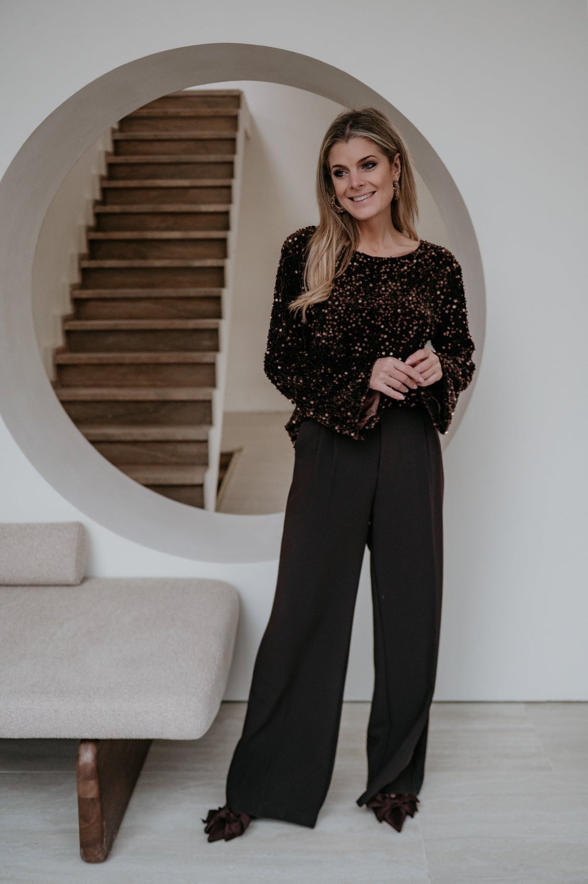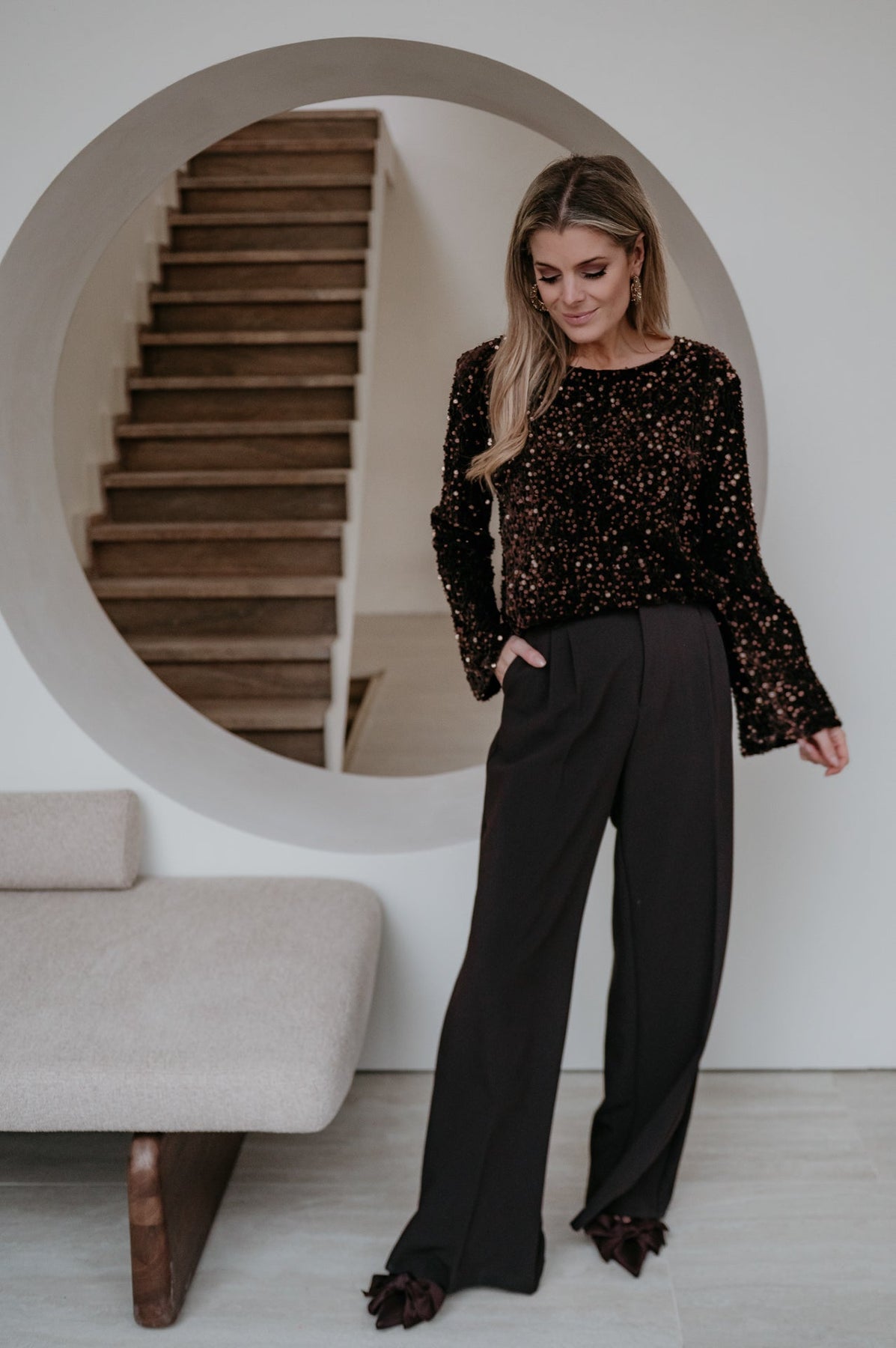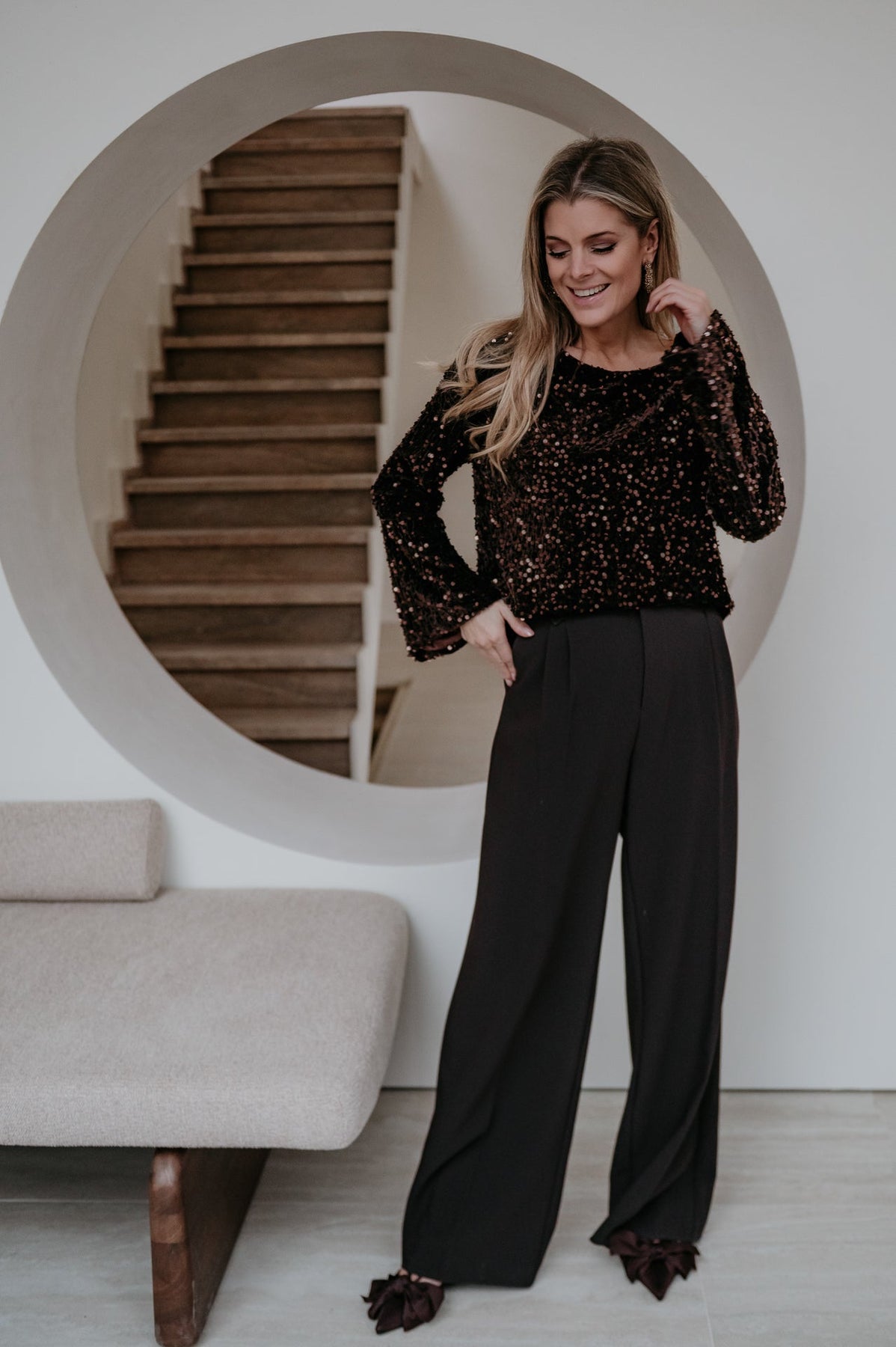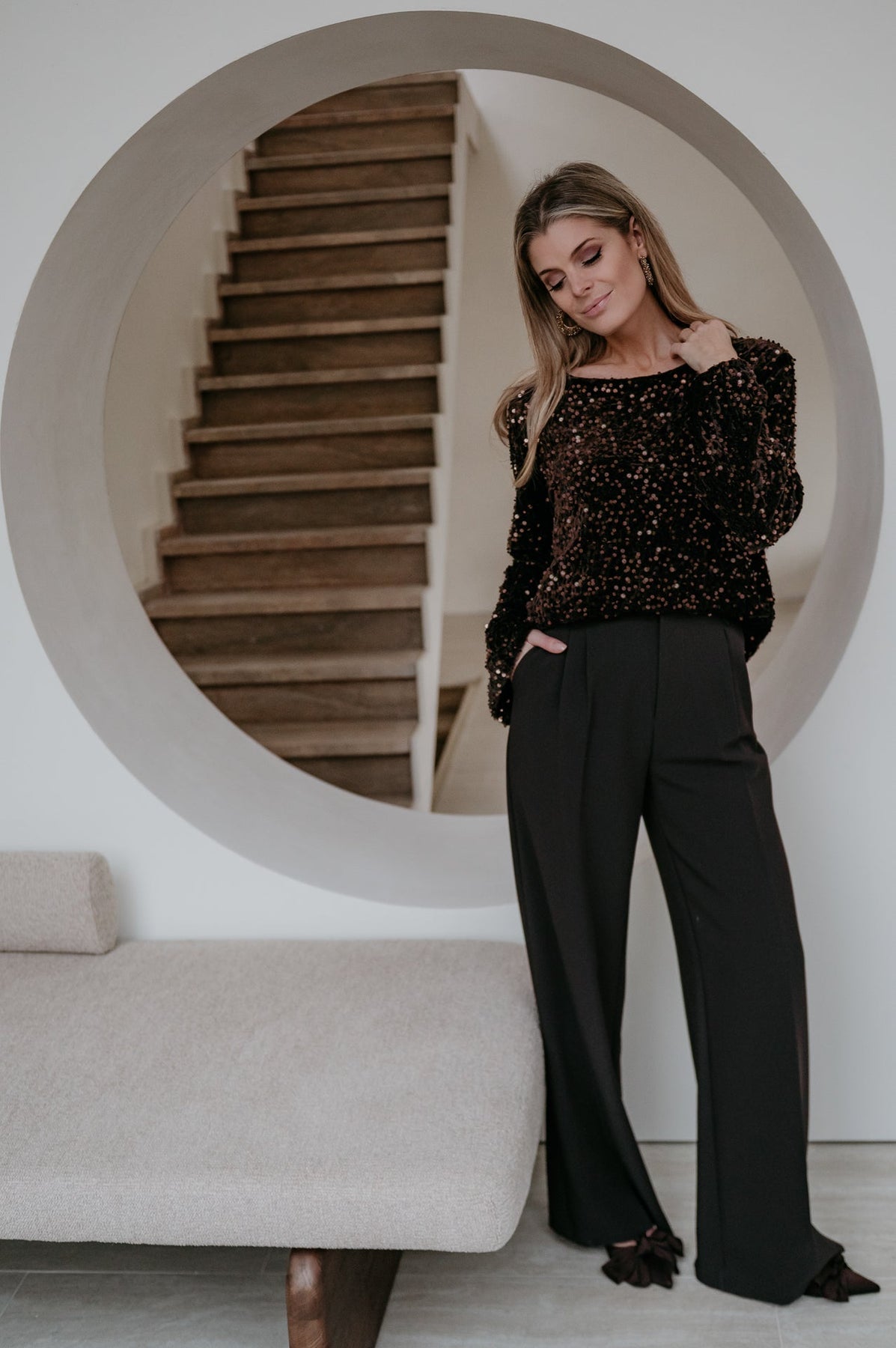 Een heel tof glittertopje met lange mouwen dat direct een feestelijke uitstraling geeft.