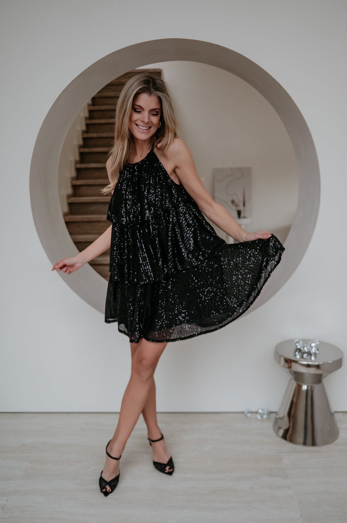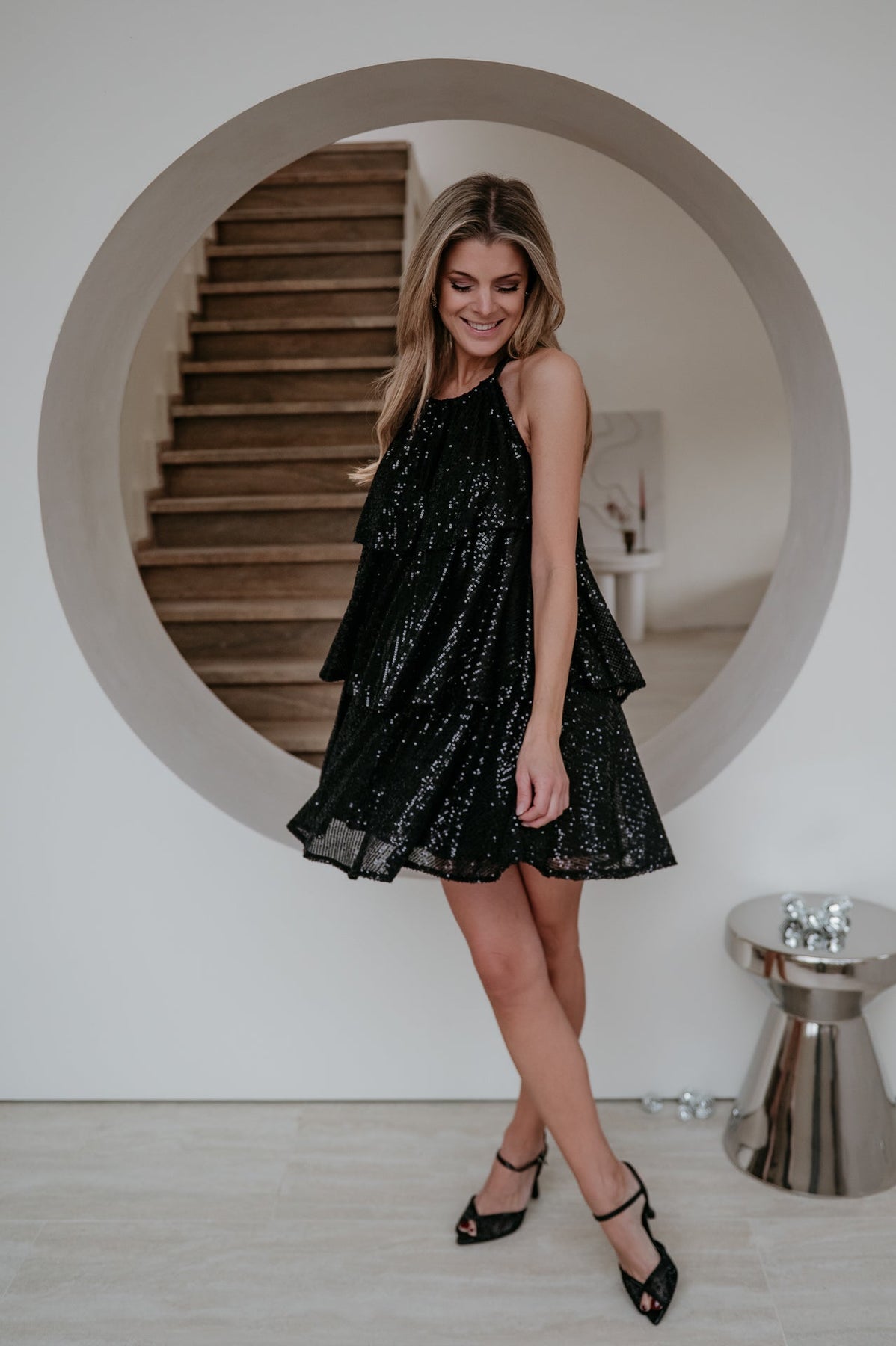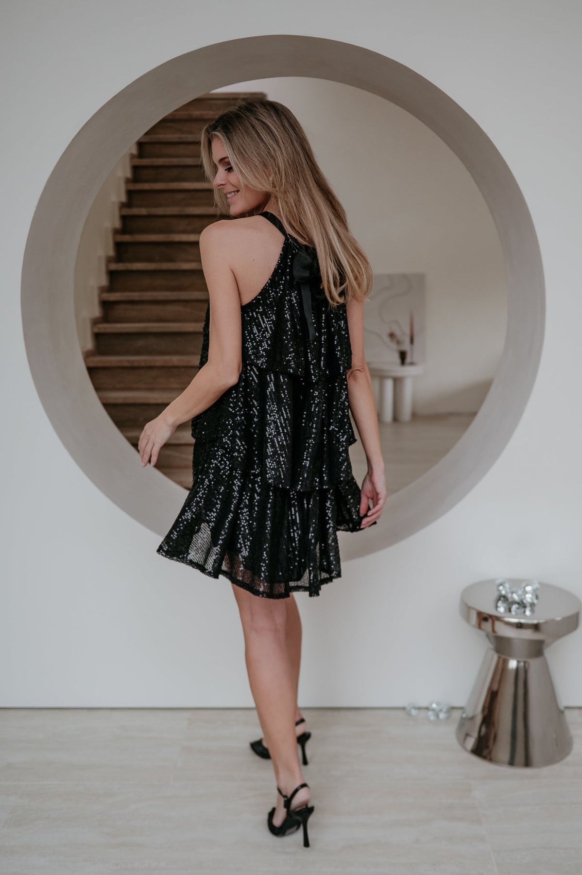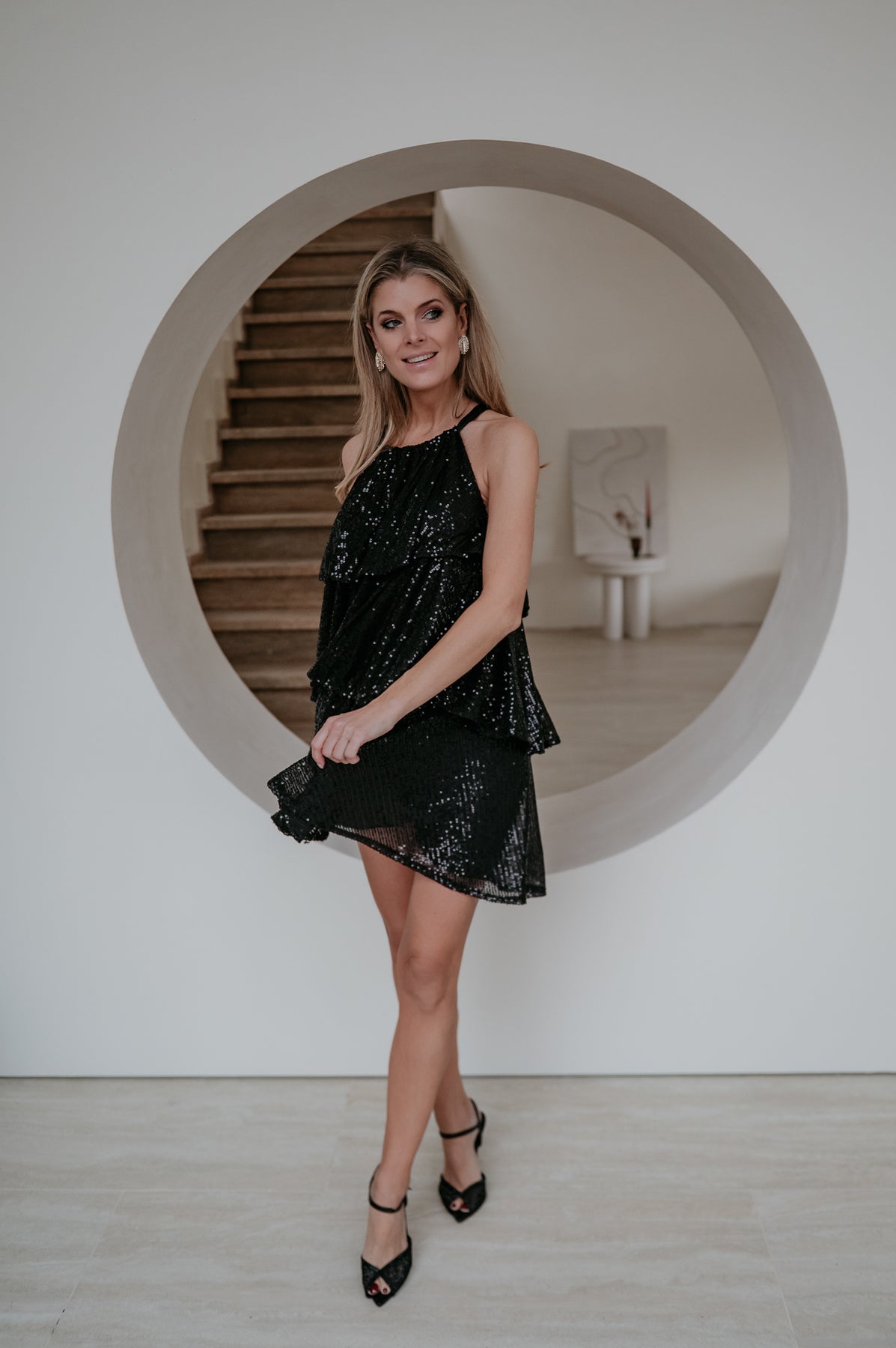 De glinsterende stof vangt het licht prachtig, waardoor je direct in de spotlights staat. Het zwierige ontwerp geeft het kleed een speelse en vrouwelijke uitstraling, ideaal voor feestelijke gelegenheden zoals een gala, bruiloft of een avondje uit.