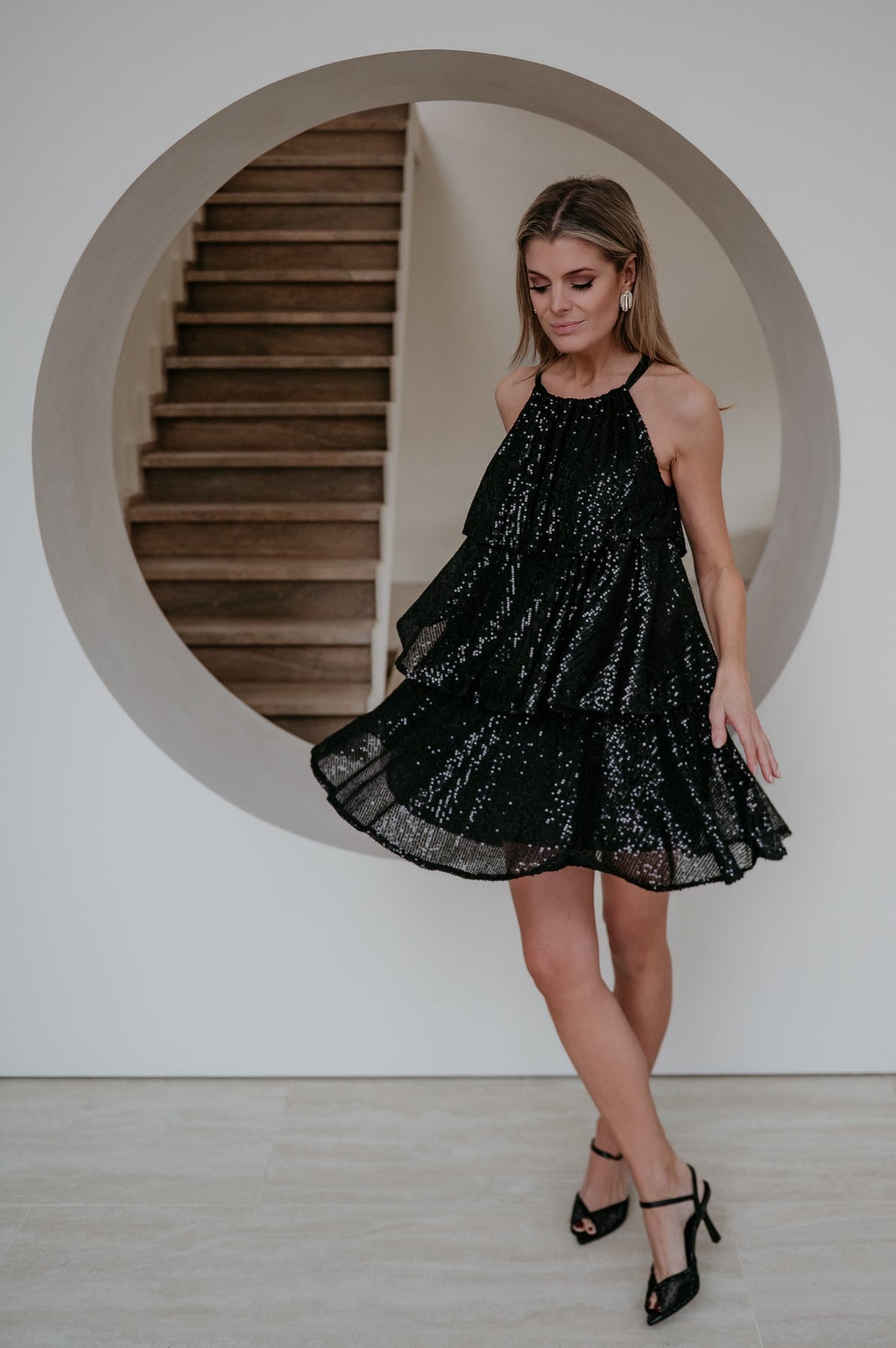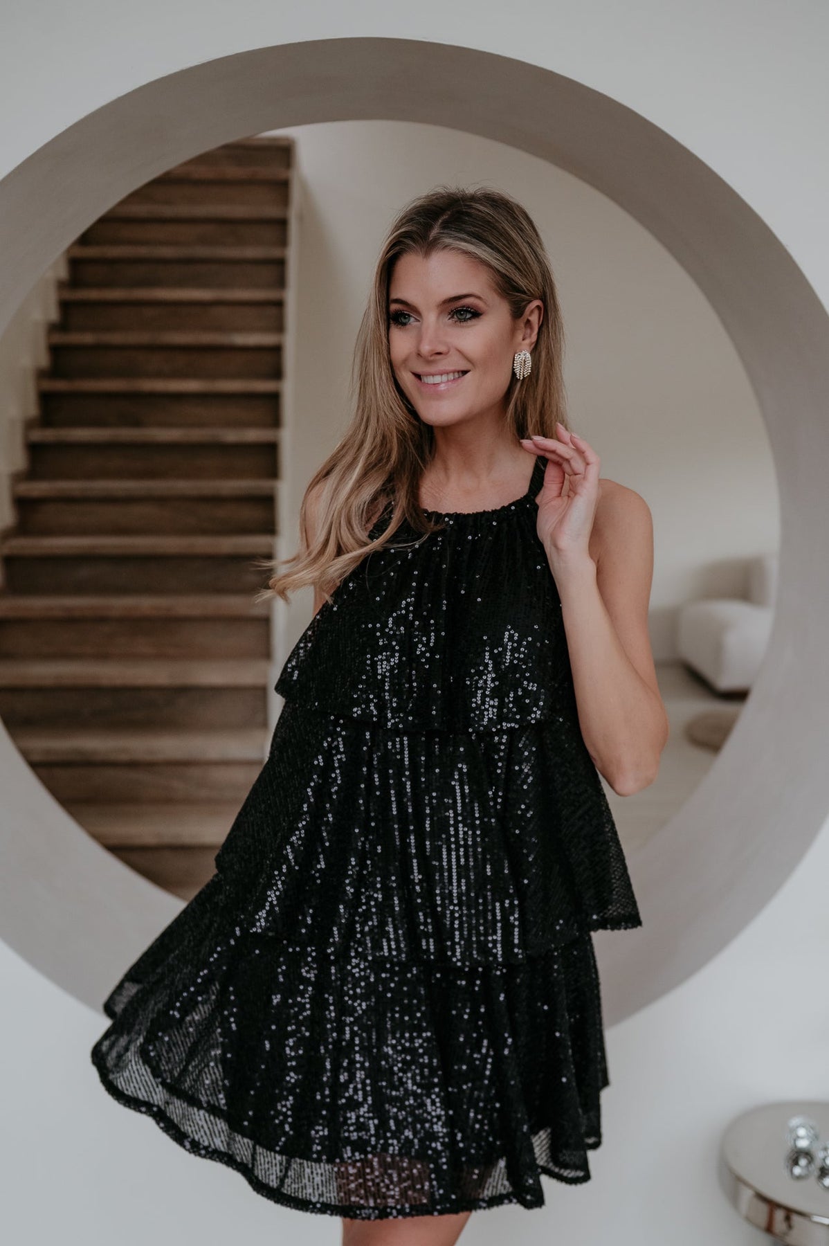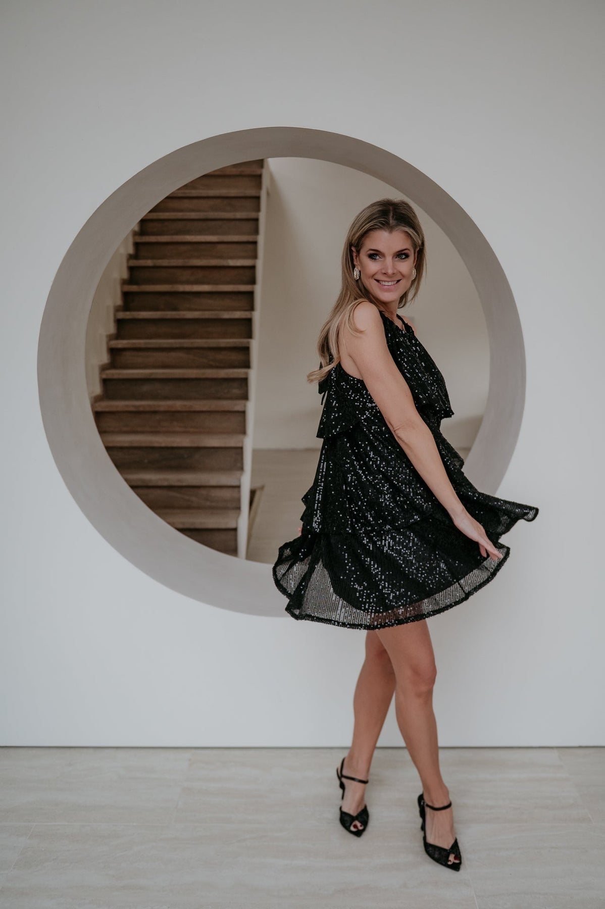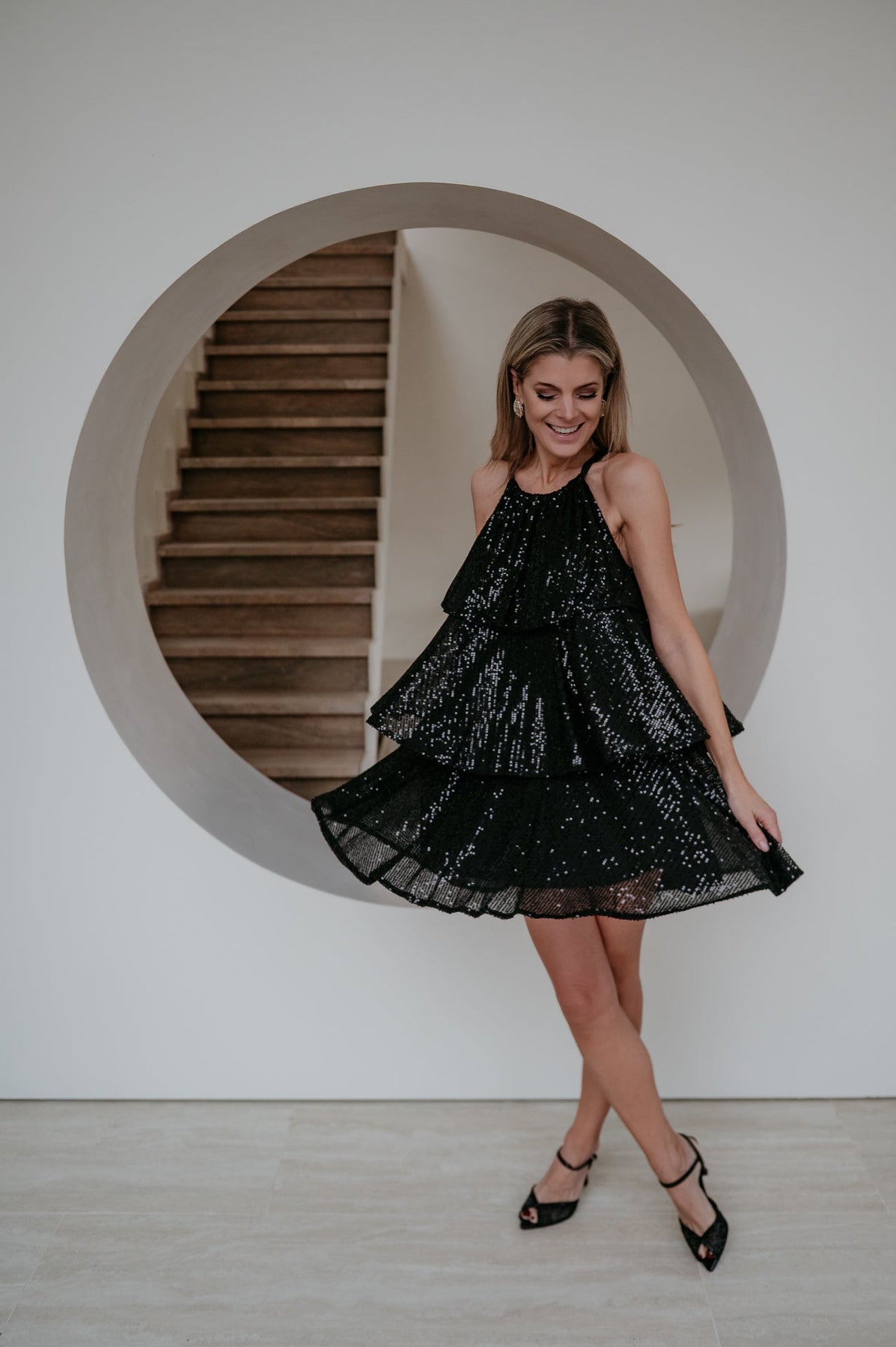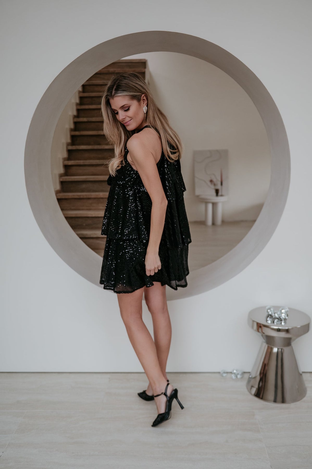 De glinsterende stof vangt het licht prachtig, waardoor je direct in de spotlights staat. Het zwierige ontwerp geeft het kleed een speelse en vrouwelijke uitstraling, ideaal voor feestelijke gelegenheden zoals een gala, bruiloft of een avondje uit.